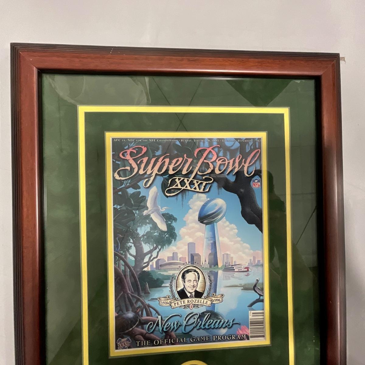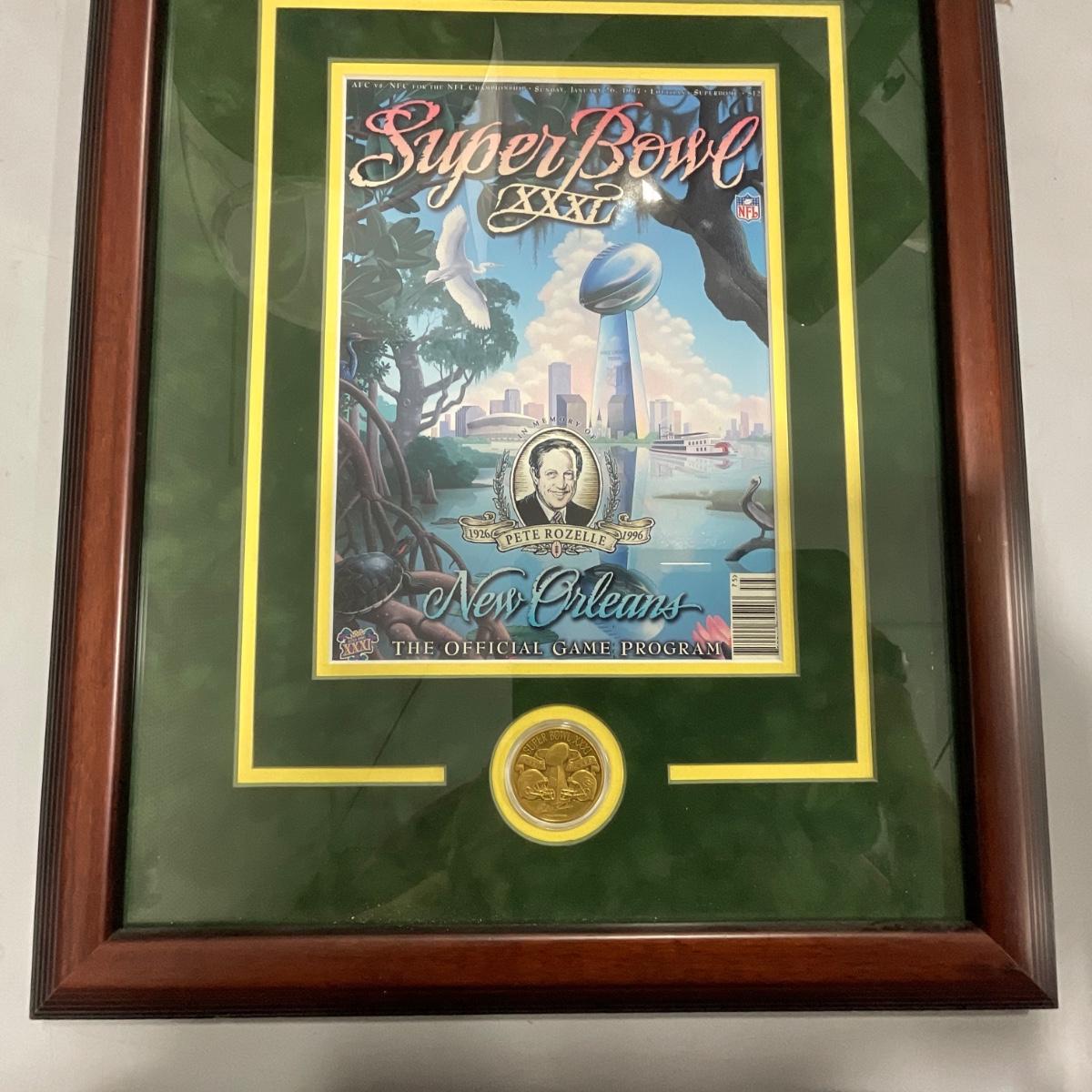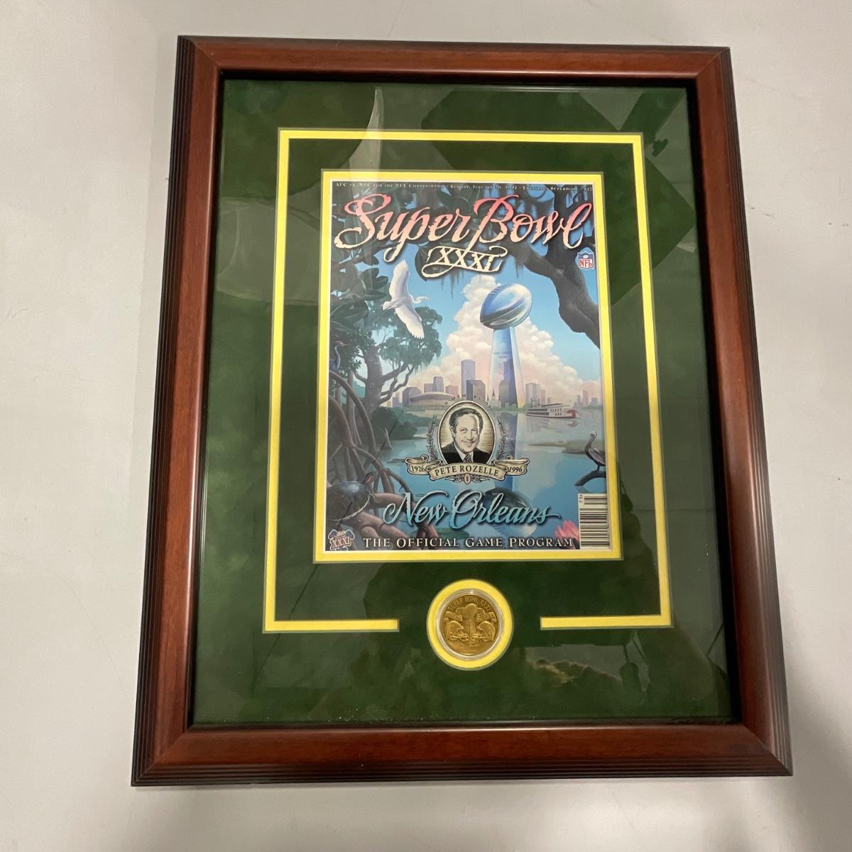 Professionally framed Green Bay Packers Super Bowl 31 program and coin. In great shape only a few slight scratches on the fame of this piece. 16.5 inches wide by 20.5 inches tall. Please see photos for details and condition. ::: Shipping is NOT available on this lot. If you have any questions regarding this lot please contact the auctioneer either via this website, by direct email or by phone. PICK UP TIMES and other important information can be found in the TERMS and DESCRIPTION of the auction. Please take a look for pertinent information. Thanks!