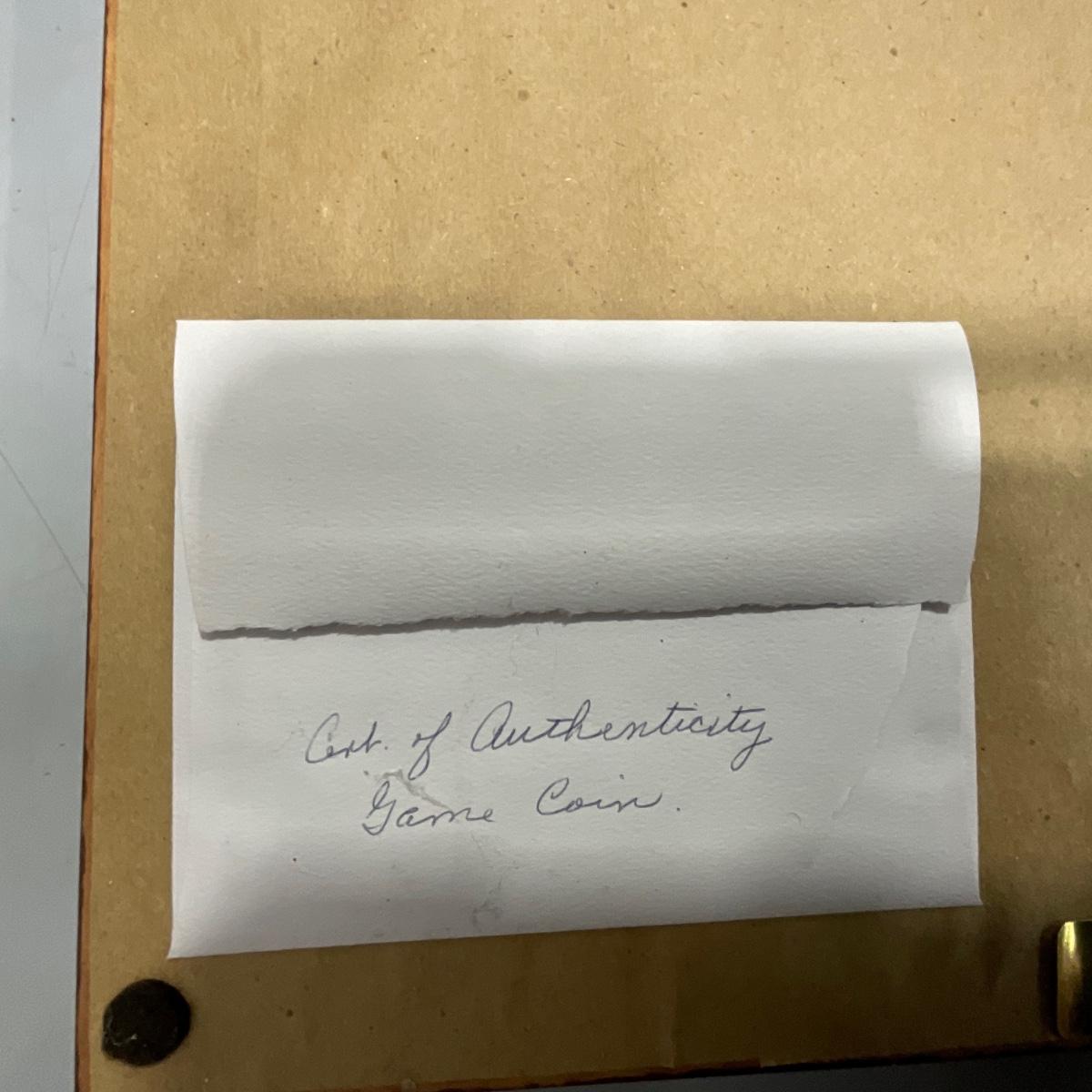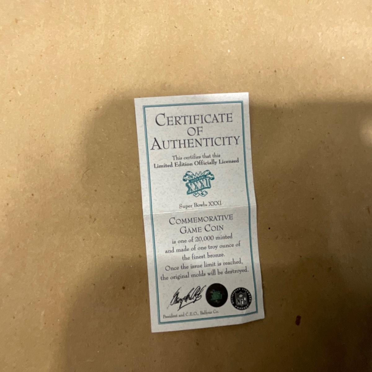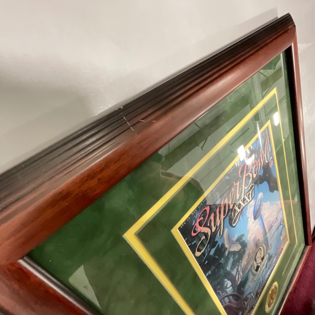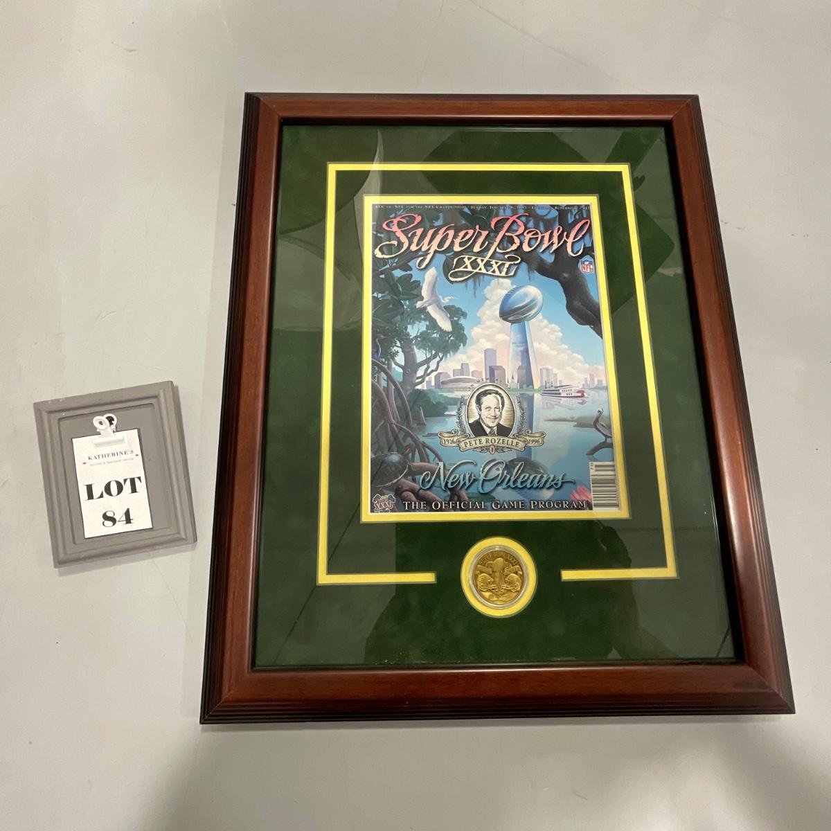 Professionally framed Green Bay Packers Super Bowl 31 program and coin. In great shape only a few slight scratches on the fame of this piece. 16.5 inches wide by 20.5 inches tall. Please see photos for details and condition. ::: Shipping is NOT available on this lot. If you have any questions regarding this lot please contact the auctioneer either via this website, by direct email or by phone. PICK UP TIMES and other important information can be found in the TERMS and DESCRIPTION of the auction. Please take a look for pertinent information. Thanks!