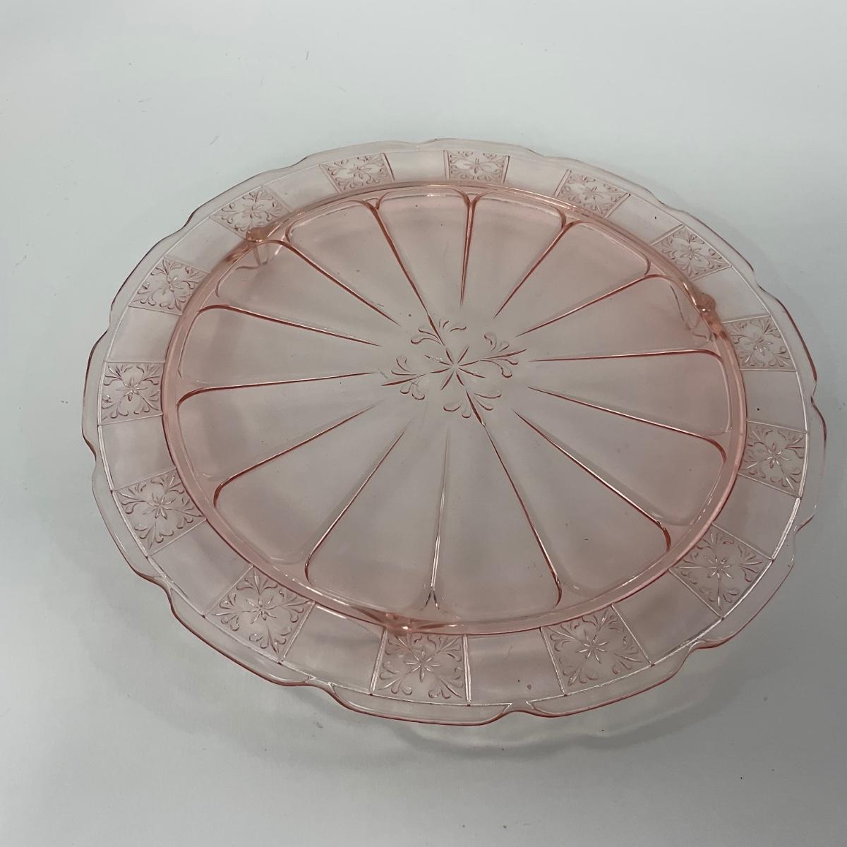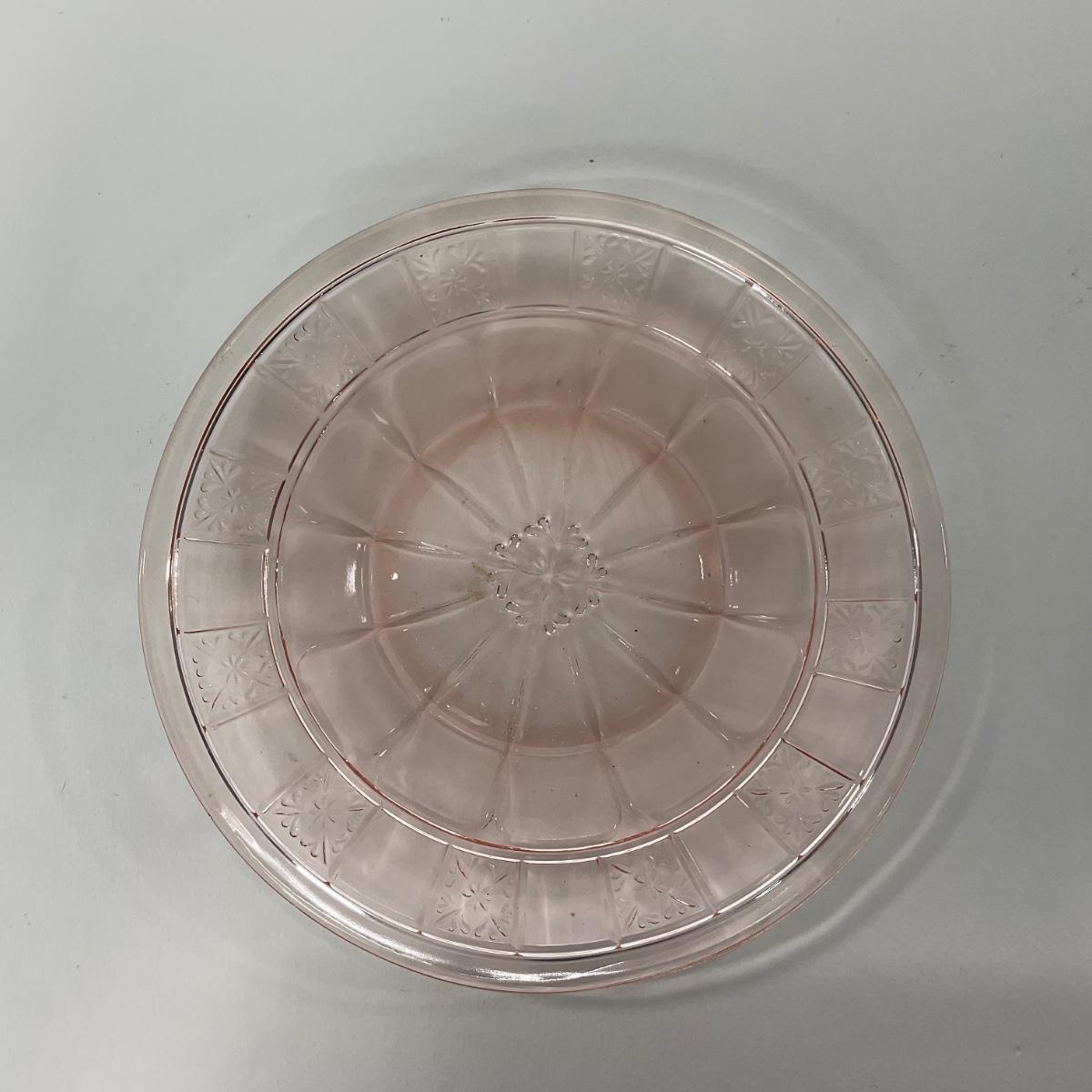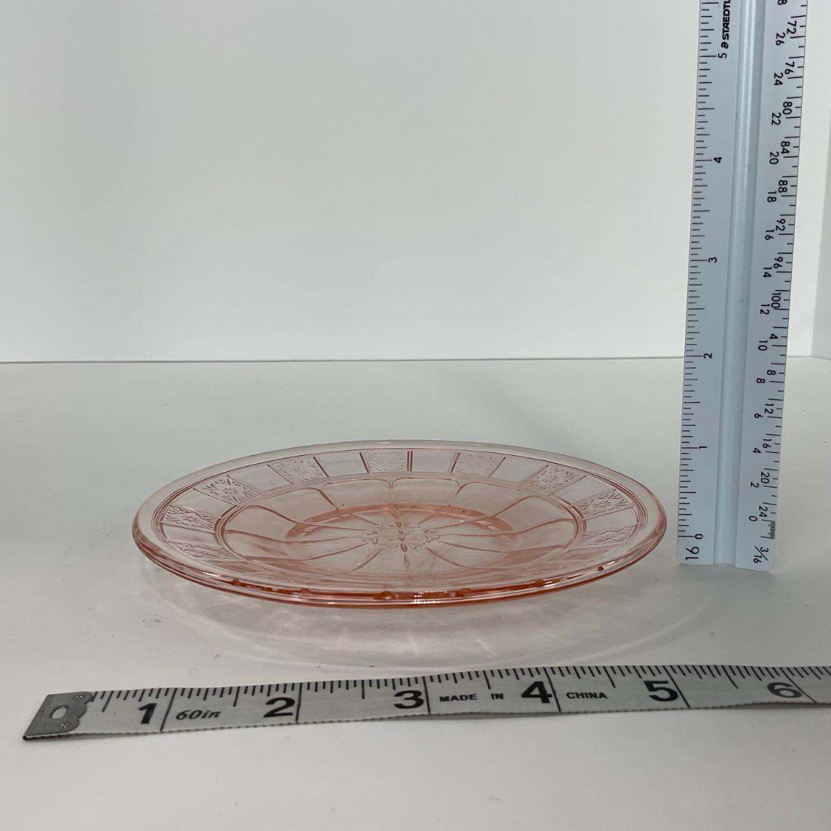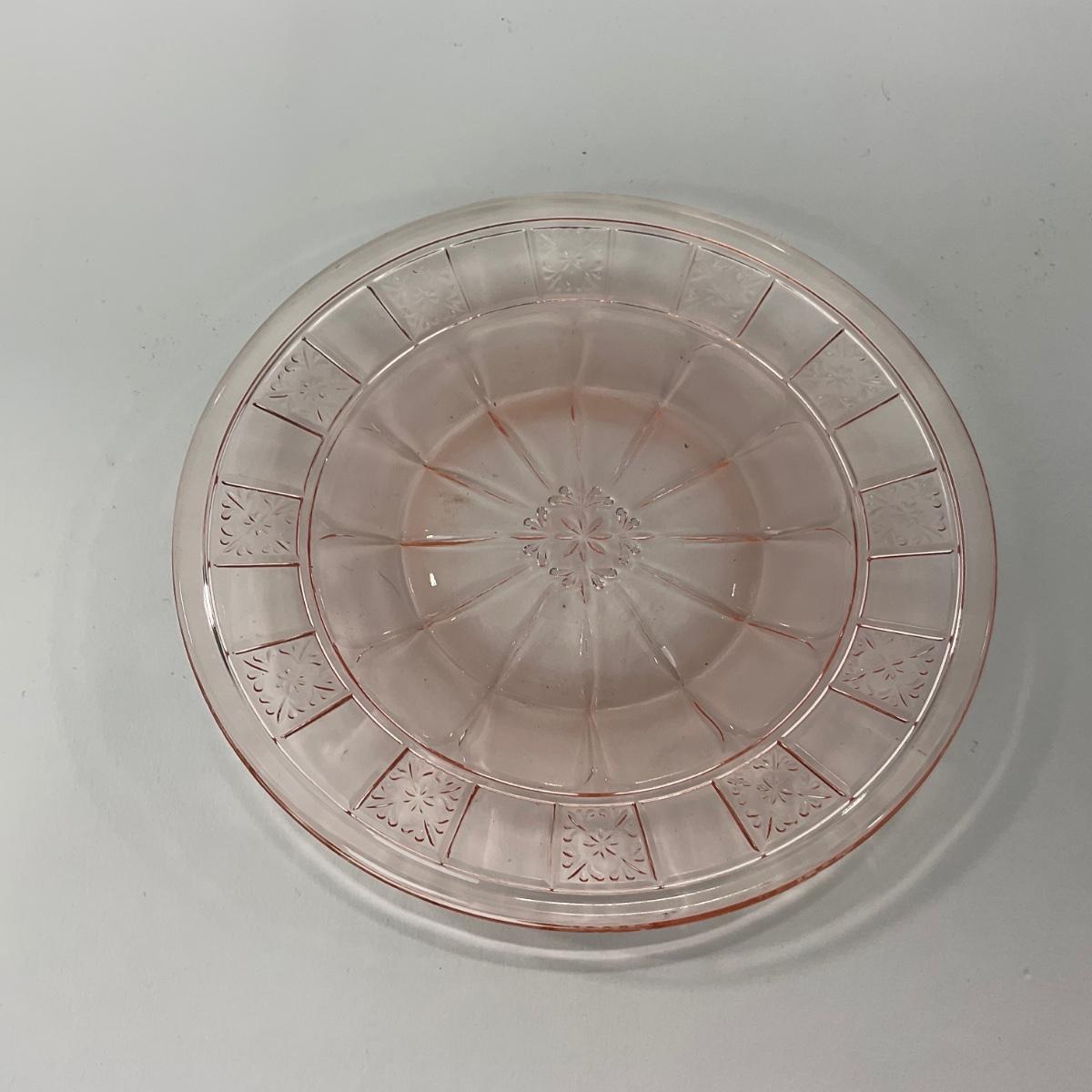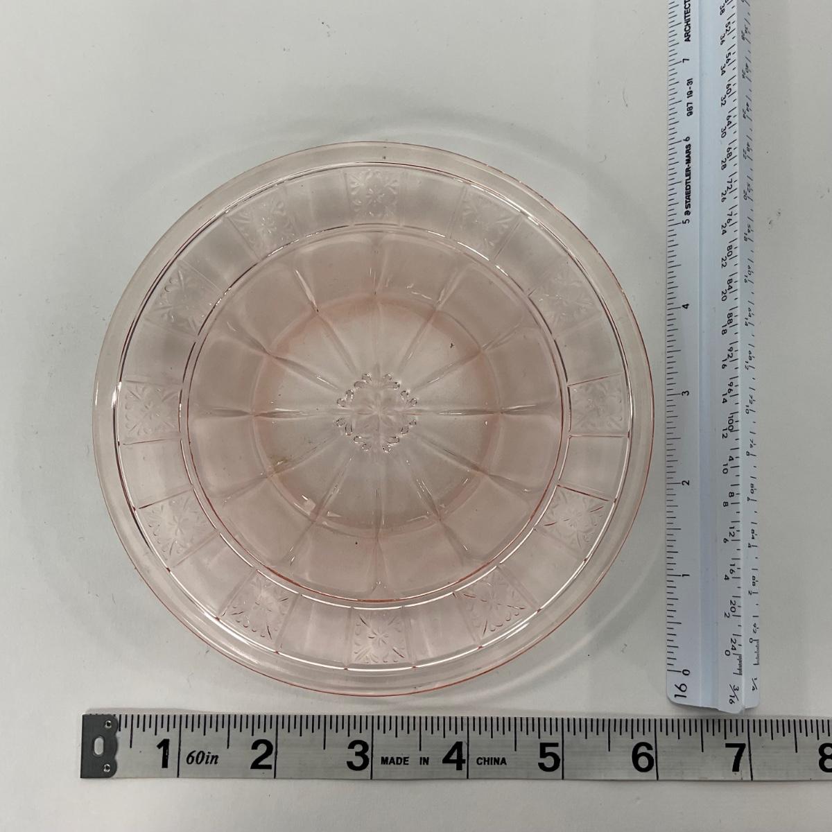 Six Doric Jeanette Glass Co. pink depression pieces including one large footed cake plate, three small plates, and two sherbets. Please see photos for details and condition. ::: Shipping is available on this lot. If you require shipping you must let us know at the close of the auction. We will coordinate with you after the item has been won. Shipping fees will include insurance up to or exceeding the value of all items being mailed. If you have any questions regarding this lot please contact the auctioneer either via this website, by direct email or by phone. PICK UP TIMES and other important information can be found in the TERMS and DESCRIPTION of the auction. Please take a look for pertinent information. Thanks!