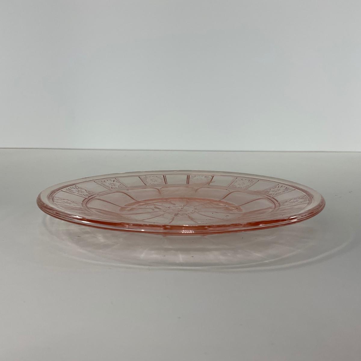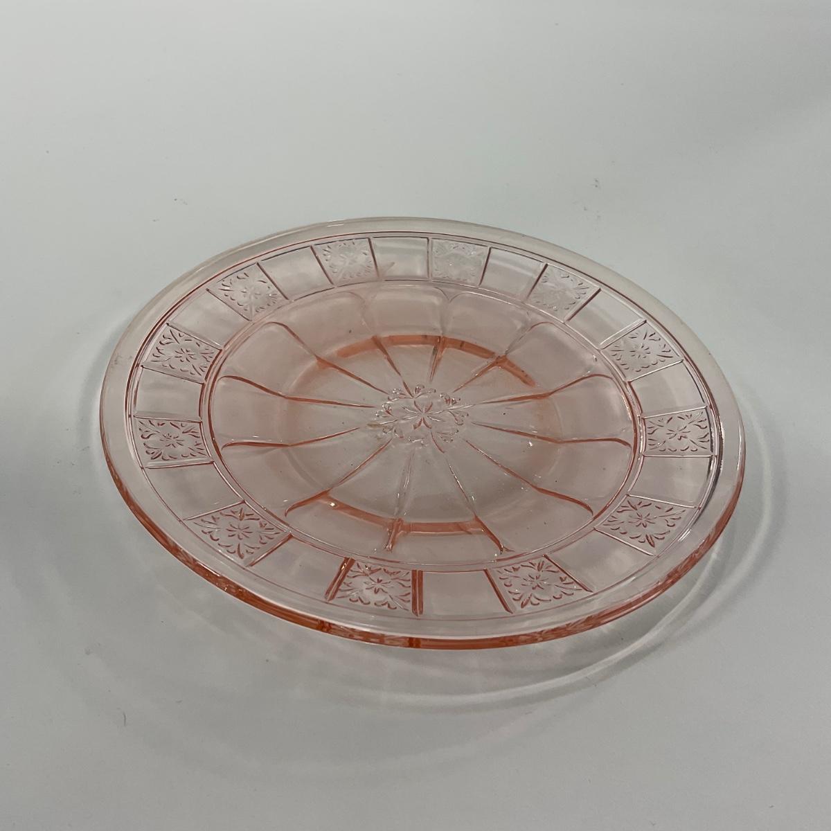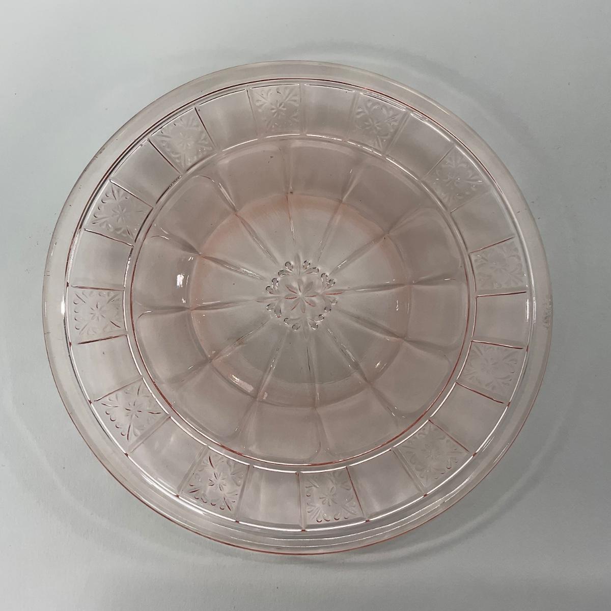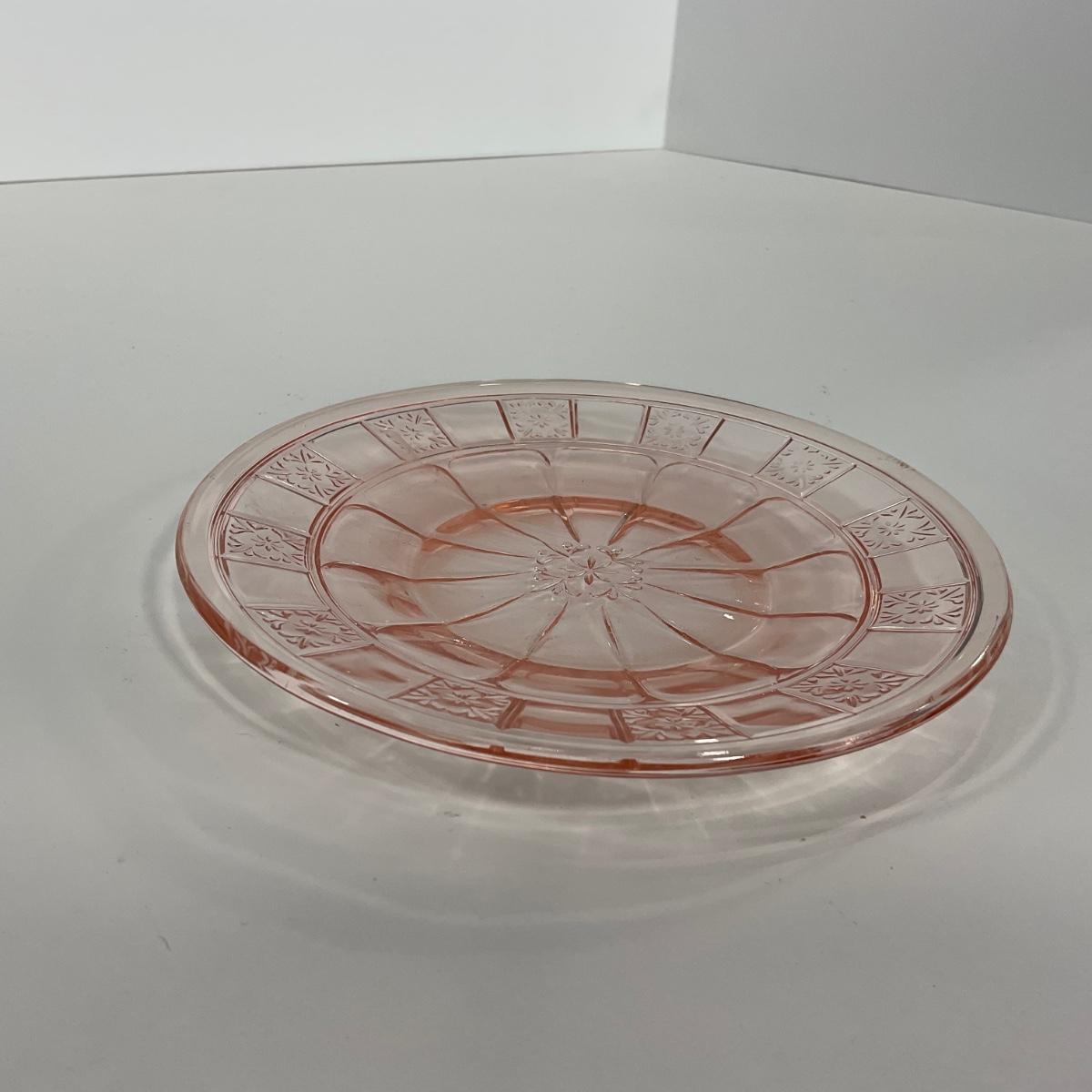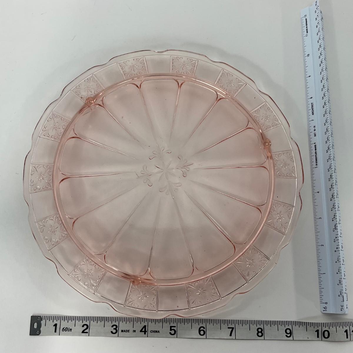 Six Doric Jeanette Glass Co. pink depression pieces including one large footed cake plate, three small plates, and two sherbets. Please see photos for details and condition. ::: Shipping is available on this lot. If you require shipping you must let us know at the close of the auction. We will coordinate with you after the item has been won. Shipping fees will include insurance up to or exceeding the value of all items being mailed. If you have any questions regarding this lot please contact the auctioneer either via this website, by direct email or by phone. PICK UP TIMES and other important information can be found in the TERMS and DESCRIPTION of the auction. Please take a look for pertinent information. Thanks!
