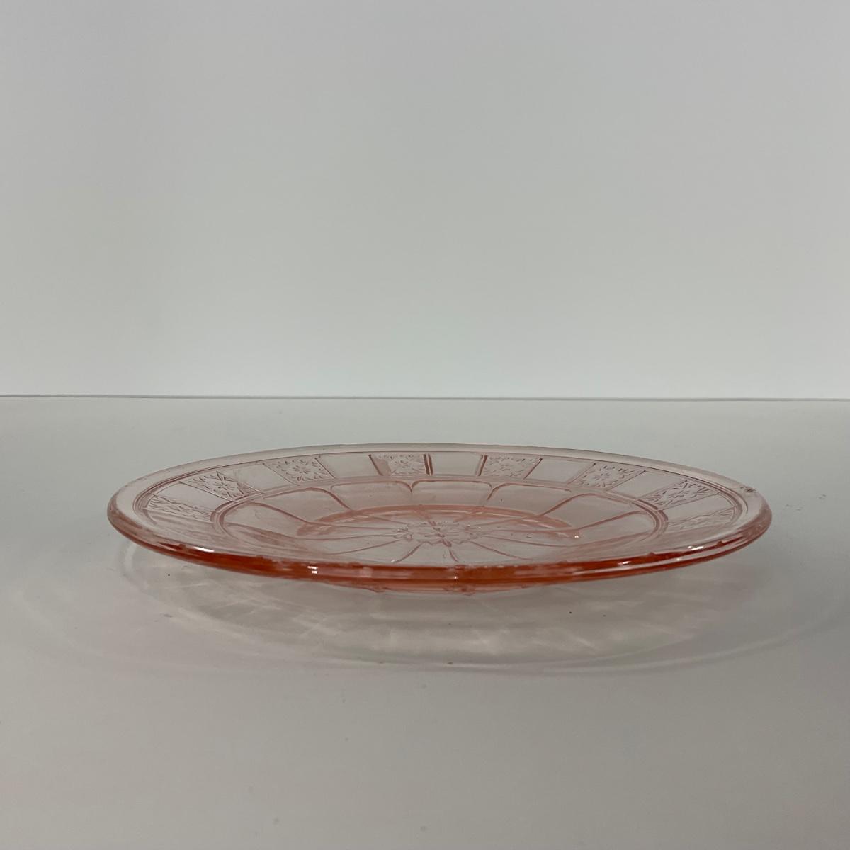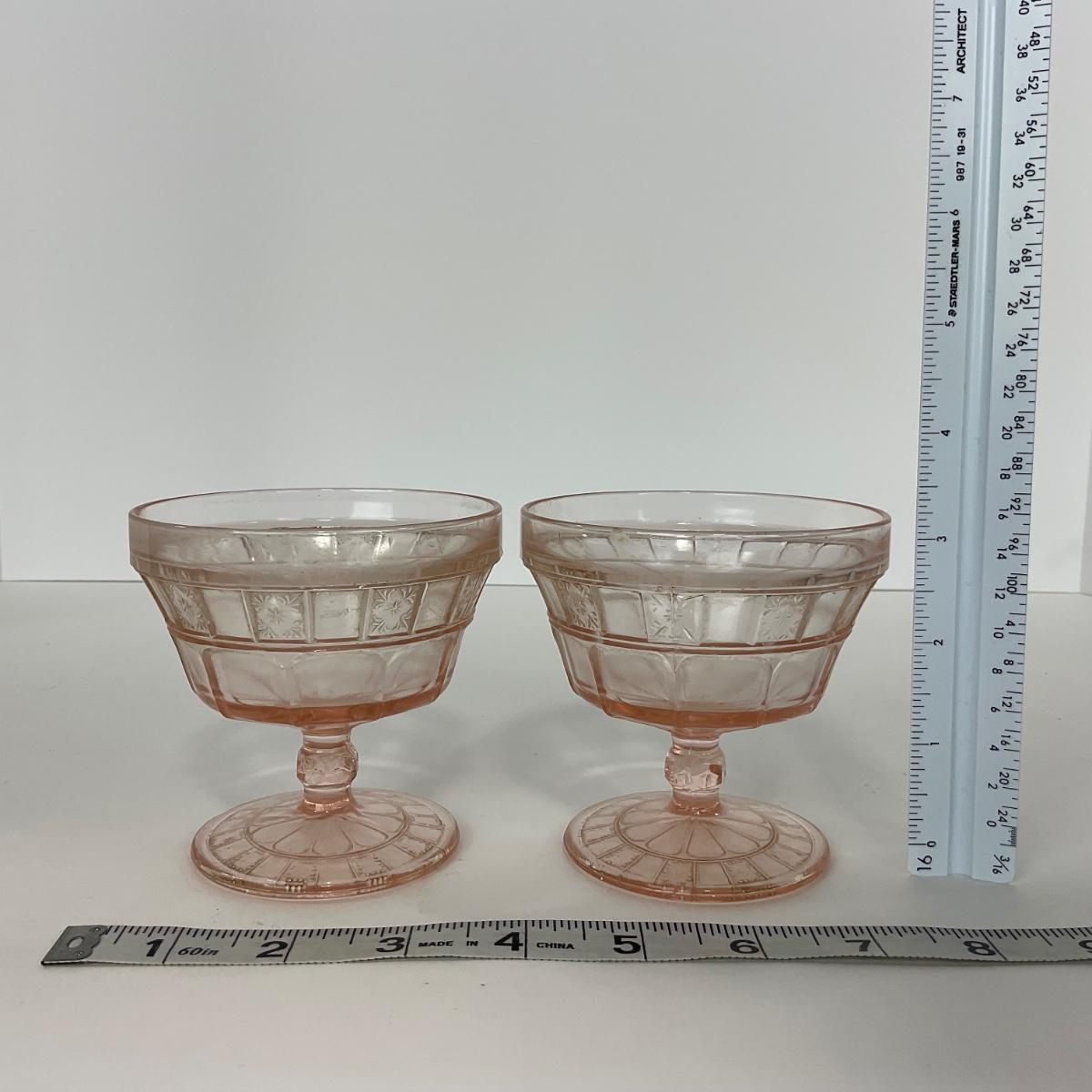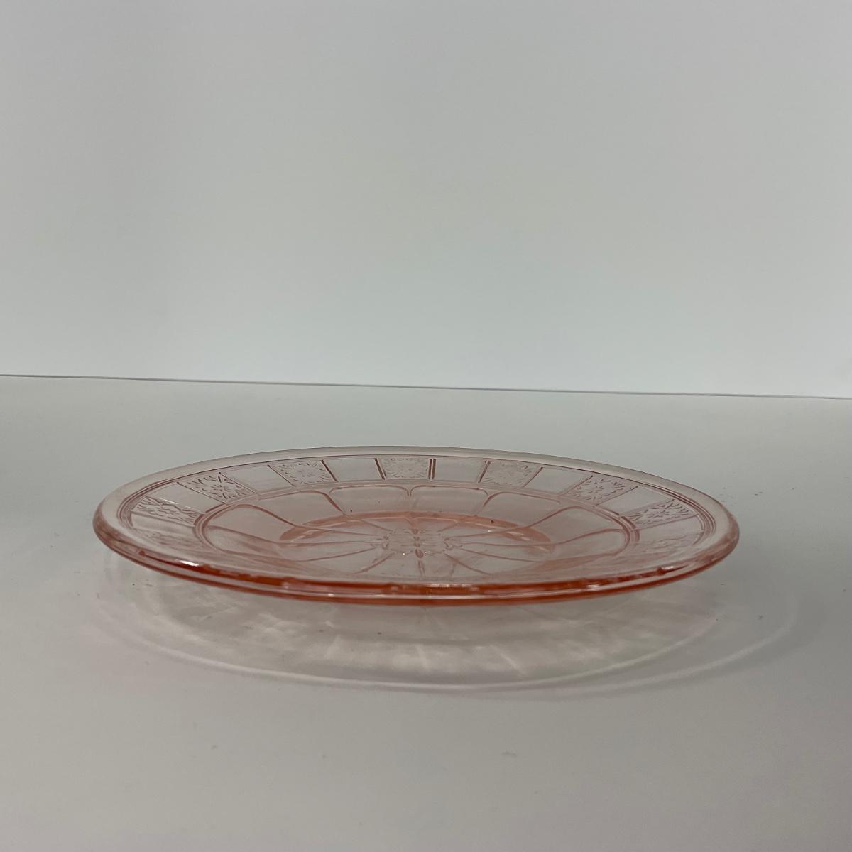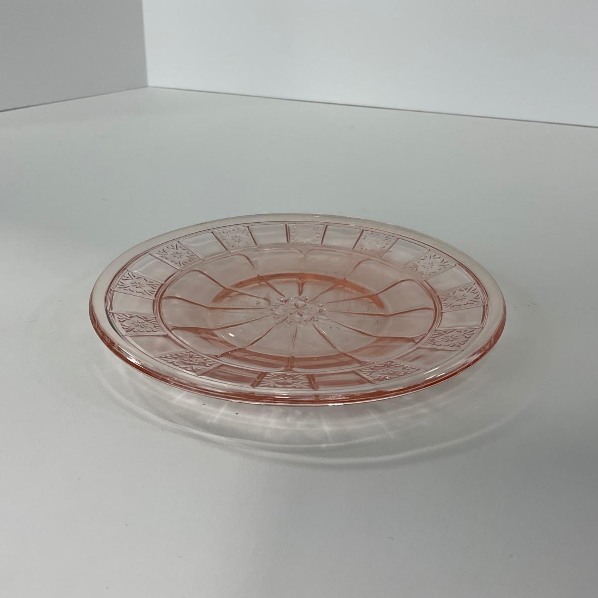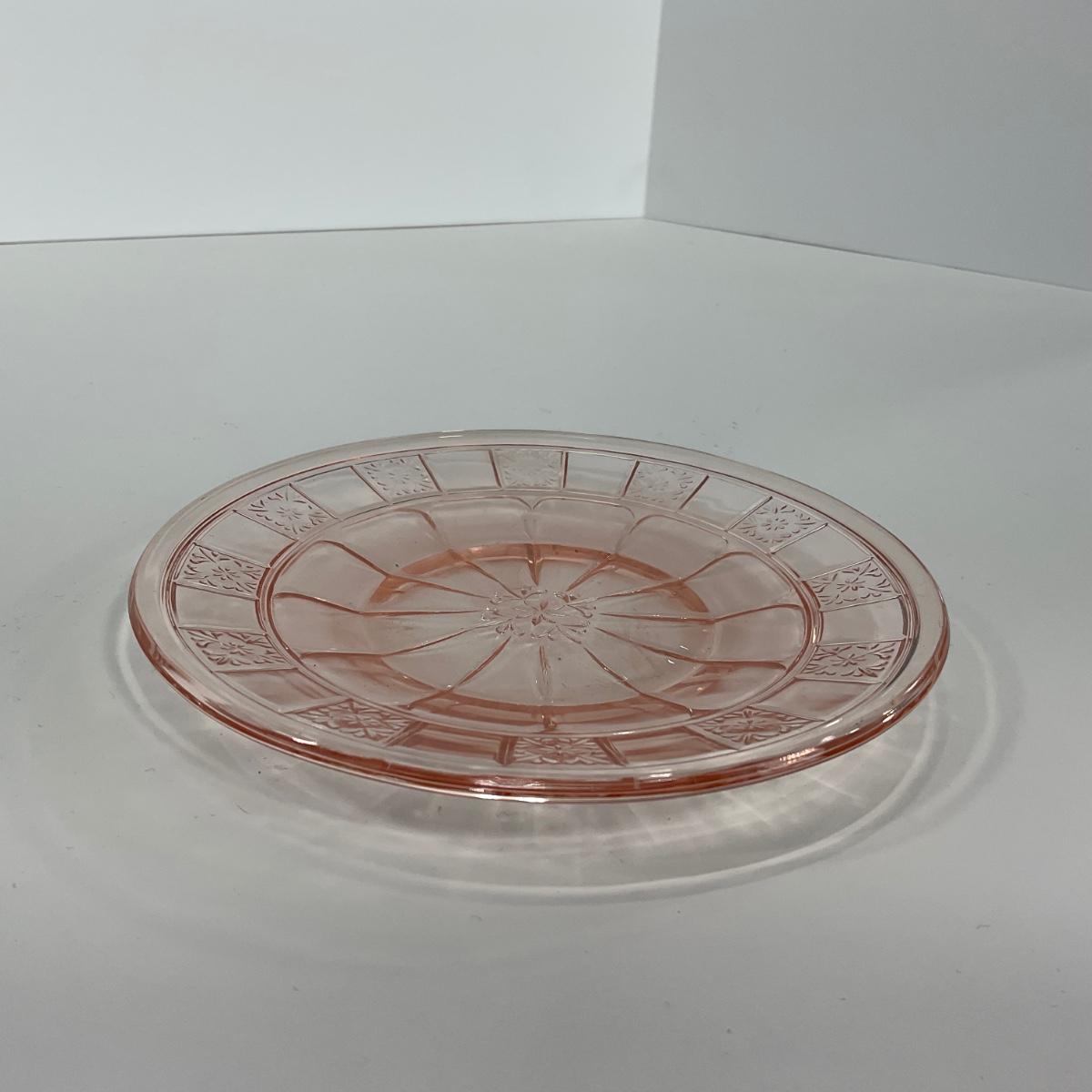 Six Doric Jeanette Glass Co. pink depression pieces including one large footed cake plate, three small plates, and two sherbets. Please see photos for details and condition. ::: Shipping is available on this lot. If you require shipping you must let us know at the close of the auction. We will coordinate with you after the item has been won. Shipping fees will include insurance up to or exceeding the value of all items being mailed. If you have any questions regarding this lot please contact the auctioneer either via this website, by direct email or by phone. PICK UP TIMES and other important information can be found in the TERMS and DESCRIPTION of the auction. Please take a look for pertinent information. Thanks!
