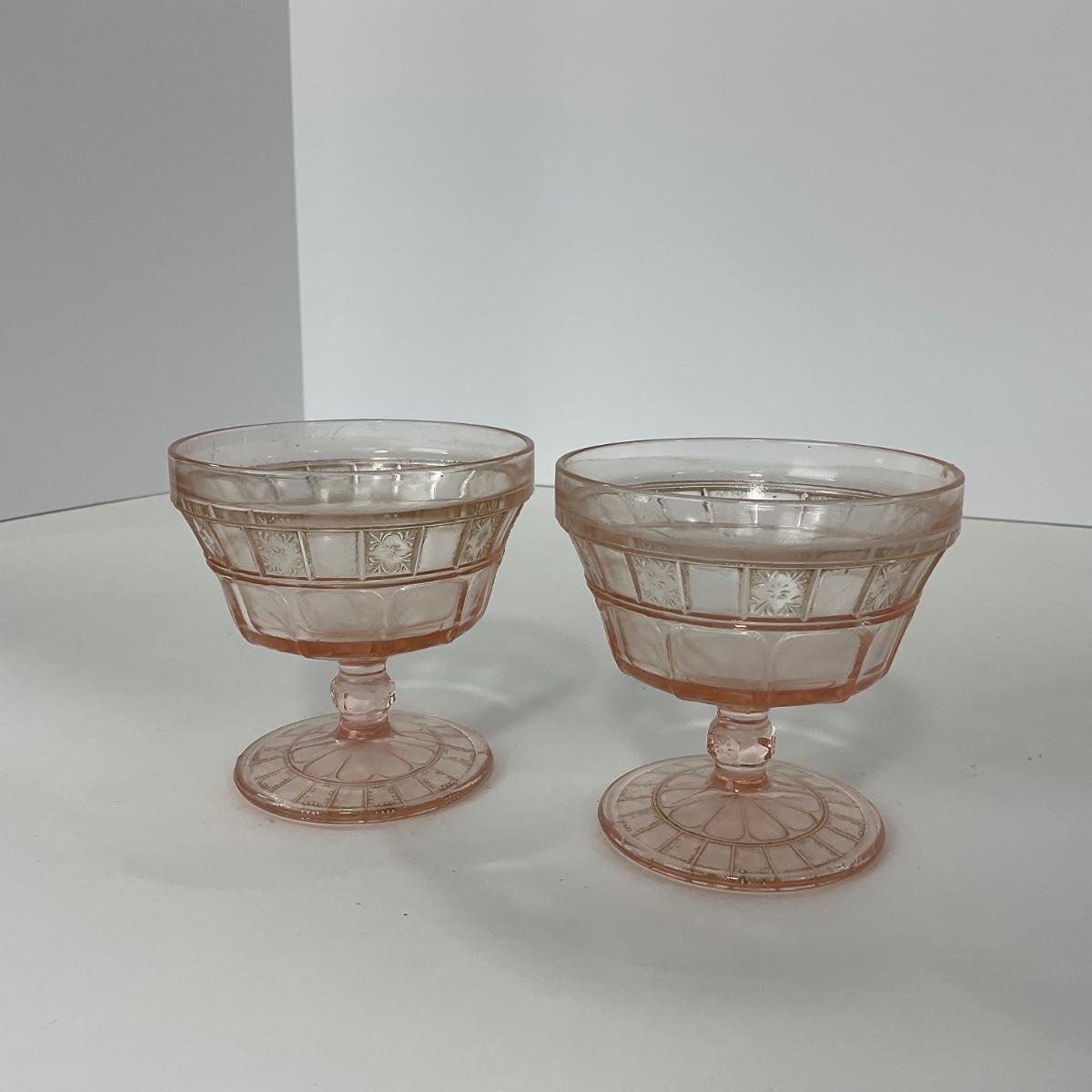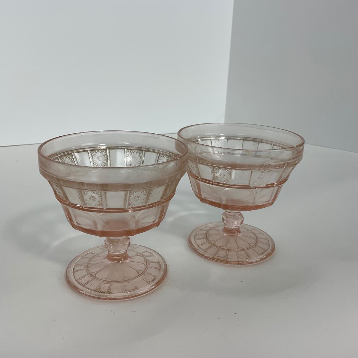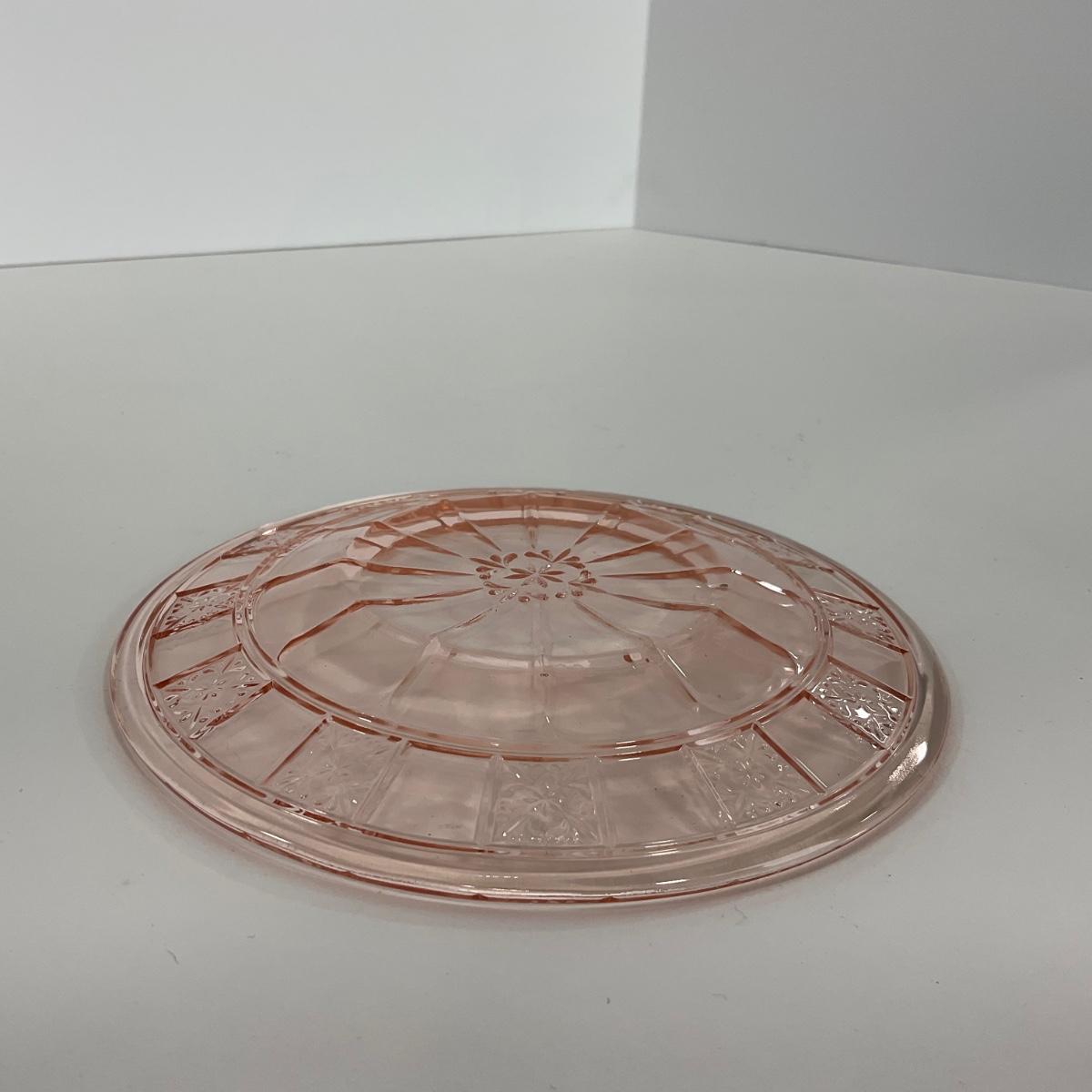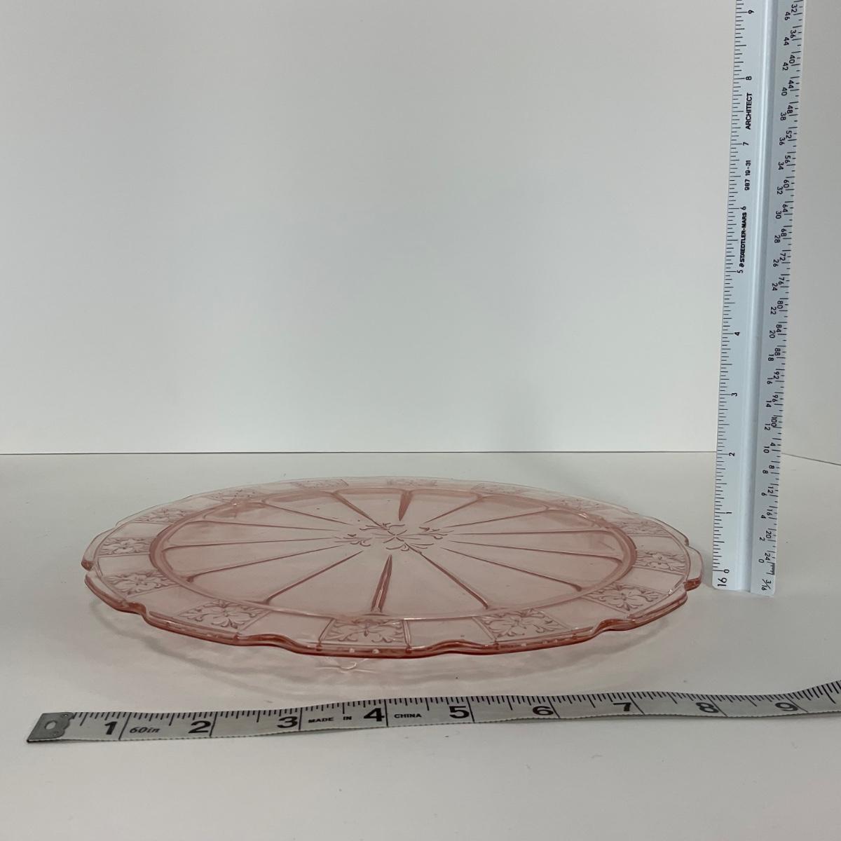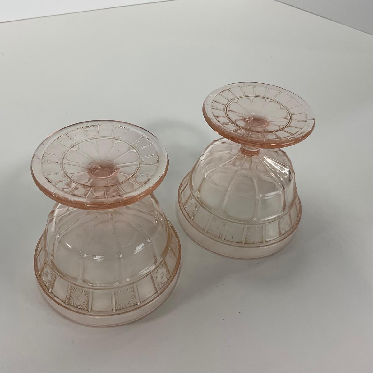 Six Doric Jeanette Glass Co. pink depression pieces including one large footed cake plate, three small plates, and two sherbets. Please see photos for details and condition. ::: Shipping is available on this lot. If you require shipping you must let us know at the close of the auction. We will coordinate with you after the item has been won. Shipping fees will include insurance up to or exceeding the value of all items being mailed. If you have any questions regarding this lot please contact the auctioneer either via this website, by direct email or by phone. PICK UP TIMES and other important information can be found in the TERMS and DESCRIPTION of the auction. Please take a look for pertinent information. Thanks!