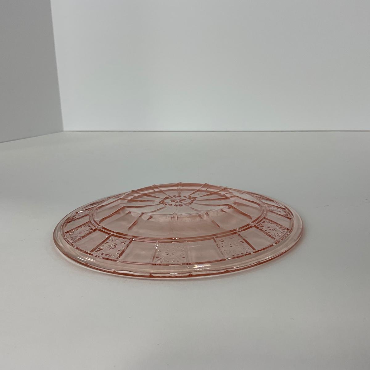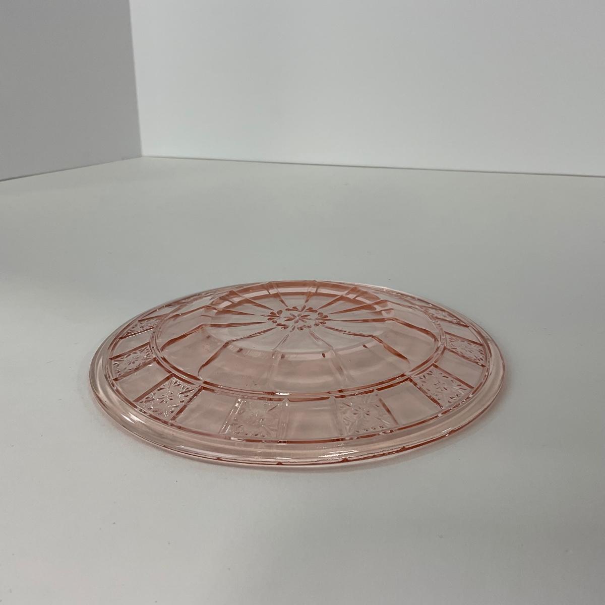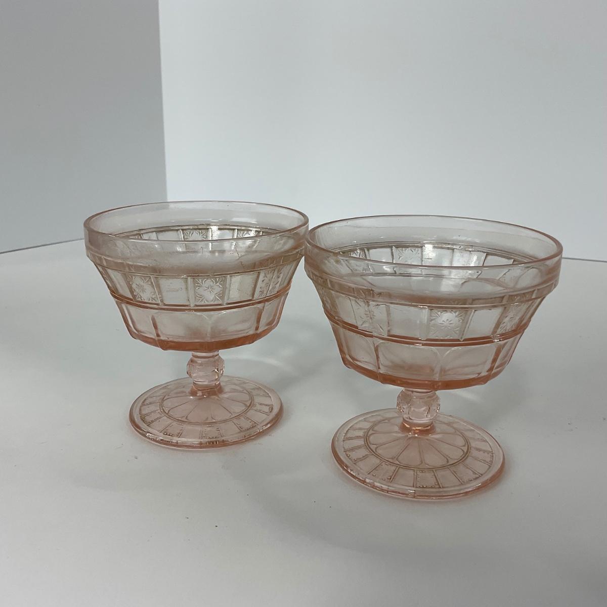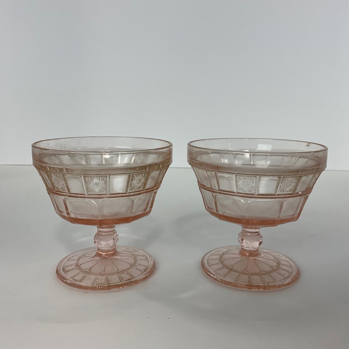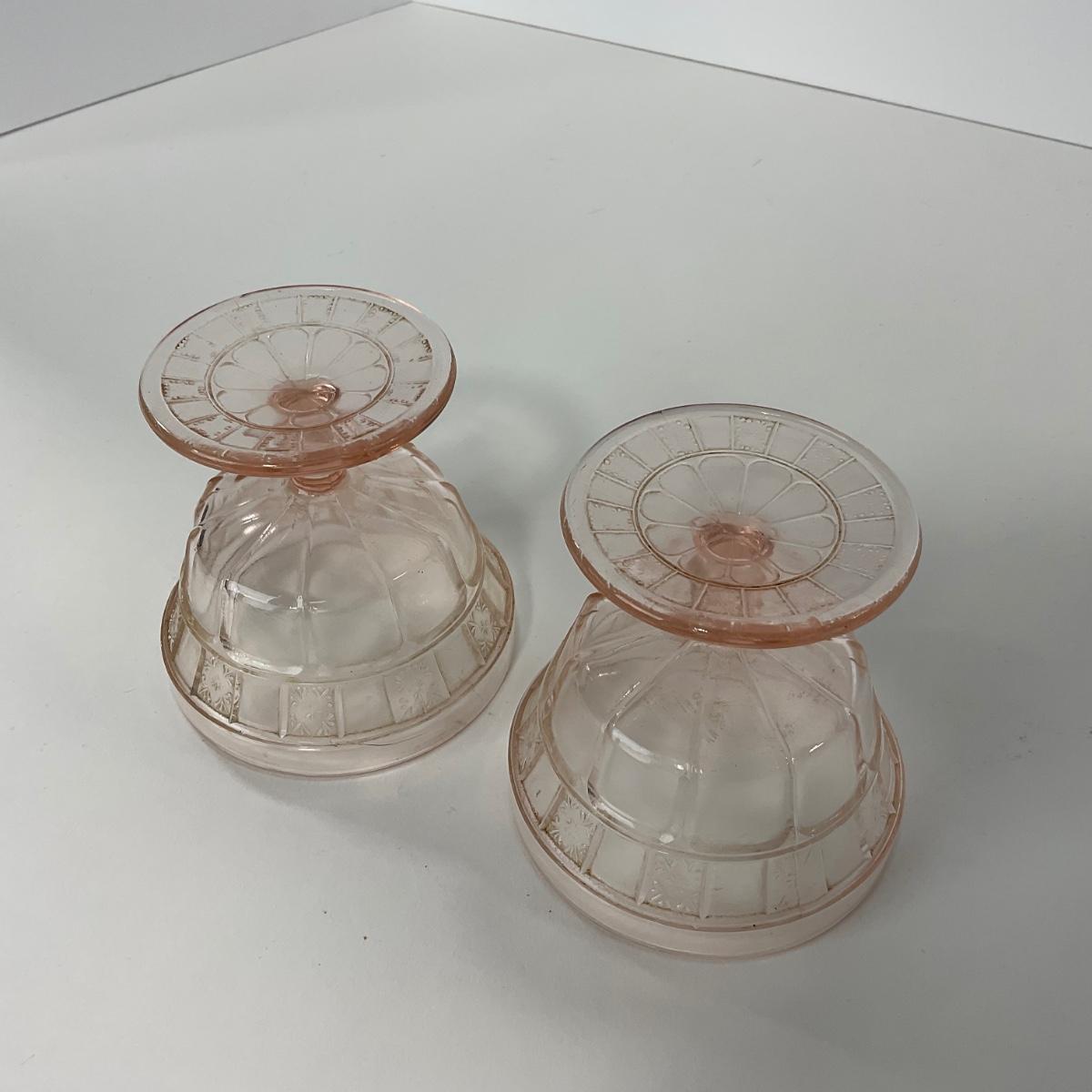 Six Doric Jeanette Glass Co. pink depression pieces including one large footed cake plate, three small plates, and two sherbets. Please see photos for details and condition. ::: Shipping is available on this lot. If you require shipping you must let us know at the close of the auction. We will coordinate with you after the item has been won. Shipping fees will include insurance up to or exceeding the value of all items being mailed. If you have any questions regarding this lot please contact the auctioneer either via this website, by direct email or by phone. PICK UP TIMES and other important information can be found in the TERMS and DESCRIPTION of the auction. Please take a look for pertinent information. Thanks!