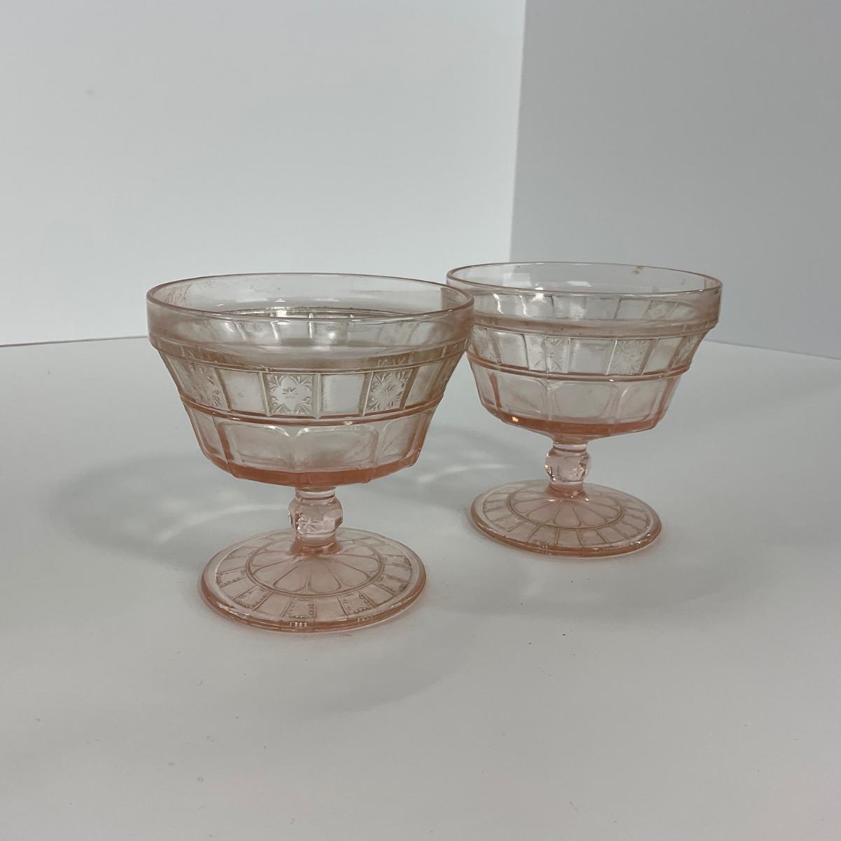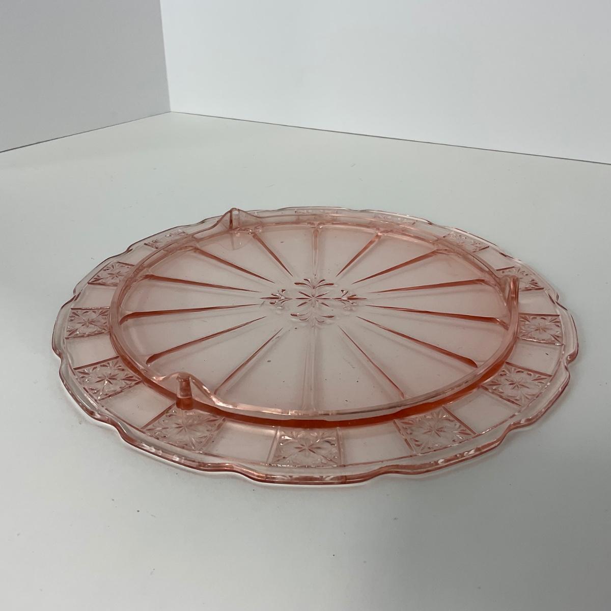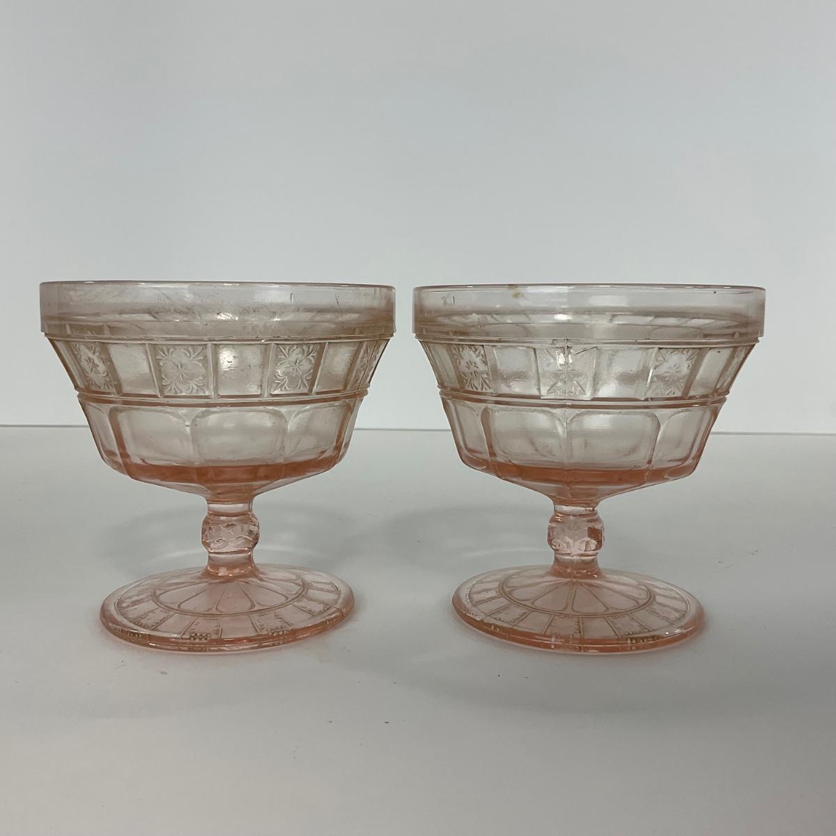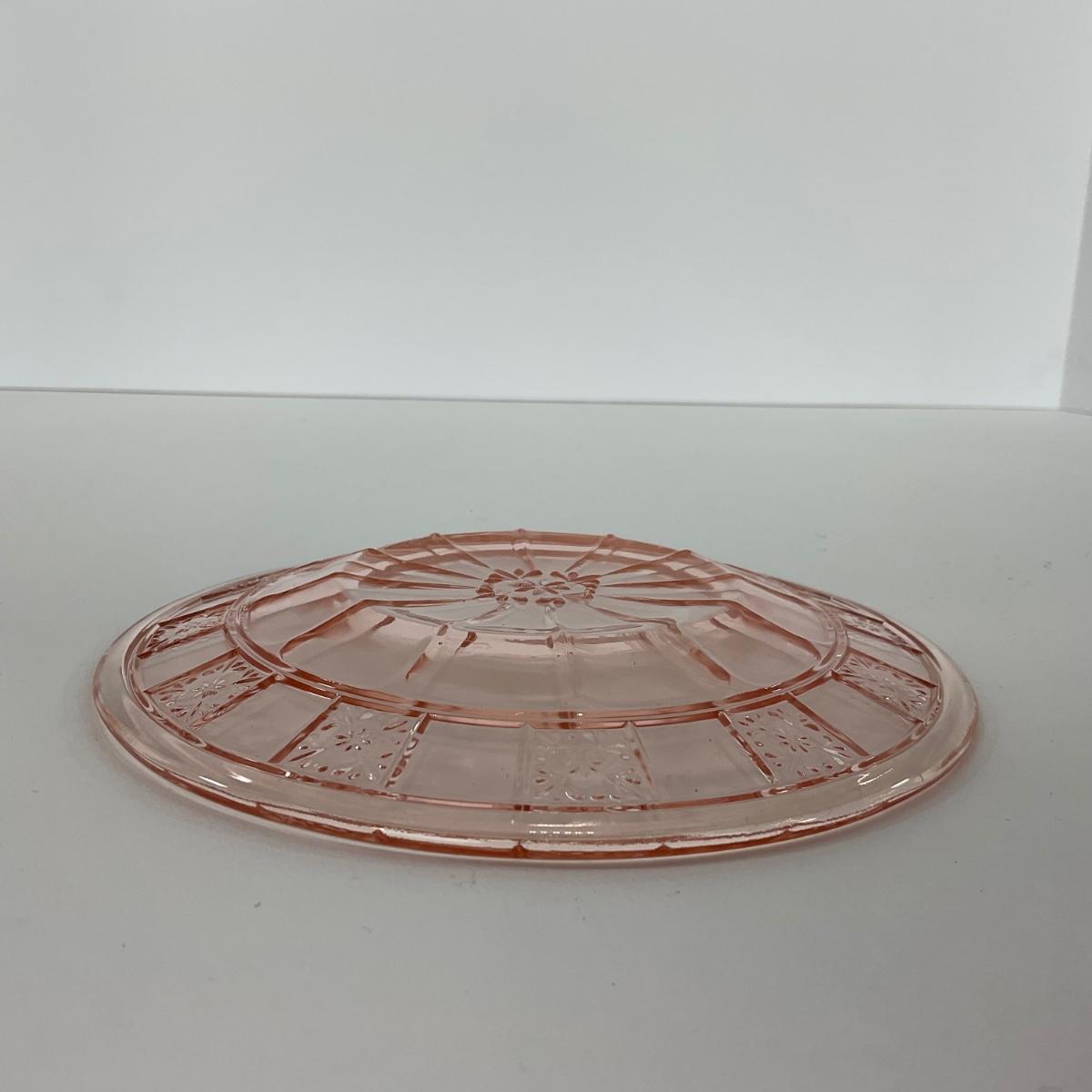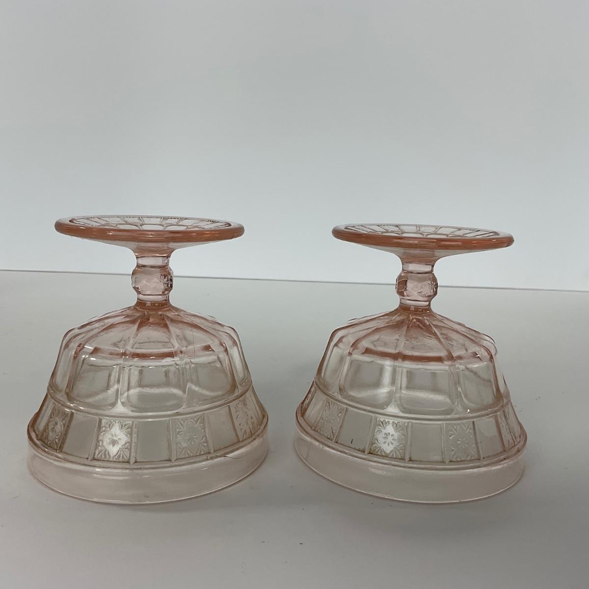 Six Doric Jeanette Glass Co. pink depression pieces including one large footed cake plate, three small plates, and two sherbets. Please see photos for details and condition. ::: Shipping is available on this lot. If you require shipping you must let us know at the close of the auction. We will coordinate with you after the item has been won. Shipping fees will include insurance up to or exceeding the value of all items being mailed. If you have any questions regarding this lot please contact the auctioneer either via this website, by direct email or by phone. PICK UP TIMES and other important information can be found in the TERMS and DESCRIPTION of the auction. Please take a look for pertinent information. Thanks!