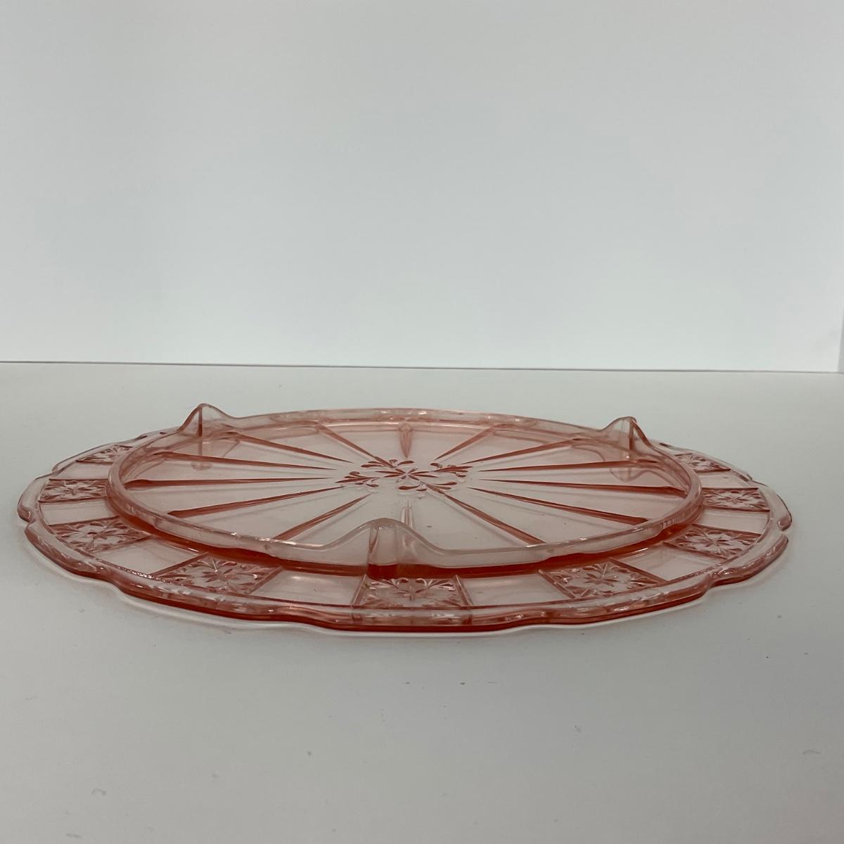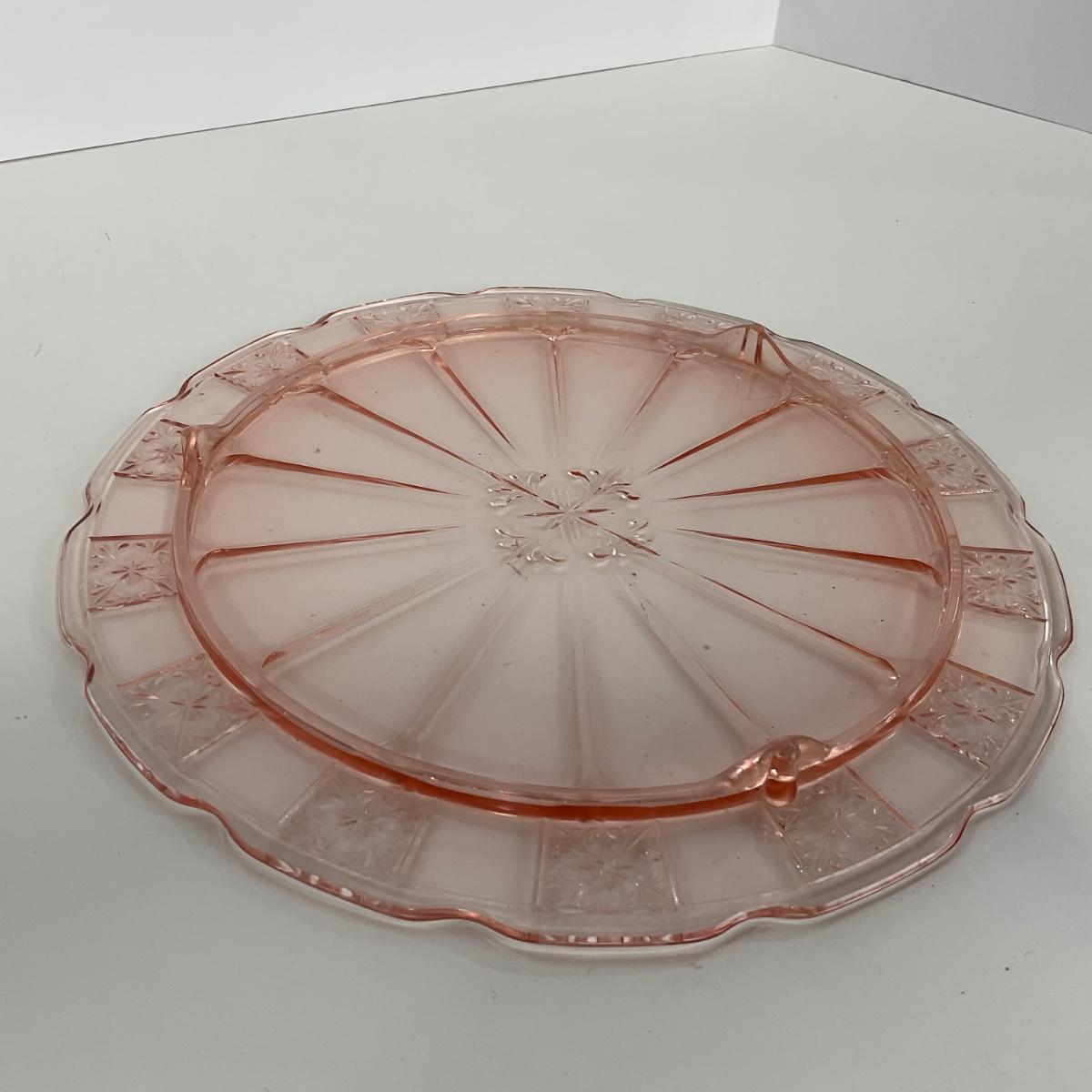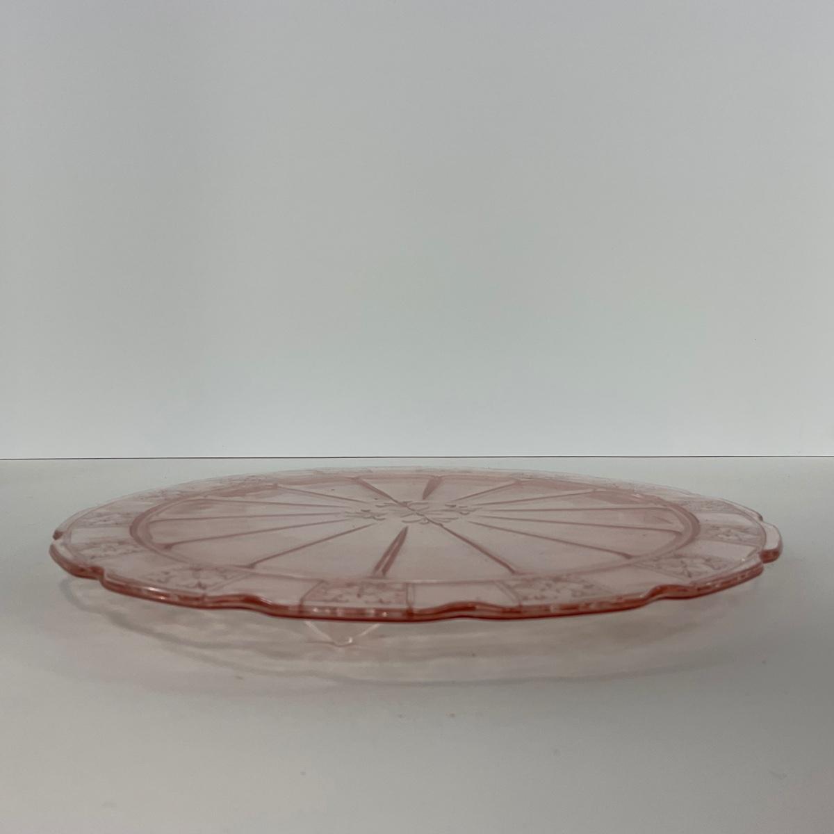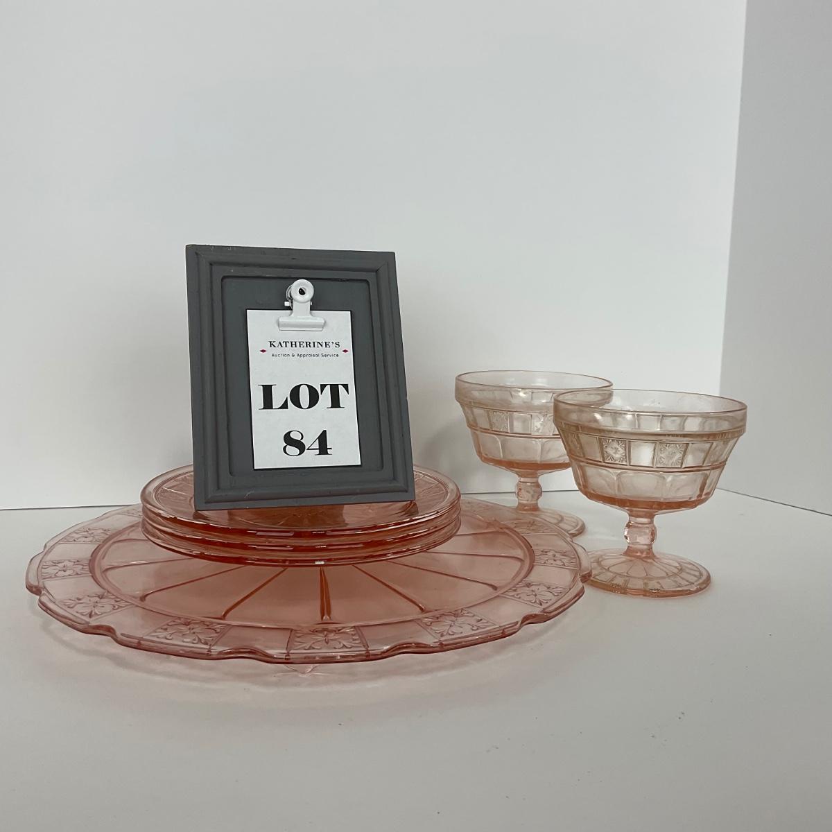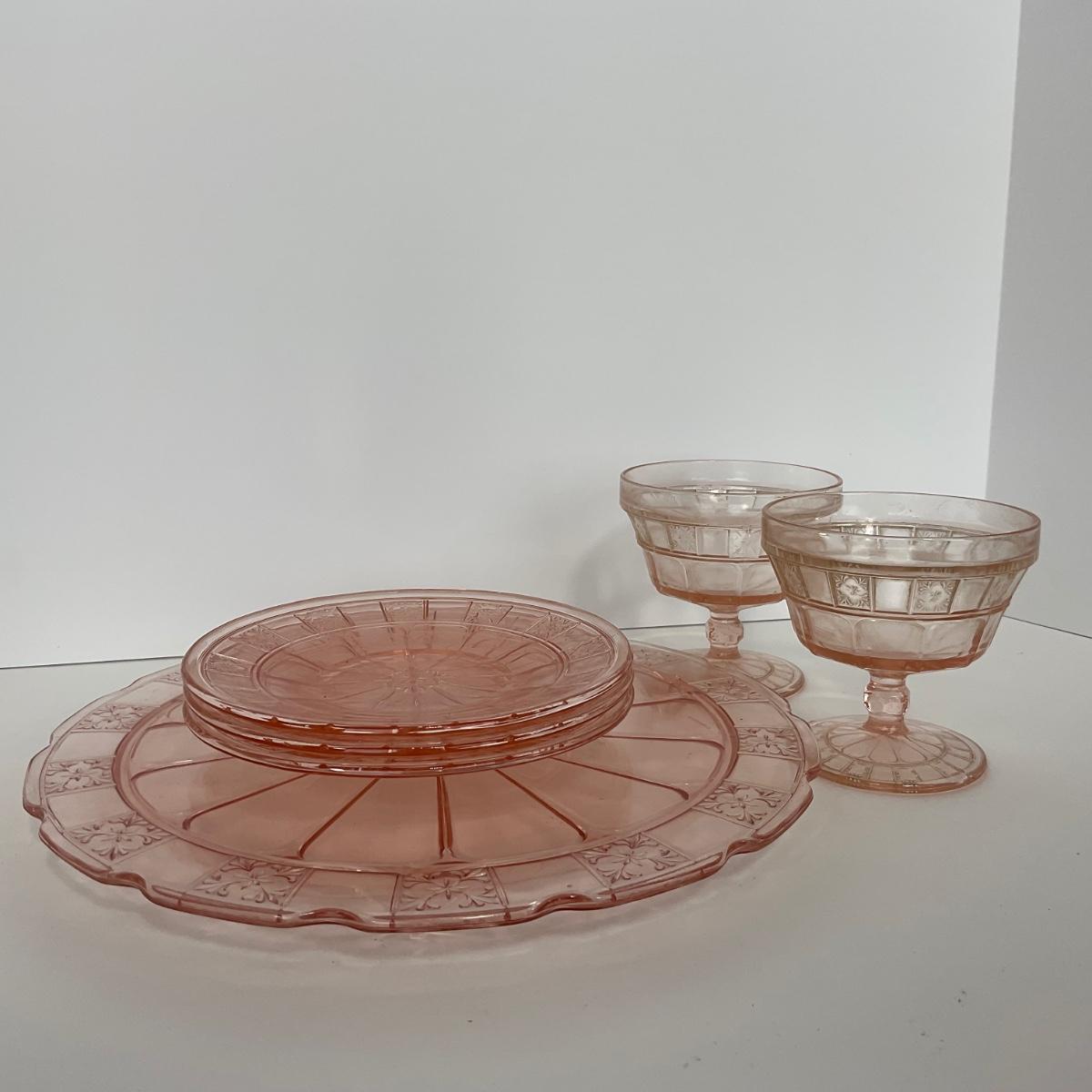 -84- GLASSWARE | Doric Jeanette Glass Co. | Pink Depression Footed Cake Plate, Small Plates, & Sherbet