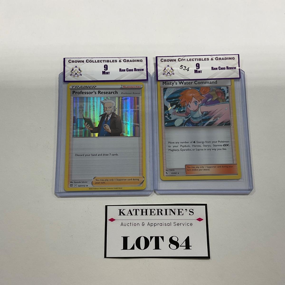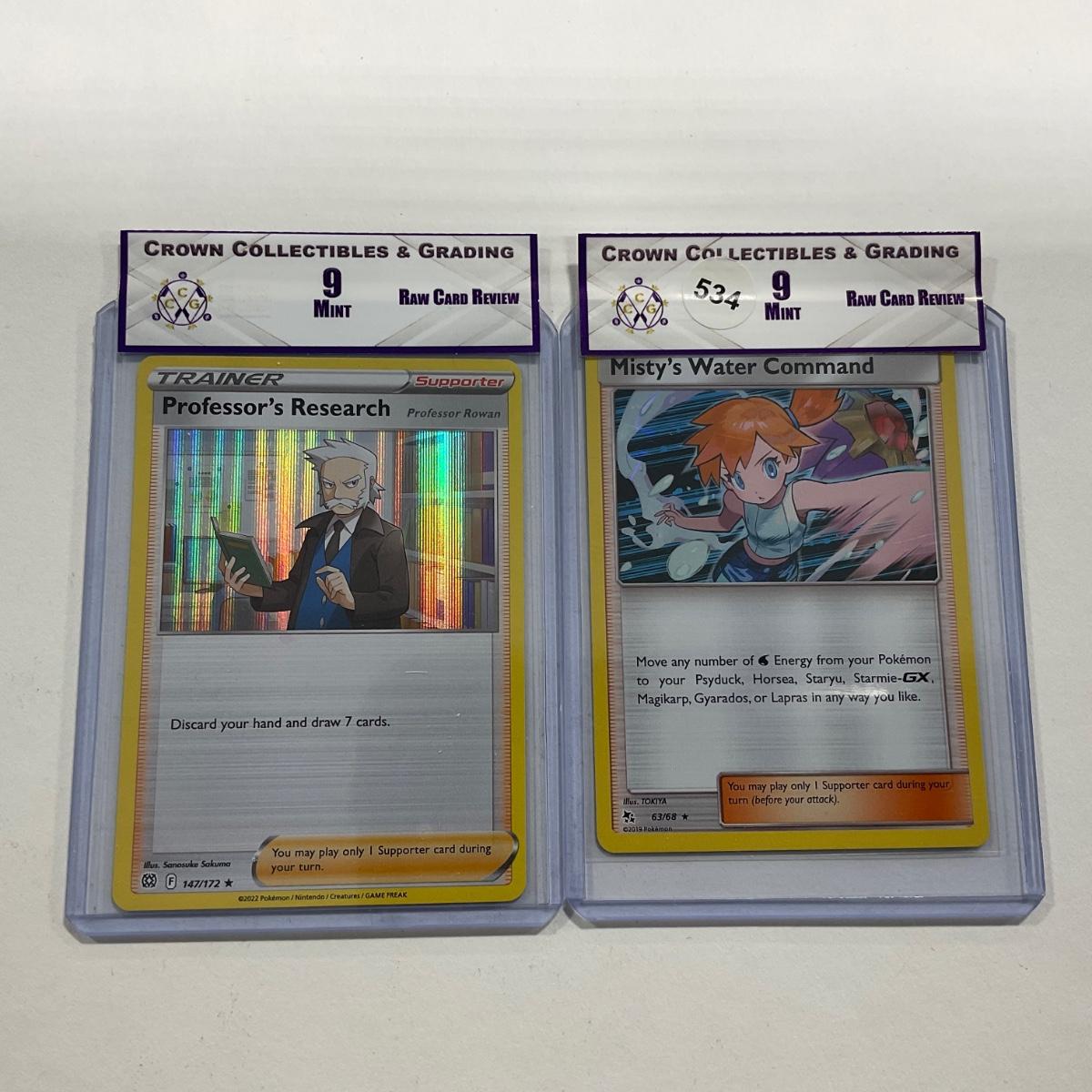 Two Pokémon Crown Collectibles, Raw card review including: Professor’s Research Mint 9 and Misty’s Water Command Mint 9. Please see photos for details and condition. ::: Shipping is available on this lot. If you require shipping you must let us know at the close of the auction. We will coordinate with you after the item has been won. Shipping fees will include insurance up to or exceeding the value of all items being mailed. If you have any questions regarding this lot please contact the auctioneer either via this website, by direct email or by phone. PICK UP TIMES and other important information can be found in the TERMS and DESCRIPTION of the auction. Please take a look for pertinent information. Thanks!