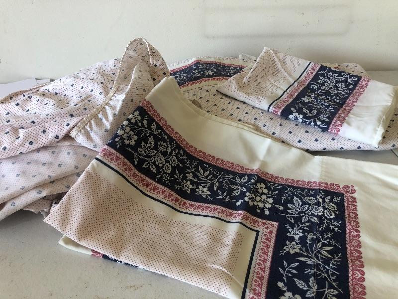Bundle includes two top sheets to standard pillow shams and to bottom fitted sheets. In good used condition. This is an ONSITE Auction all items will need to be picked up on location. Please see auction description for pick up procedures.