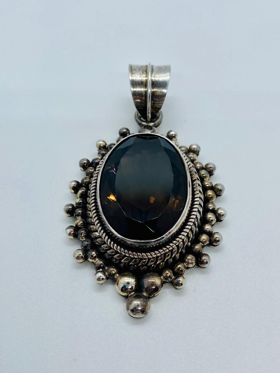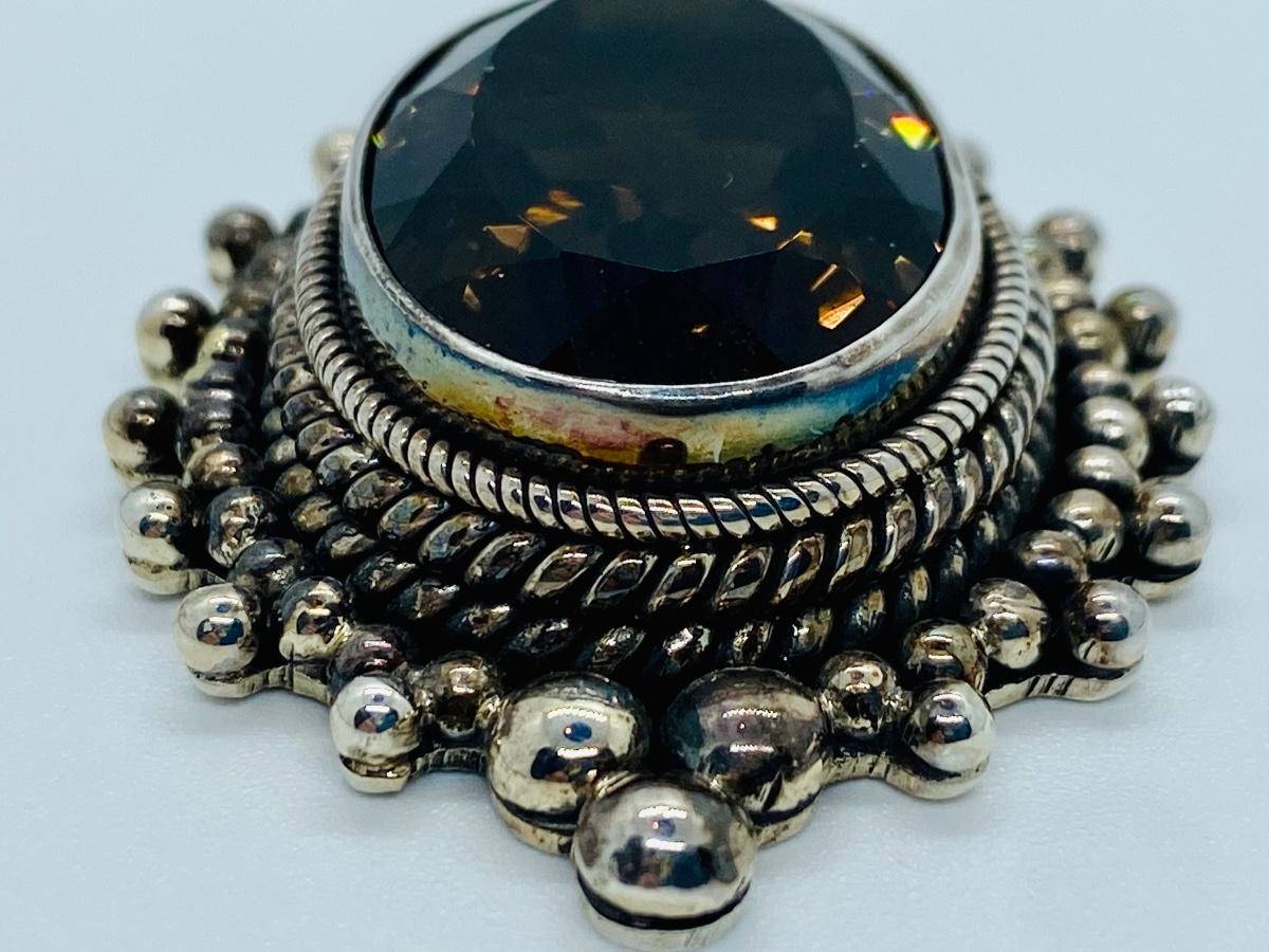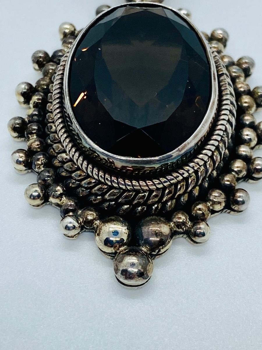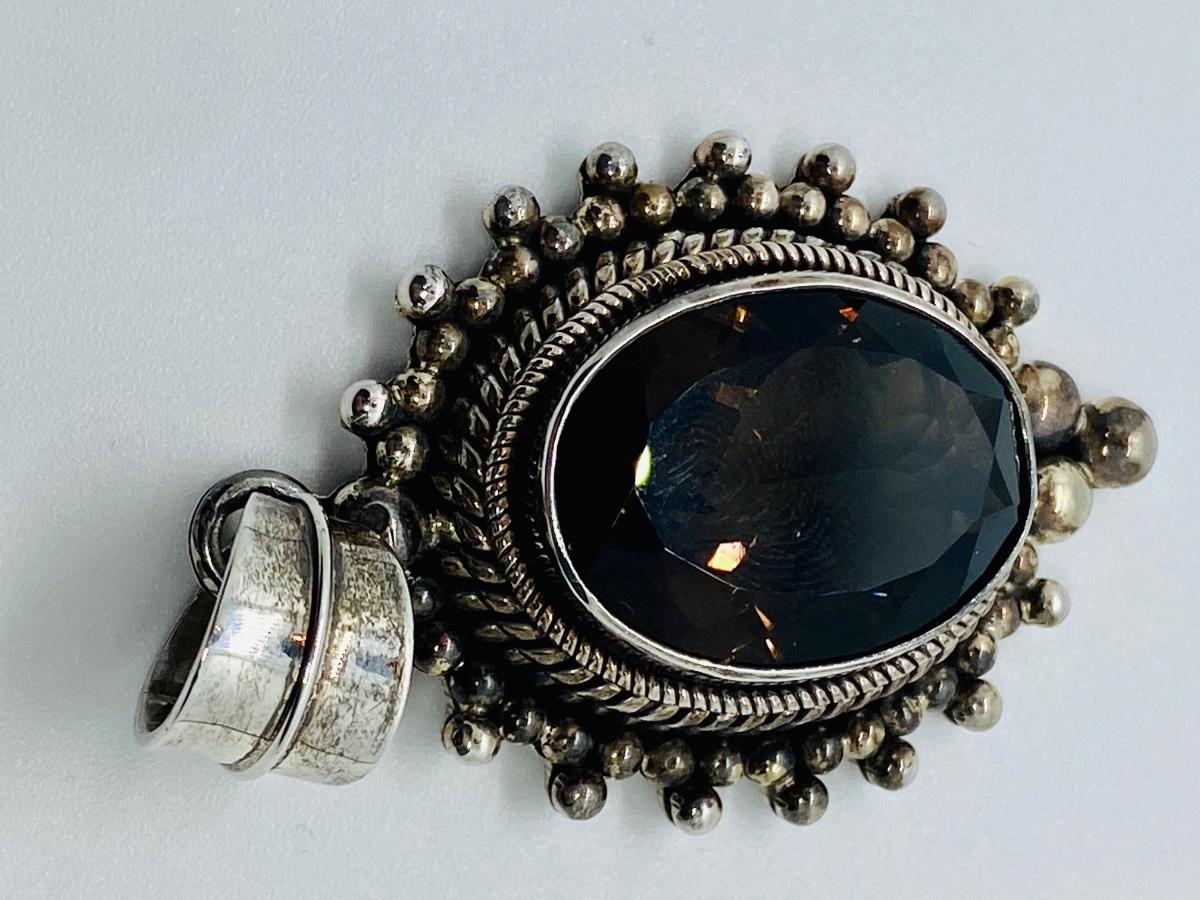Made by designer Suarti from Bali, indonesia is this sterling silver pendant featuring a large faceted smoky quartz within a beaded frame. This is in very good, pre-owned condition aside from some very minor scratches . It can fit up to a 10mm chain, measures 2 3/8“³ long by 1 3/8“³ wide, and it weighs 33 grams. Please see all pictures as they are the best representation of the items. The pictures show condition, measurements if taken, and what is included in the lot. Due to the large amount that we photograph and the time frame, we are not always able to take measurements. All items unless noted, are pre-owned and have been used.