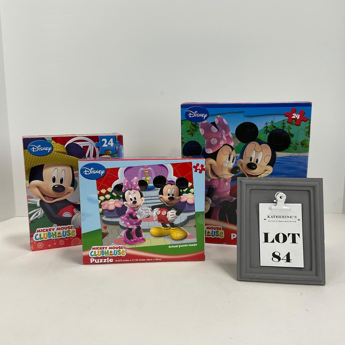 Three kids Mickey Mouse Clubhouse puzzles 24 pieces. Please see photos for details and condition. Any condition statement is given as a courtesy to a client, is an opinion, and should not be treated as a statement of fact. Reference to condition written, oral or within a condition report shall not be regarded as a full account of condition and may not include all defects, alterations, or restorations. Absence of a condition report does not imply a lot is flawless or lacking imperfections or damage. Katherine’s Auction & Appraisal Service shall have no responsibility for any error or omission. Returns shall not be accepted on the basis of condition. ::: Shipping is available on this lot. If you require shipping you must let us know at the close of the auction. We will coordinate with you after the item has been won. Shipping fees will include insurance up to or exceeding the value of all items being mailed. If you have any questions regarding this lot please contact the auctioneer either via this website, by direct email or by phone. PICK UP TIMES and other important information can be found in the TERMS and DESCRIPTION of the auction. Please take a look for pertinent information. Thanks!