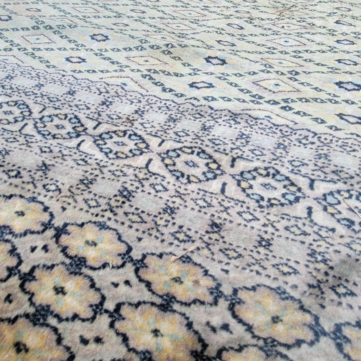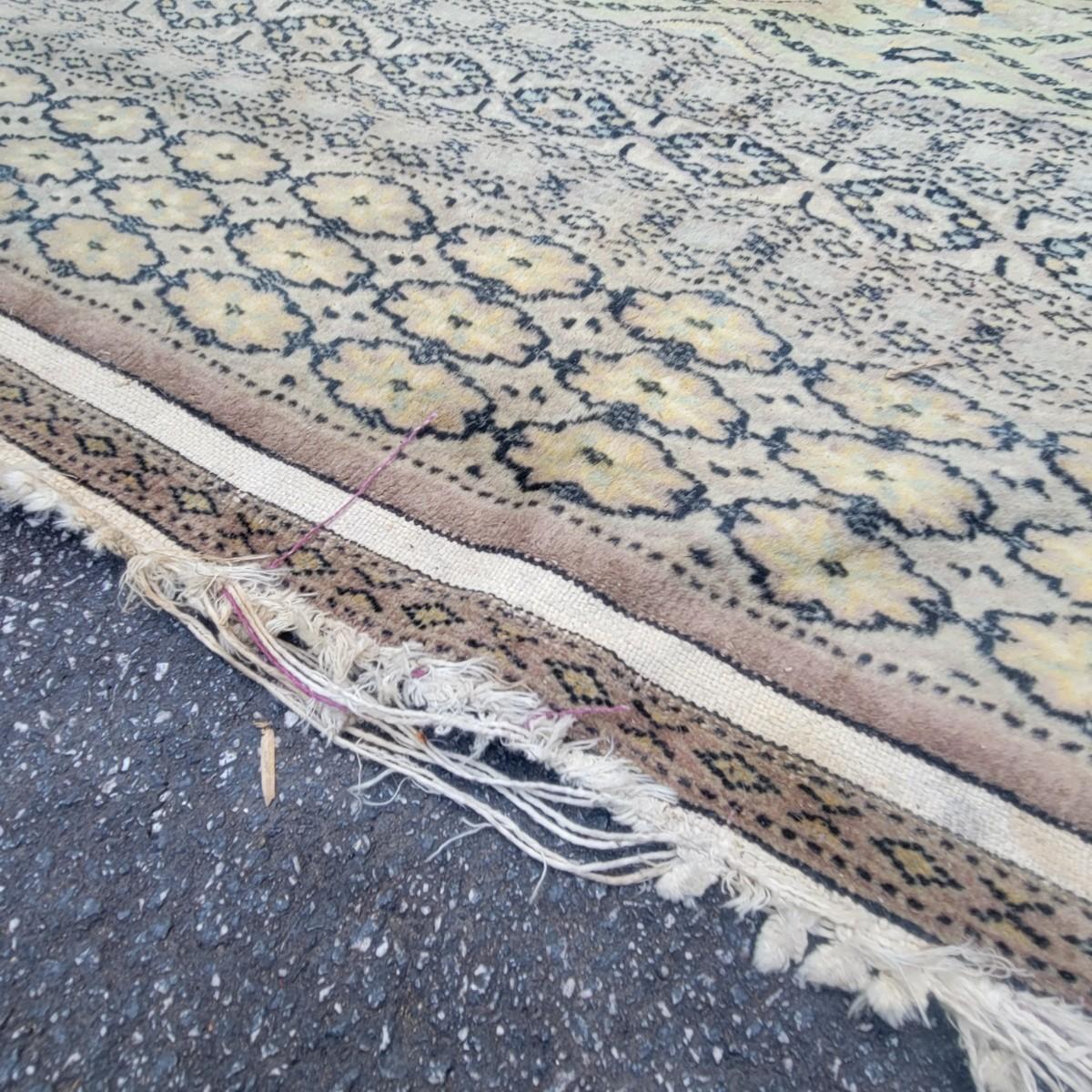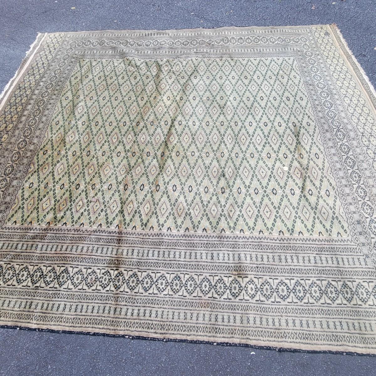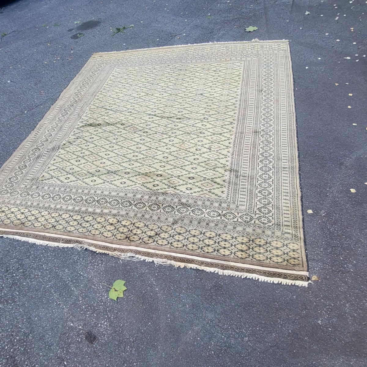 Large floor rug in decent condition. No major stains, but end tassels are frayed. Unknown manufacturer. Local pickup only