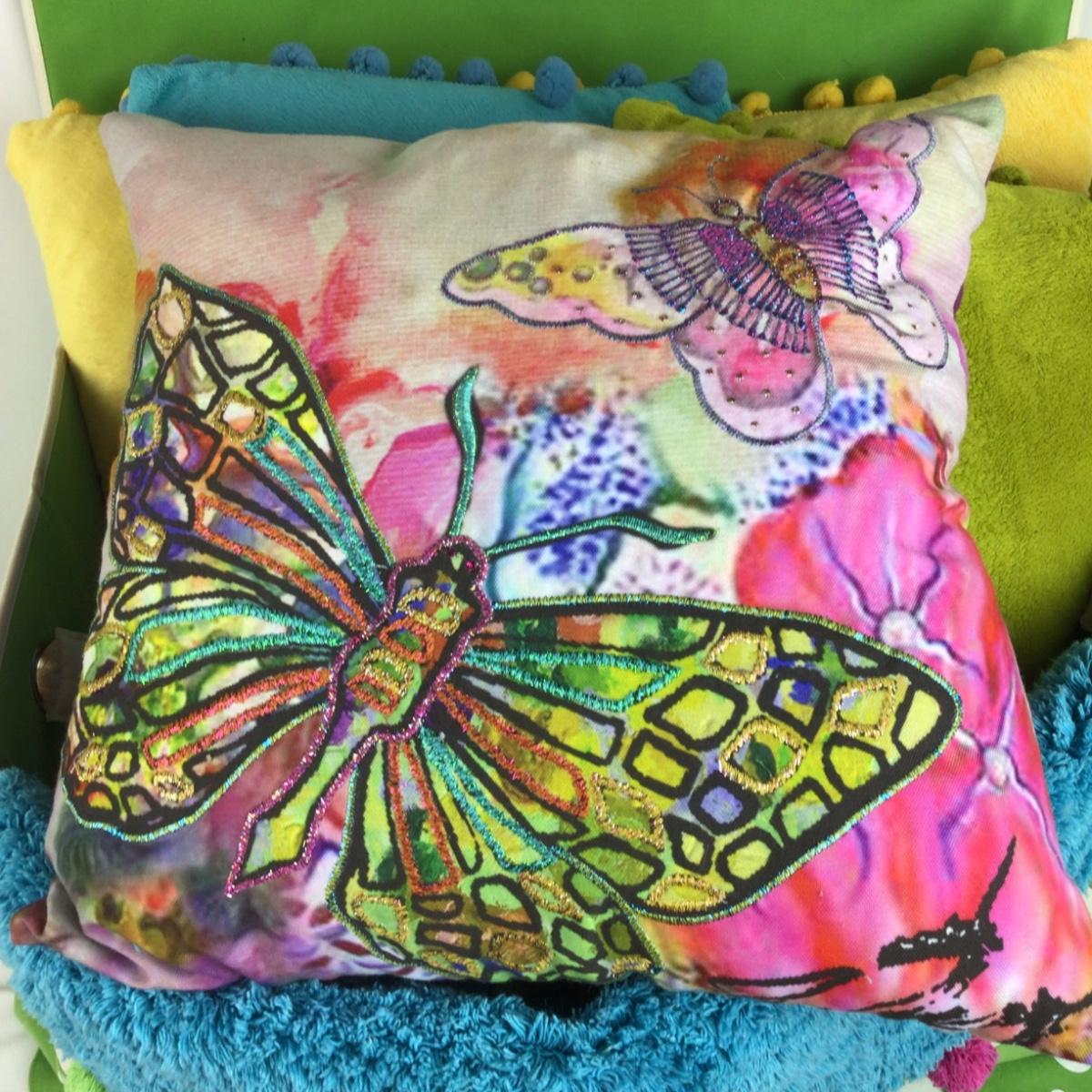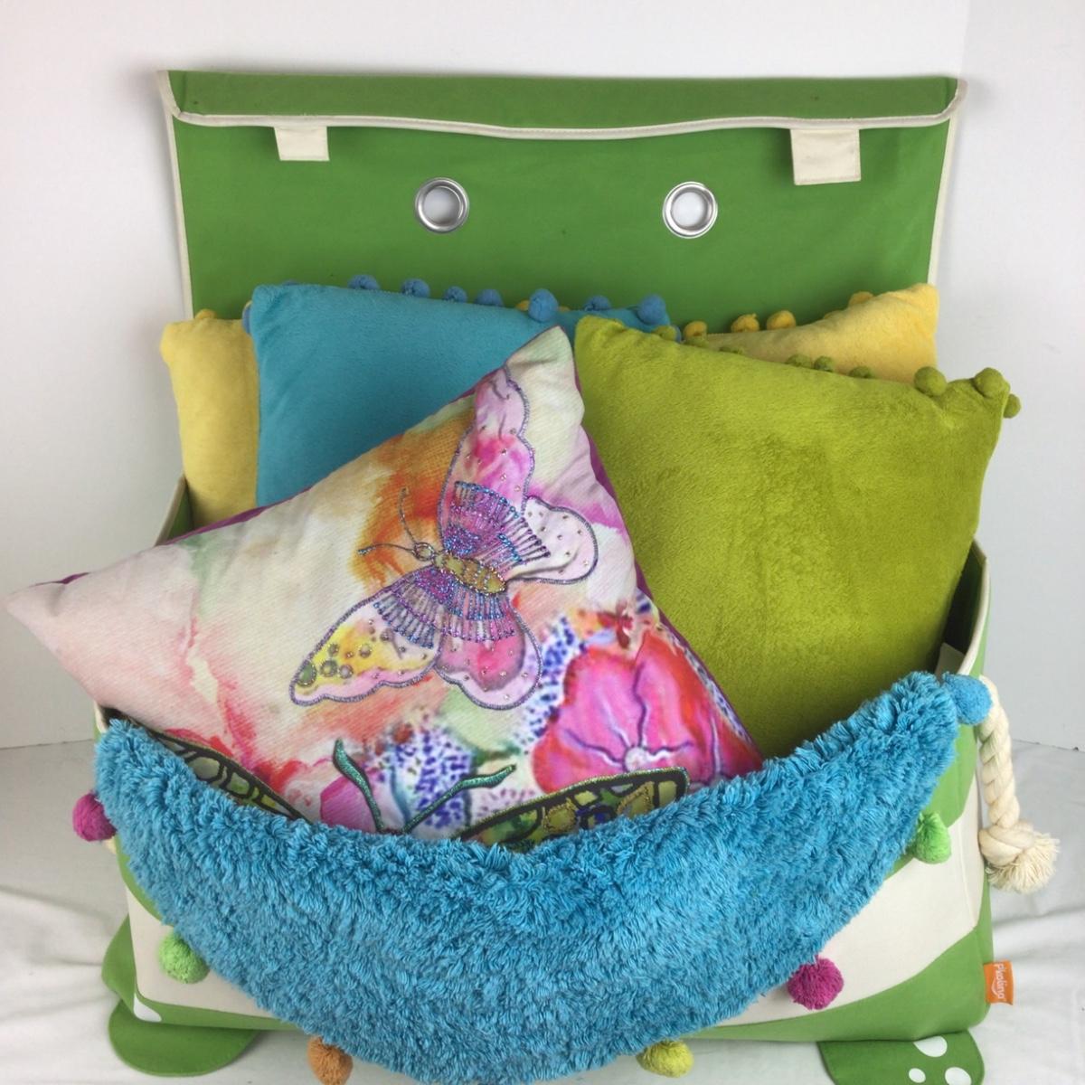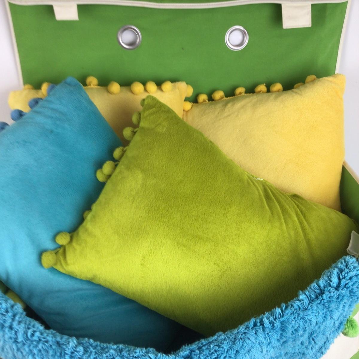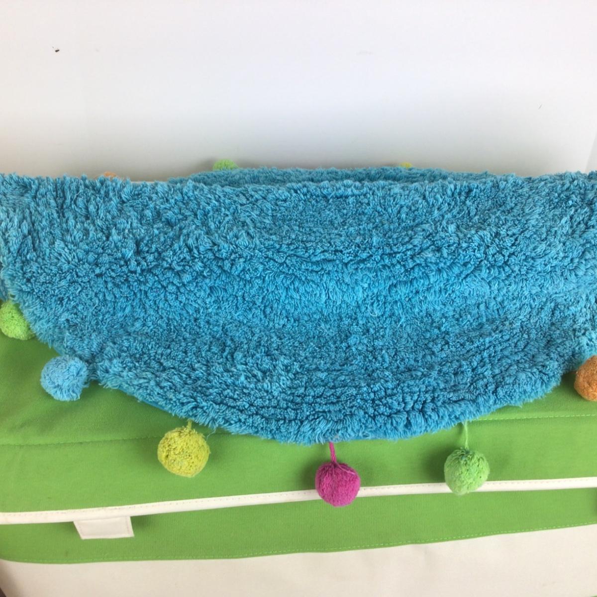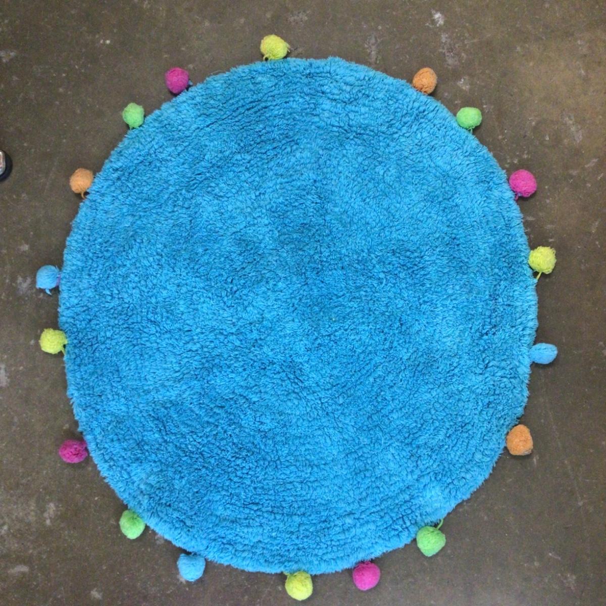 4 rectangle pillows with pompoms and 26" round blue rug with pom pots
