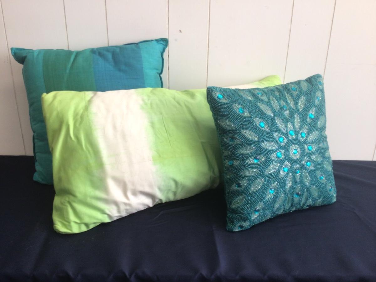 One green and white silk designer guild pillow, small square silk pillow , one beaded pillow