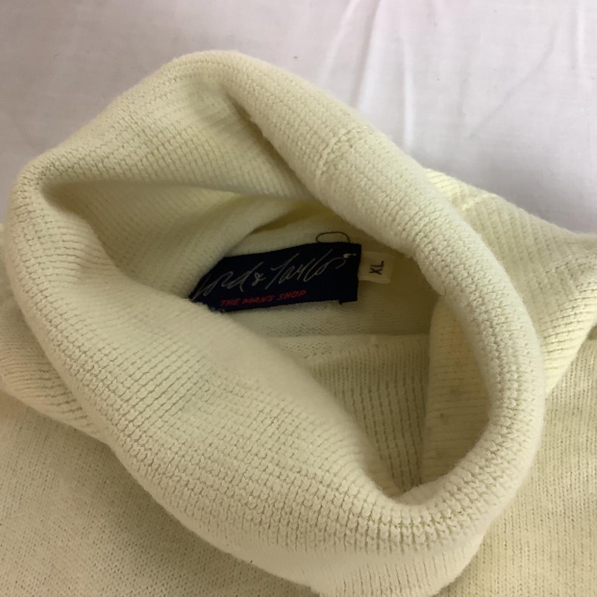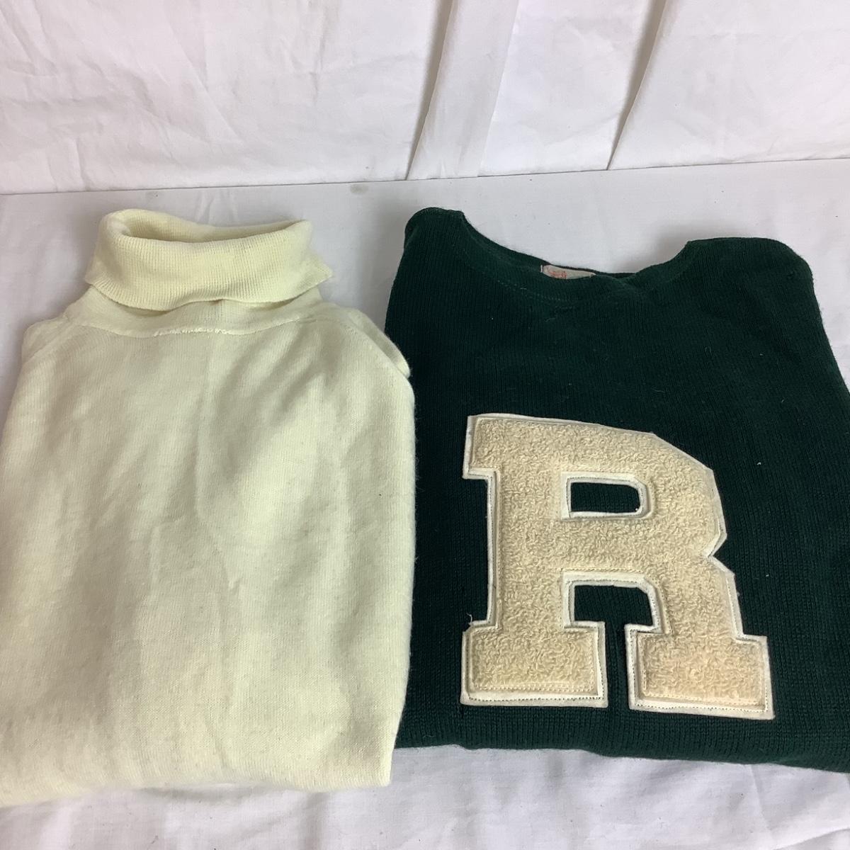 The letter sweater is a size 44 and comes with Lord & Taylor soft turtleneck size XL. The sweater is by Tom Harmer and is 100% Wool. There are multiple tiny holes in the sweater.