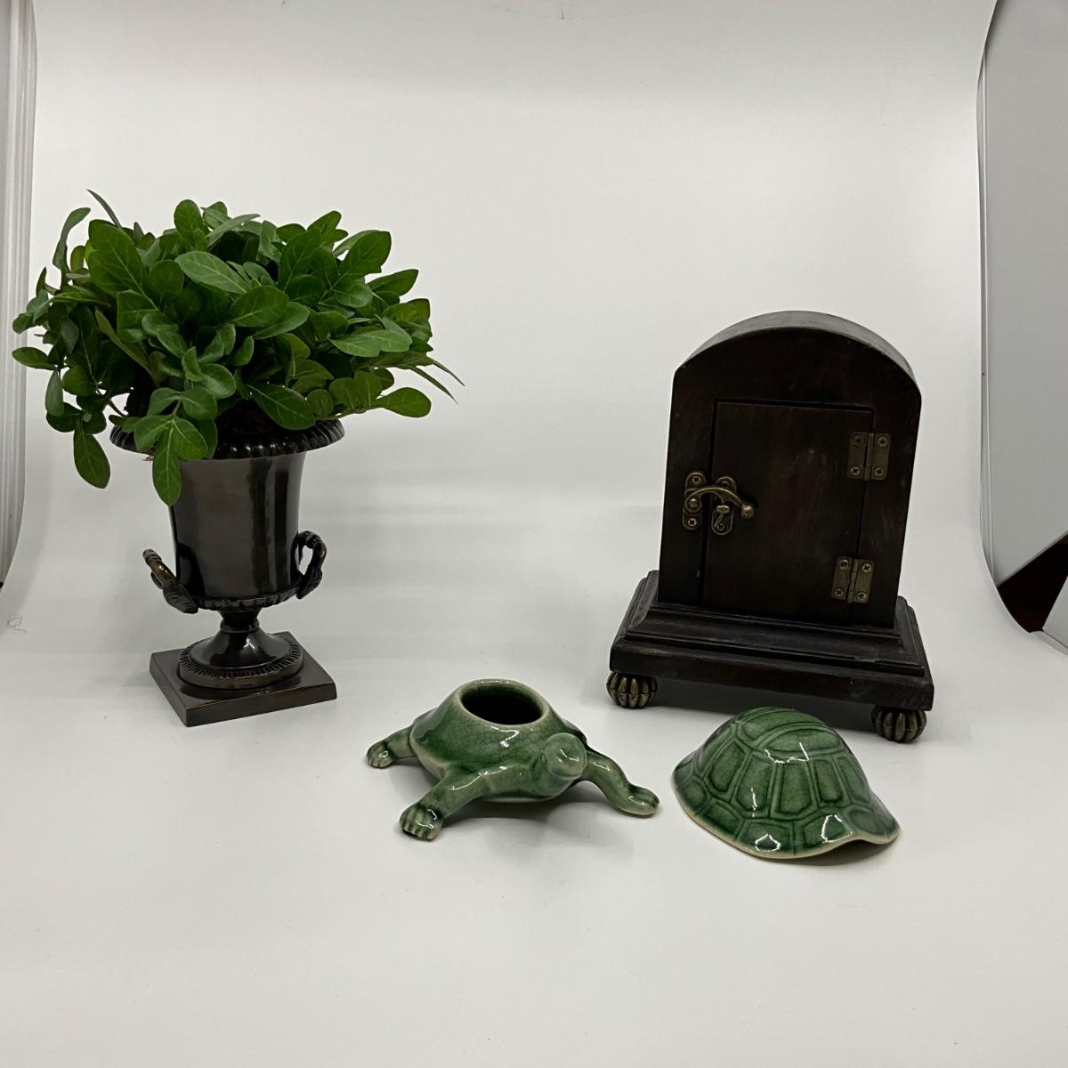 843 Decorative Turtle Dish with Faux Greenery and Desk Clock