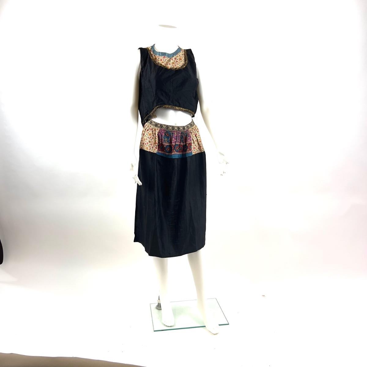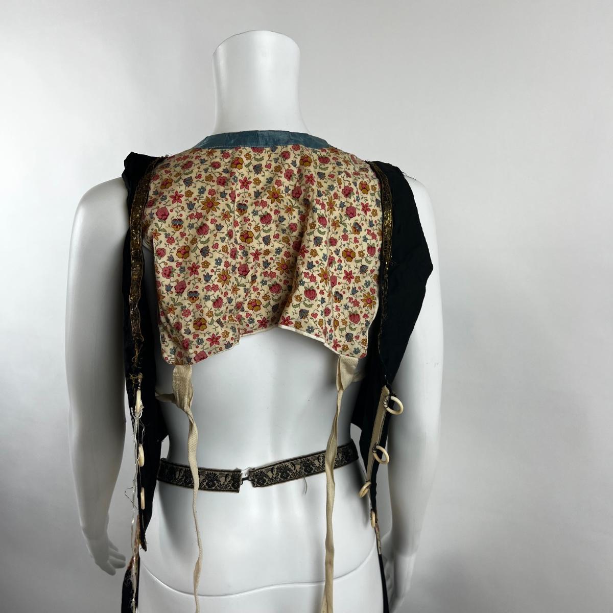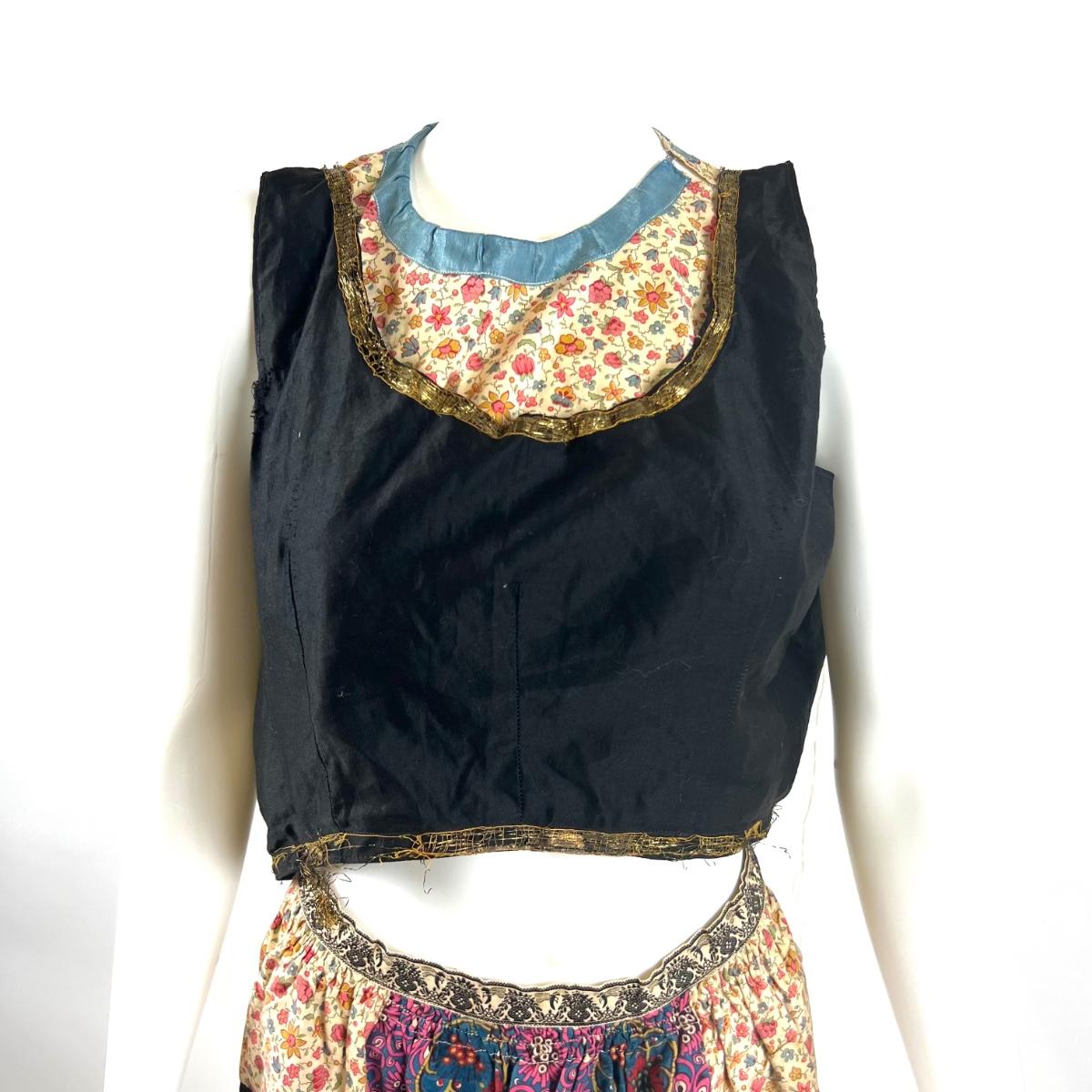 Woven, embroidered silk, top, vest and skirt. Floral bib with matching apron, black vest with gold trim, delicate condition, sold as is.