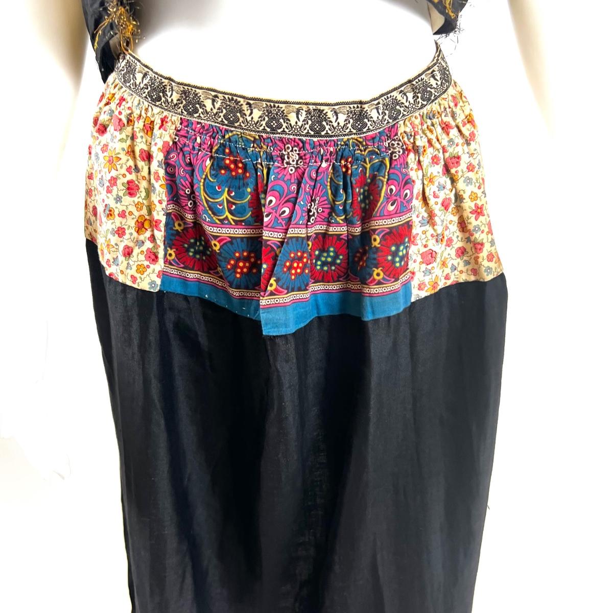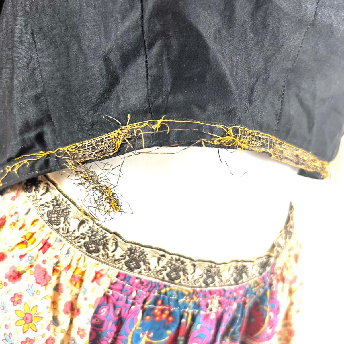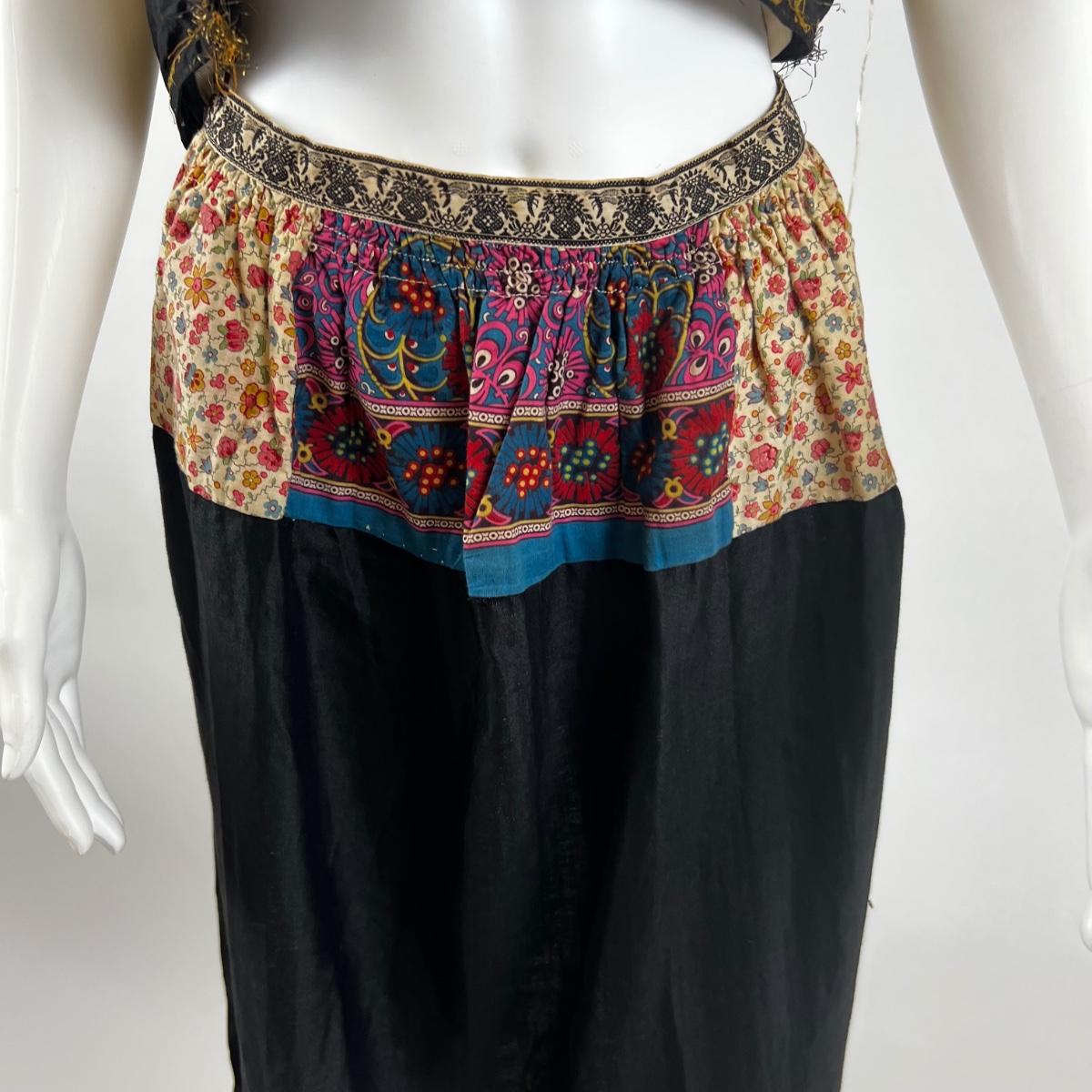 Woven, embroidered silk, top, vest and skirt. Floral bib with matching apron, black vest with gold trim, delicate condition, sold as is.