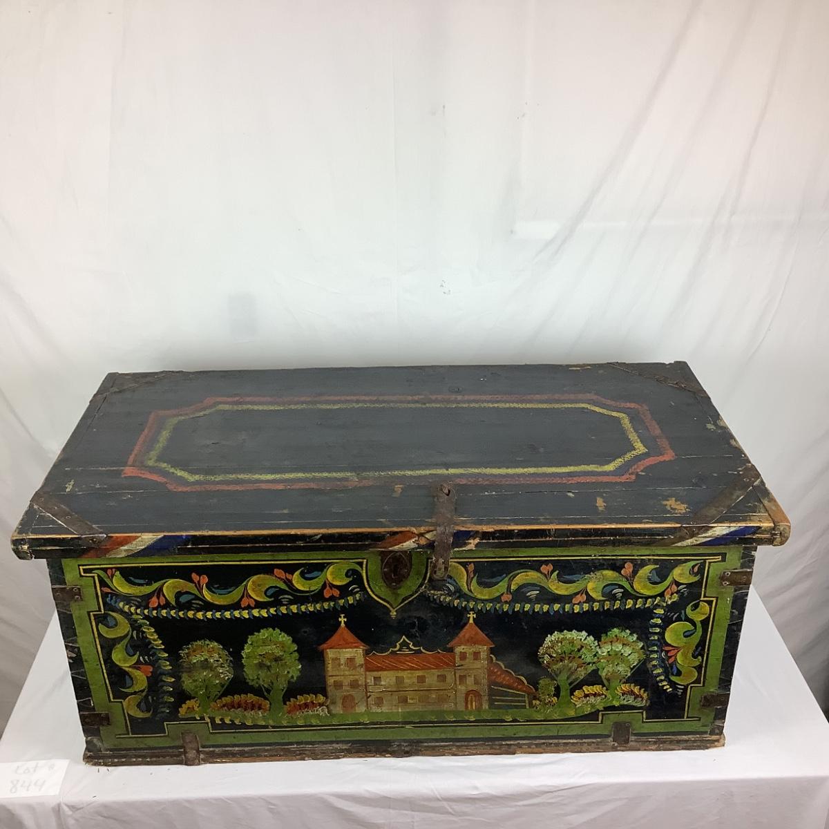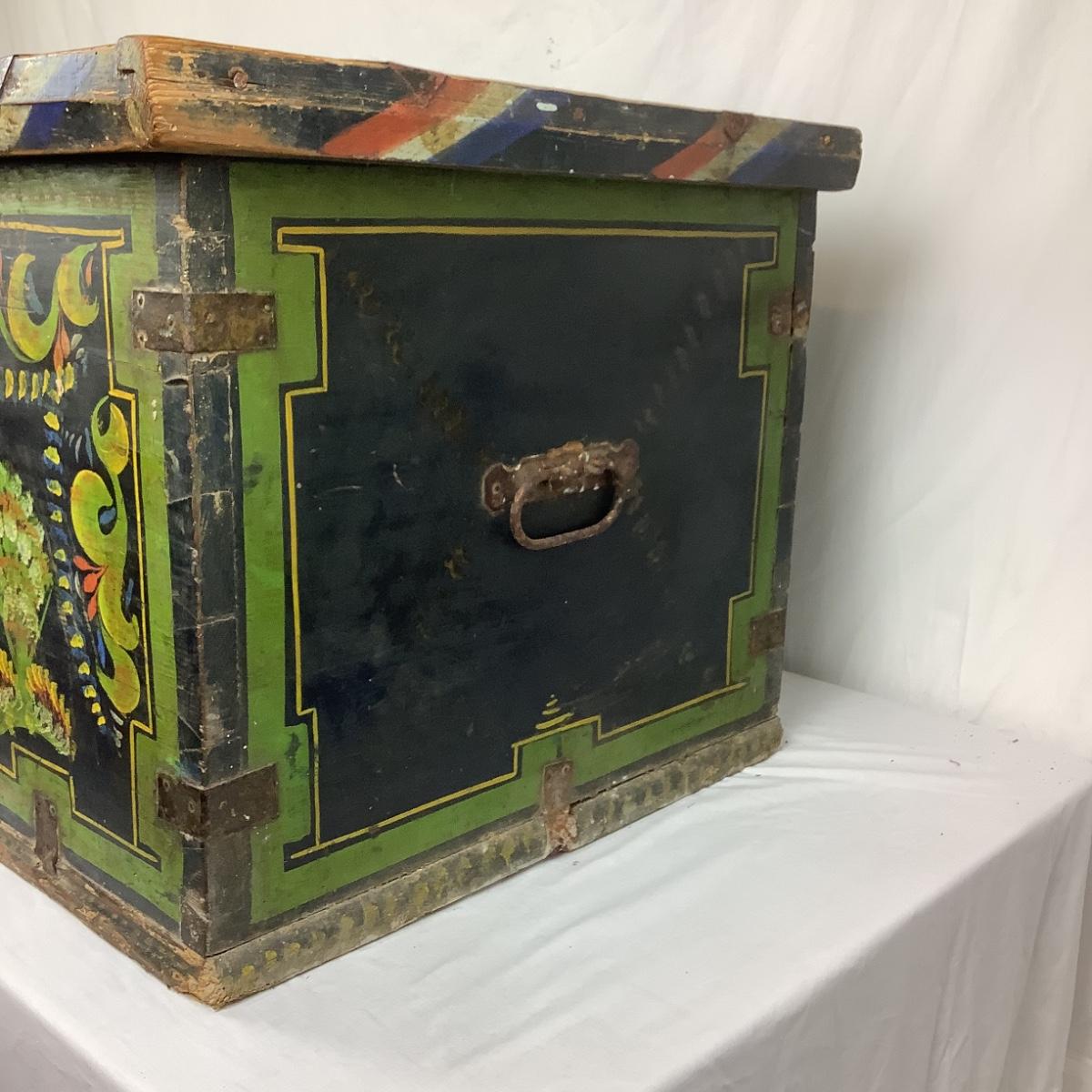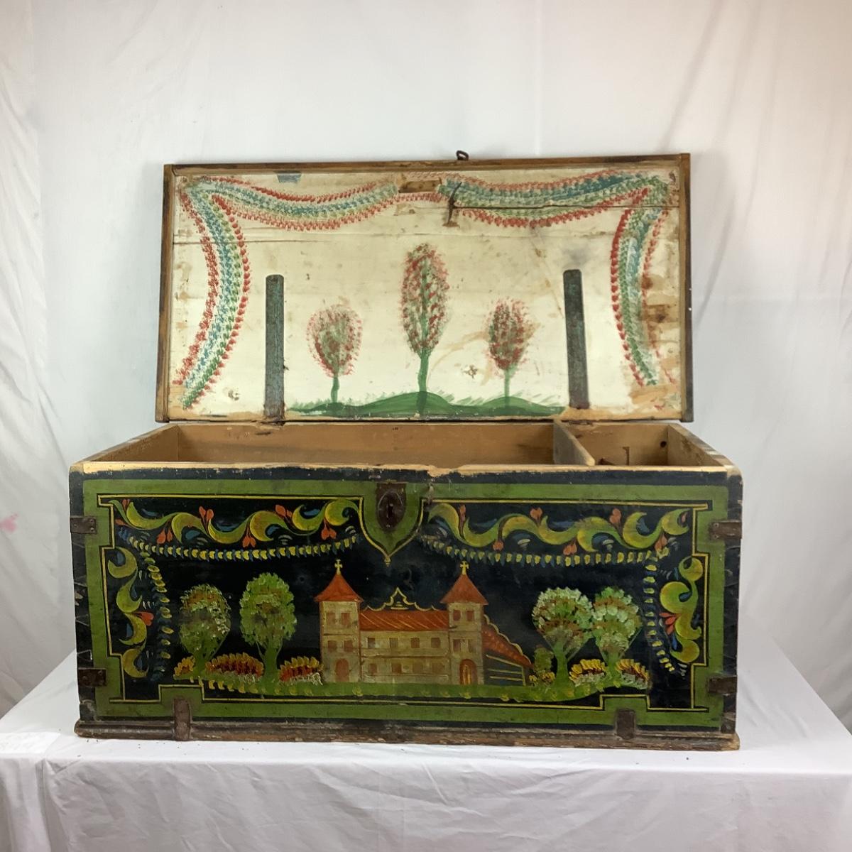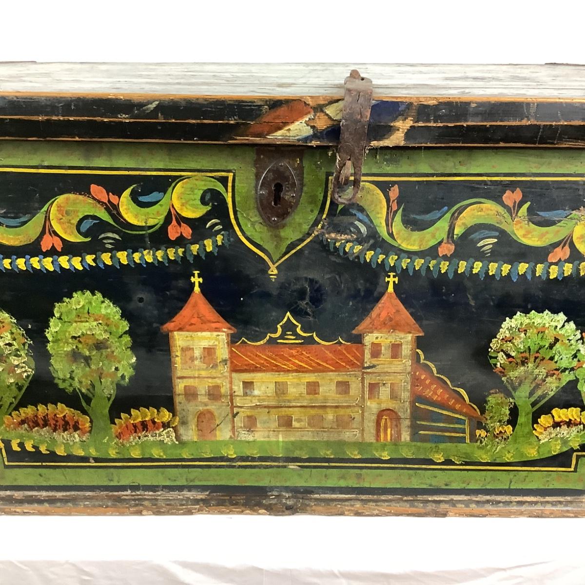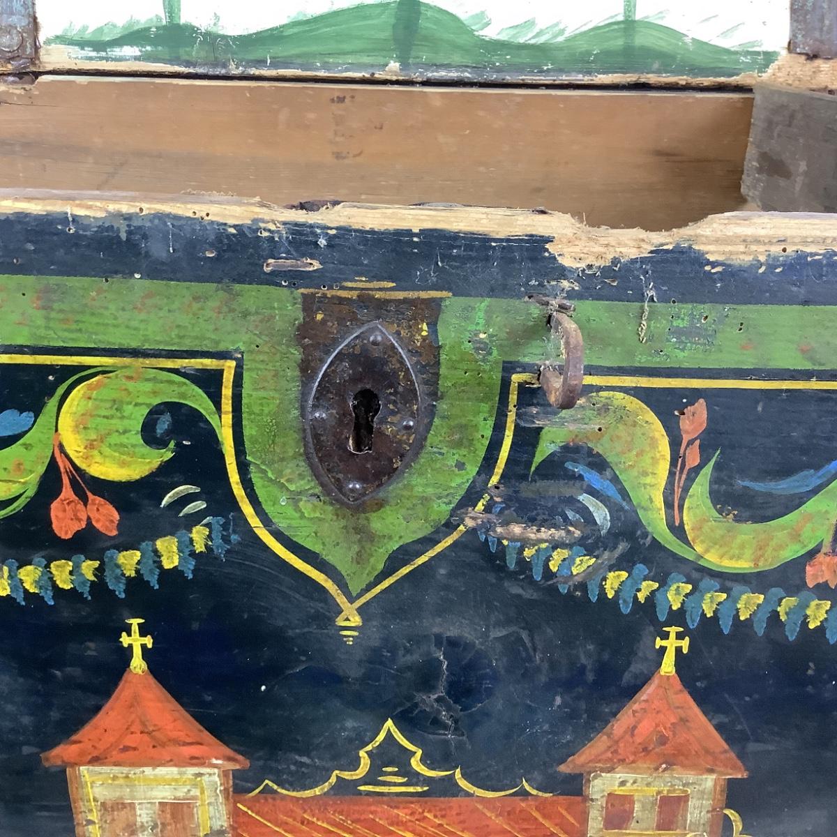 Beautifully painted russian chest with design on front, ends and inside of top. Small wooden box on right hand side. Hinges are broken in back and left handle is missing