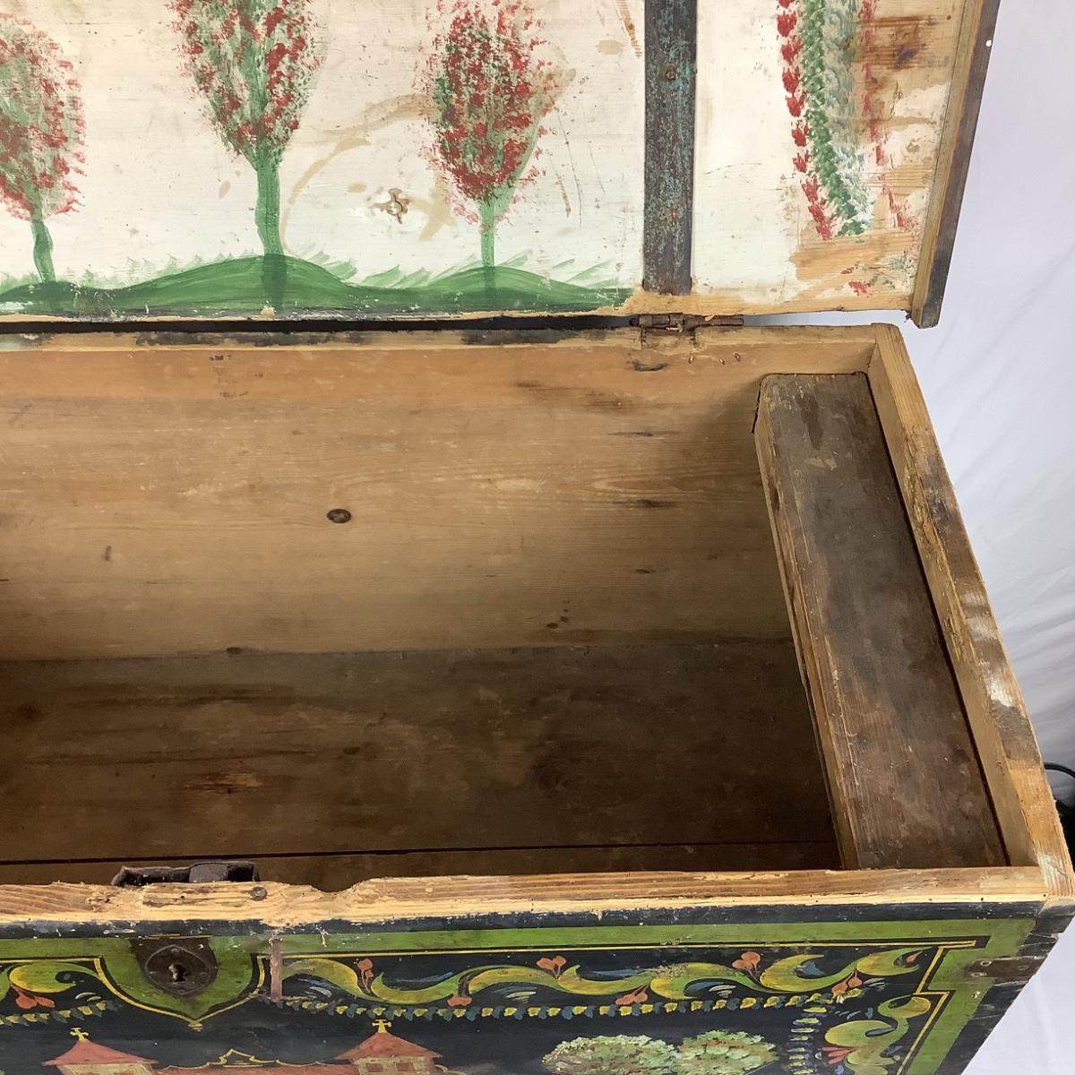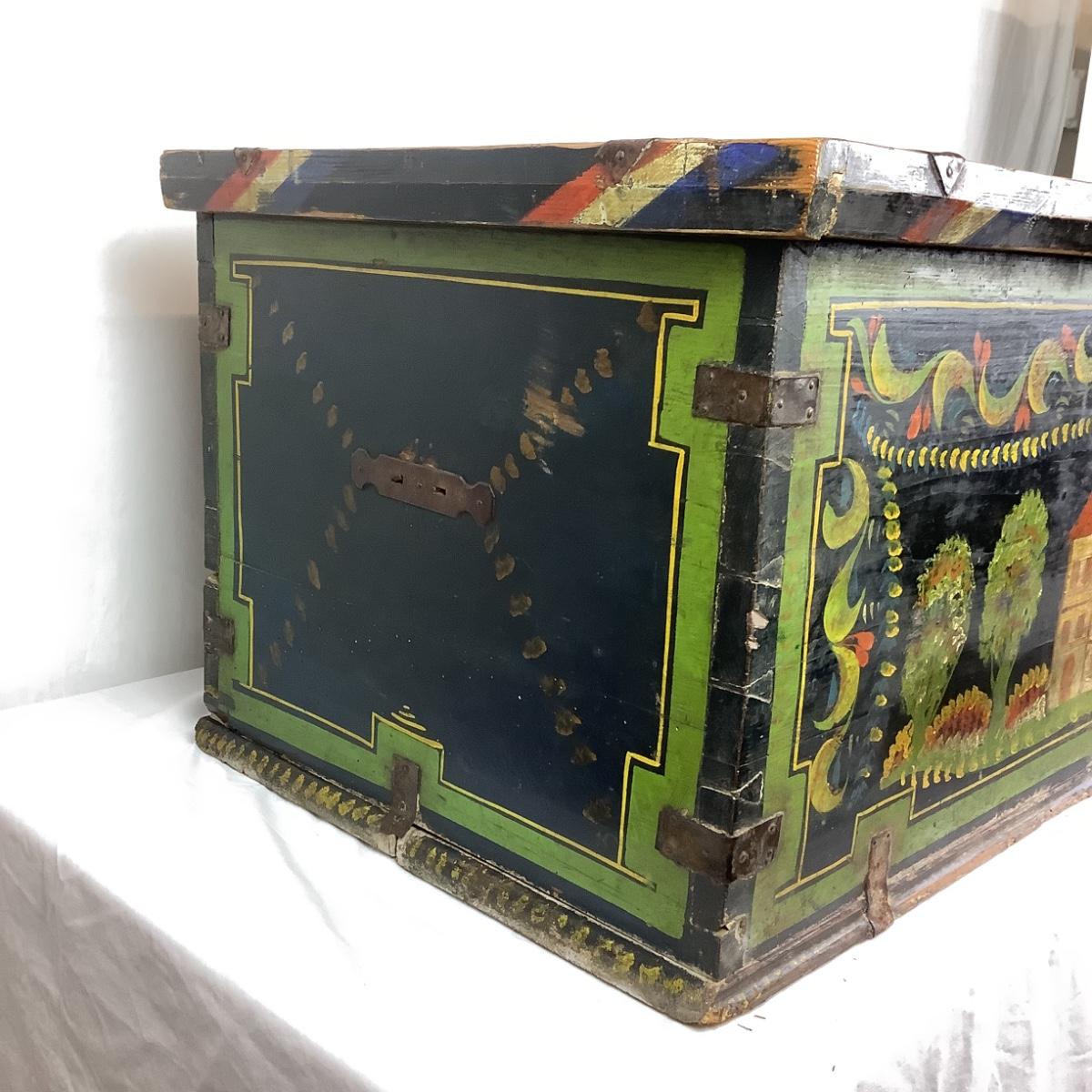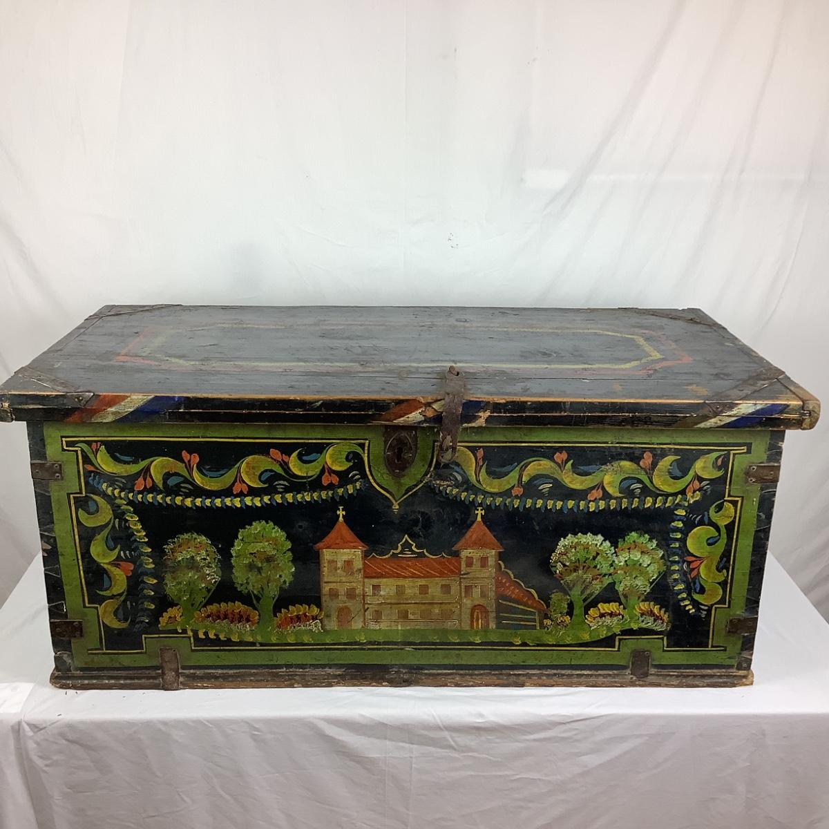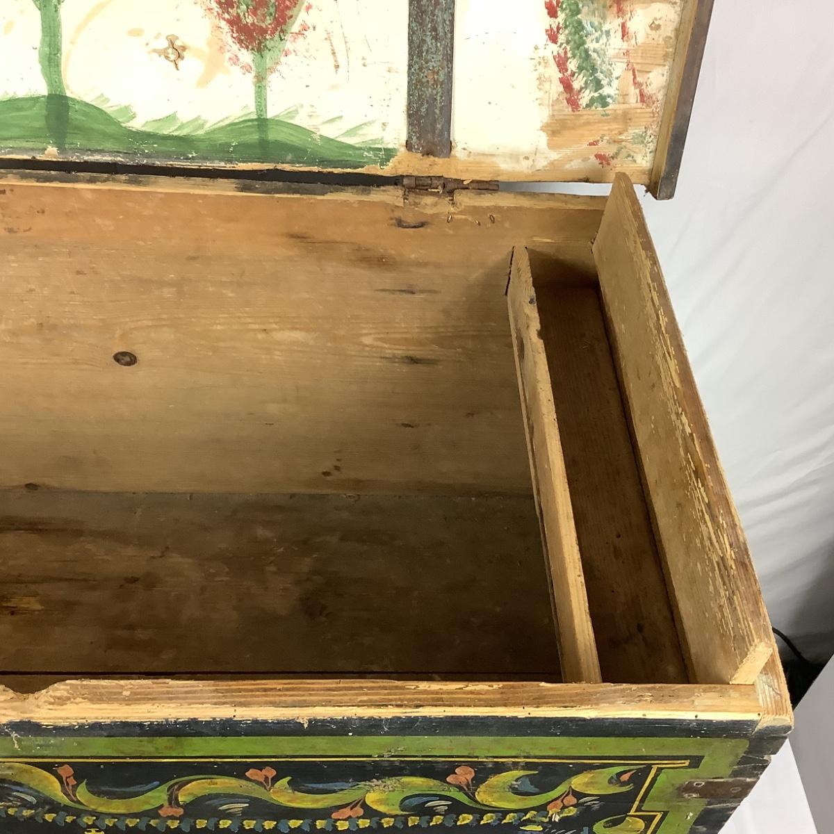Beautifully painted russian chest with design on front, ends and inside of top. Small wooden box on right hand side. Hinges are broken in back and left handle is missing