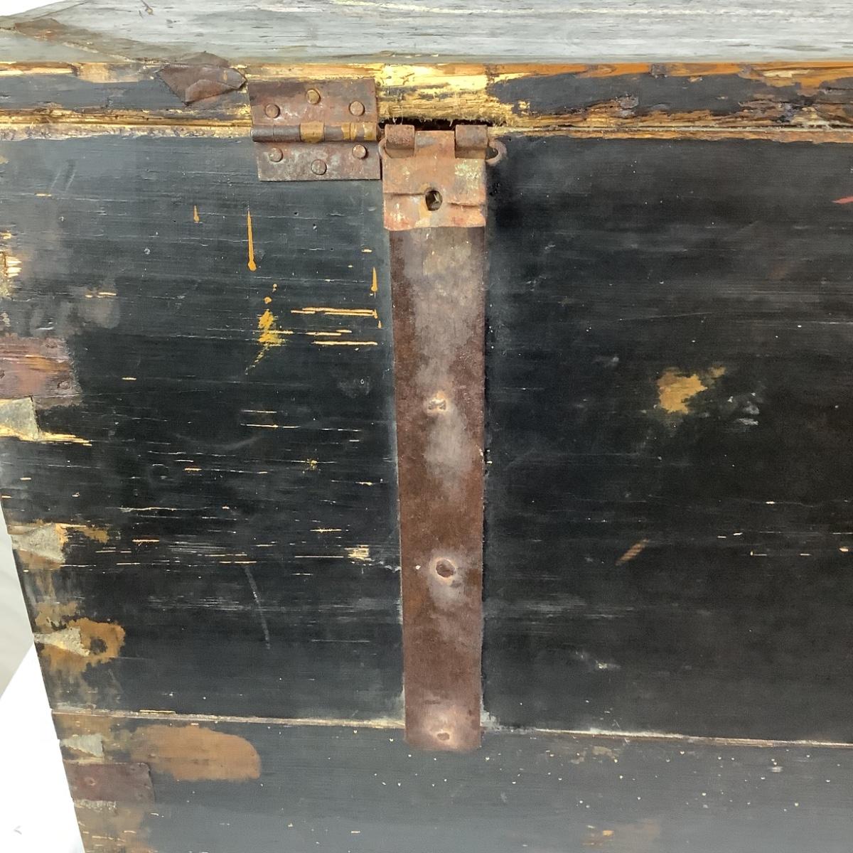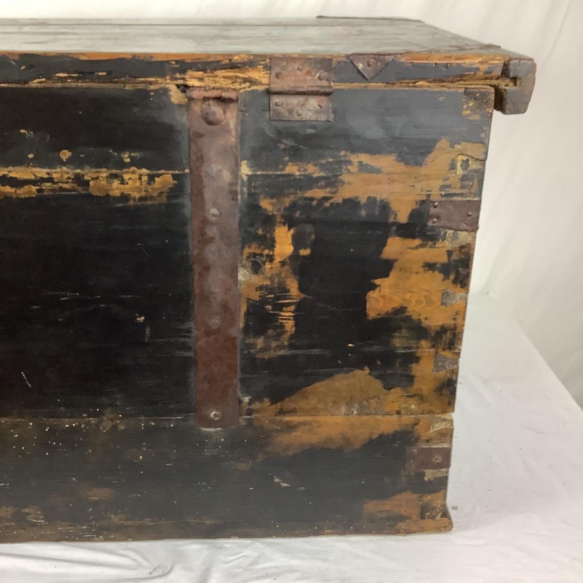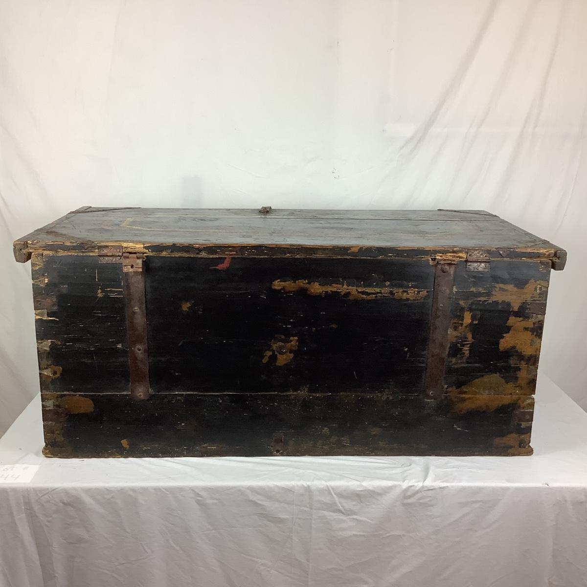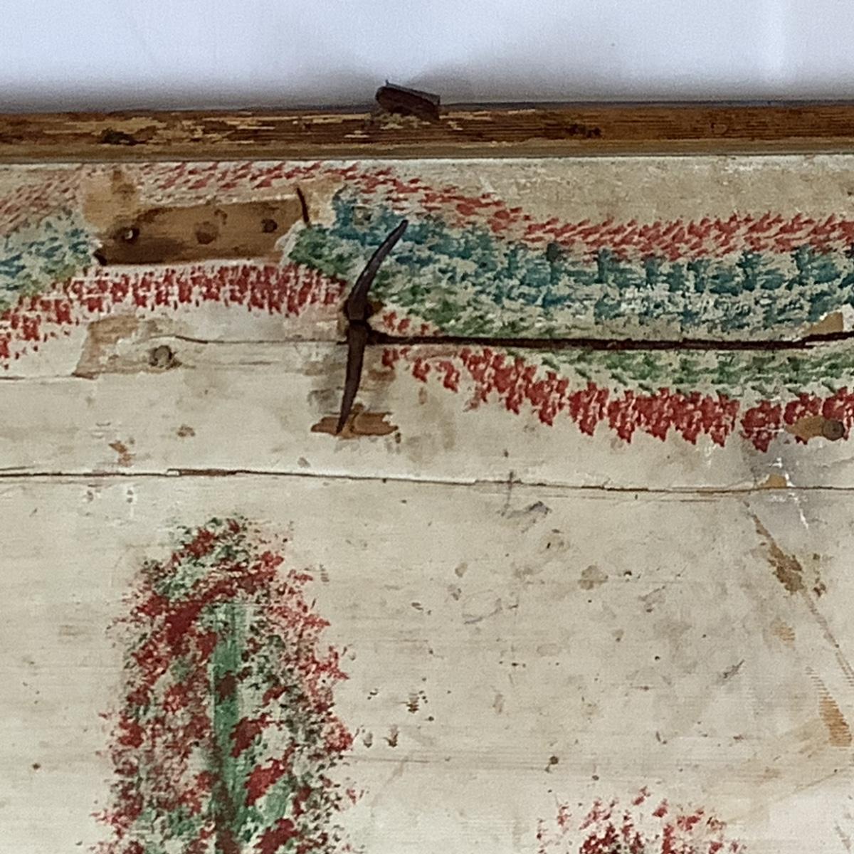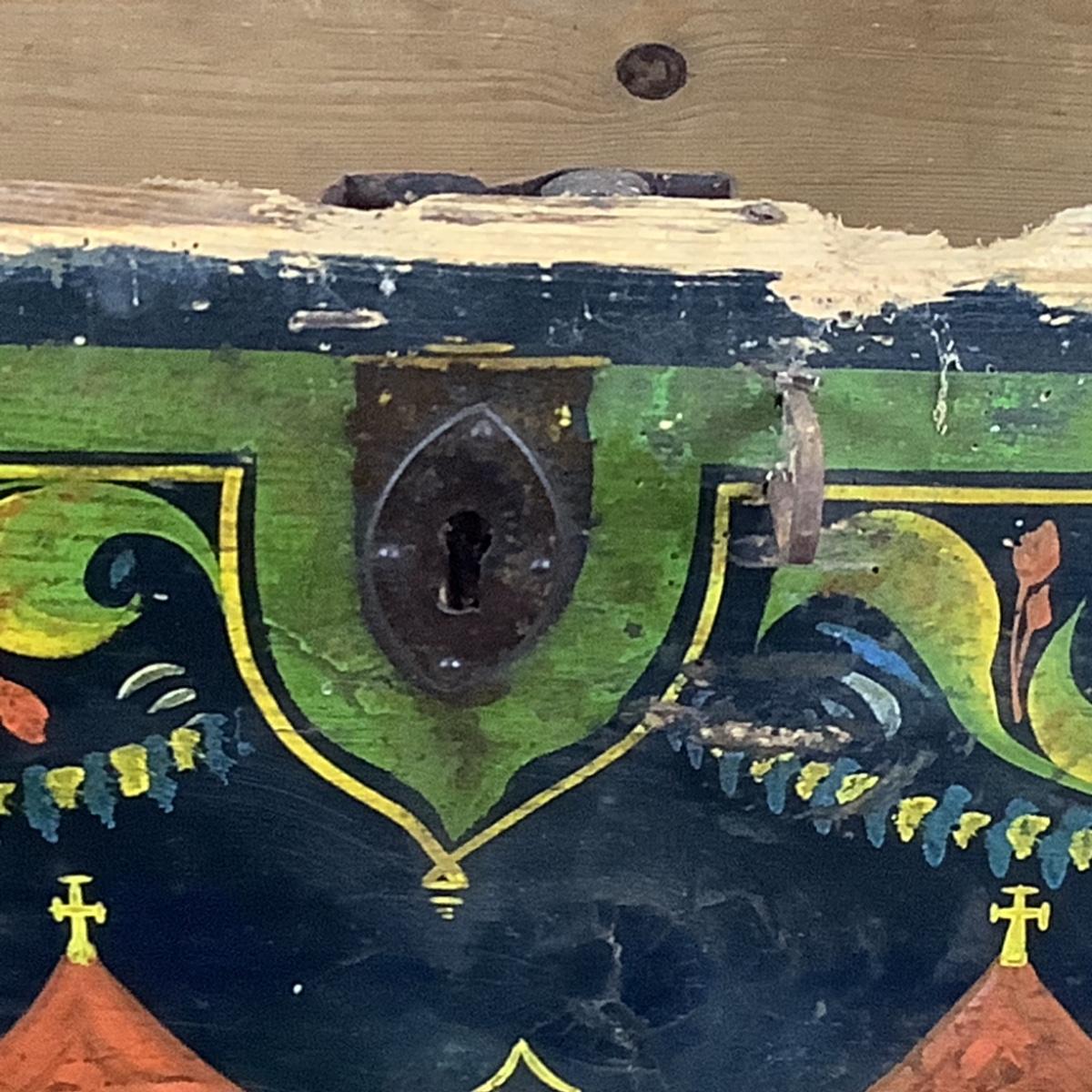 Beautifully painted russian chest with design on front, ends and inside of top. Small wooden box on right hand side. Hinges are broken in back and left handle is missing