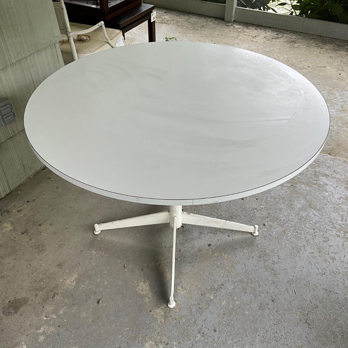 Table has a formica top with metal base and measures 41.5" diameter x 29.25" high