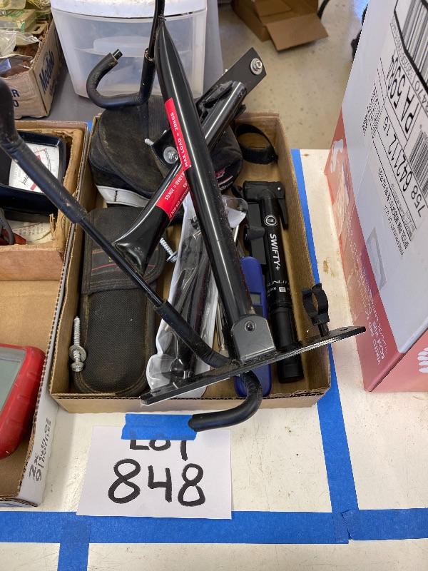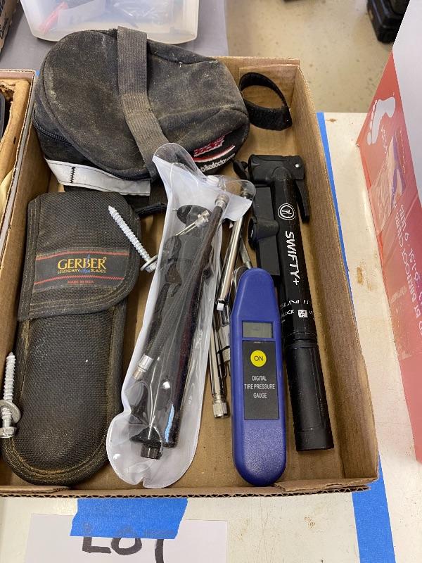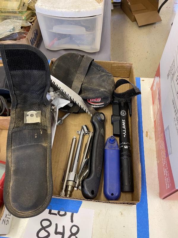 Hand tree branch trim saw, bicycle pumps, battery tester, etc..