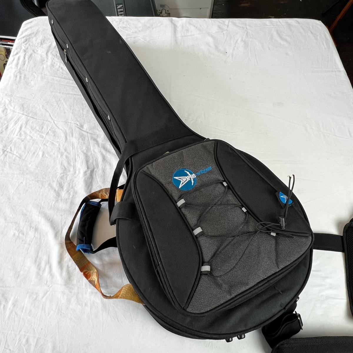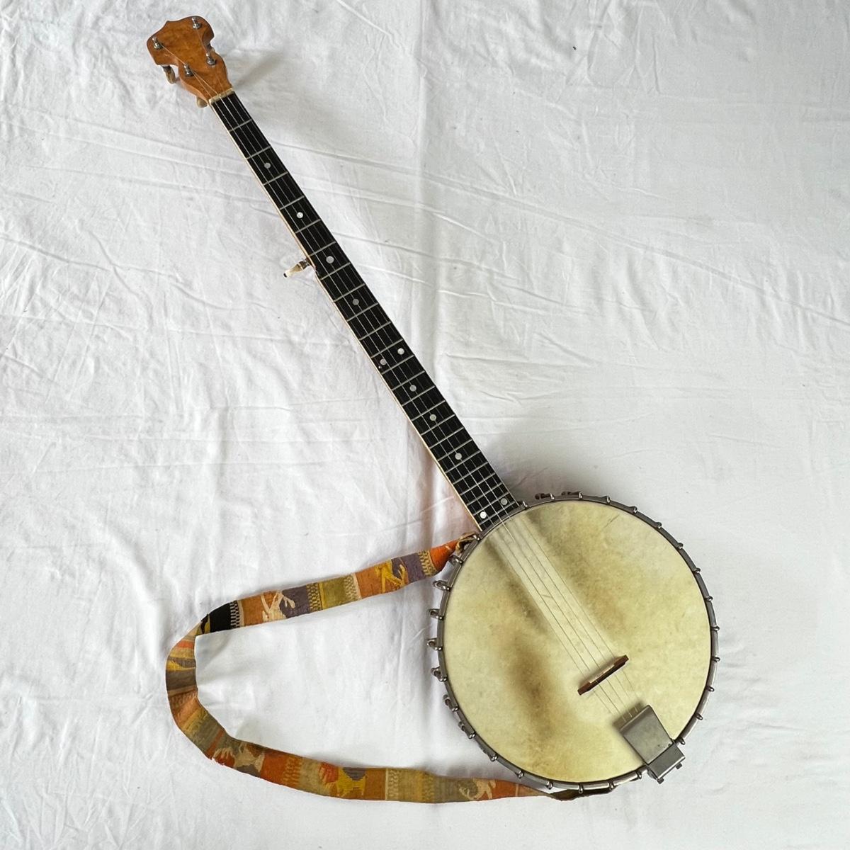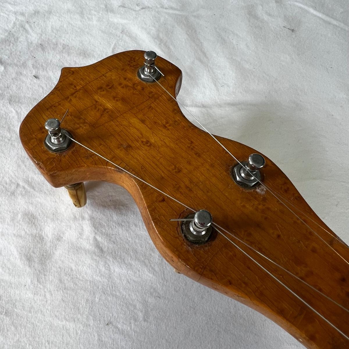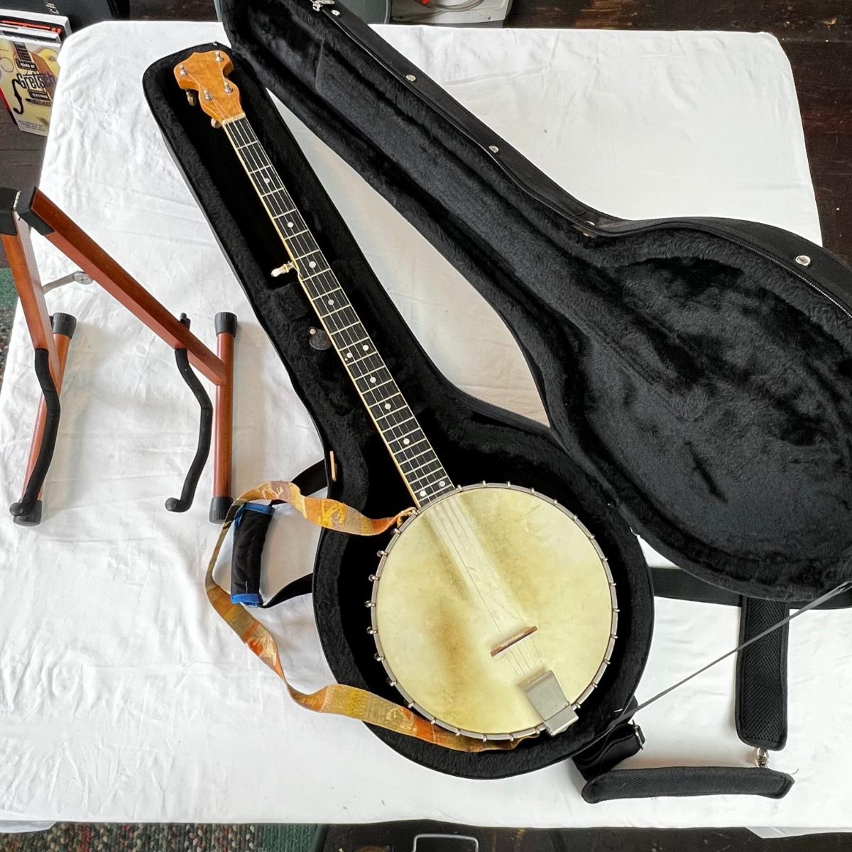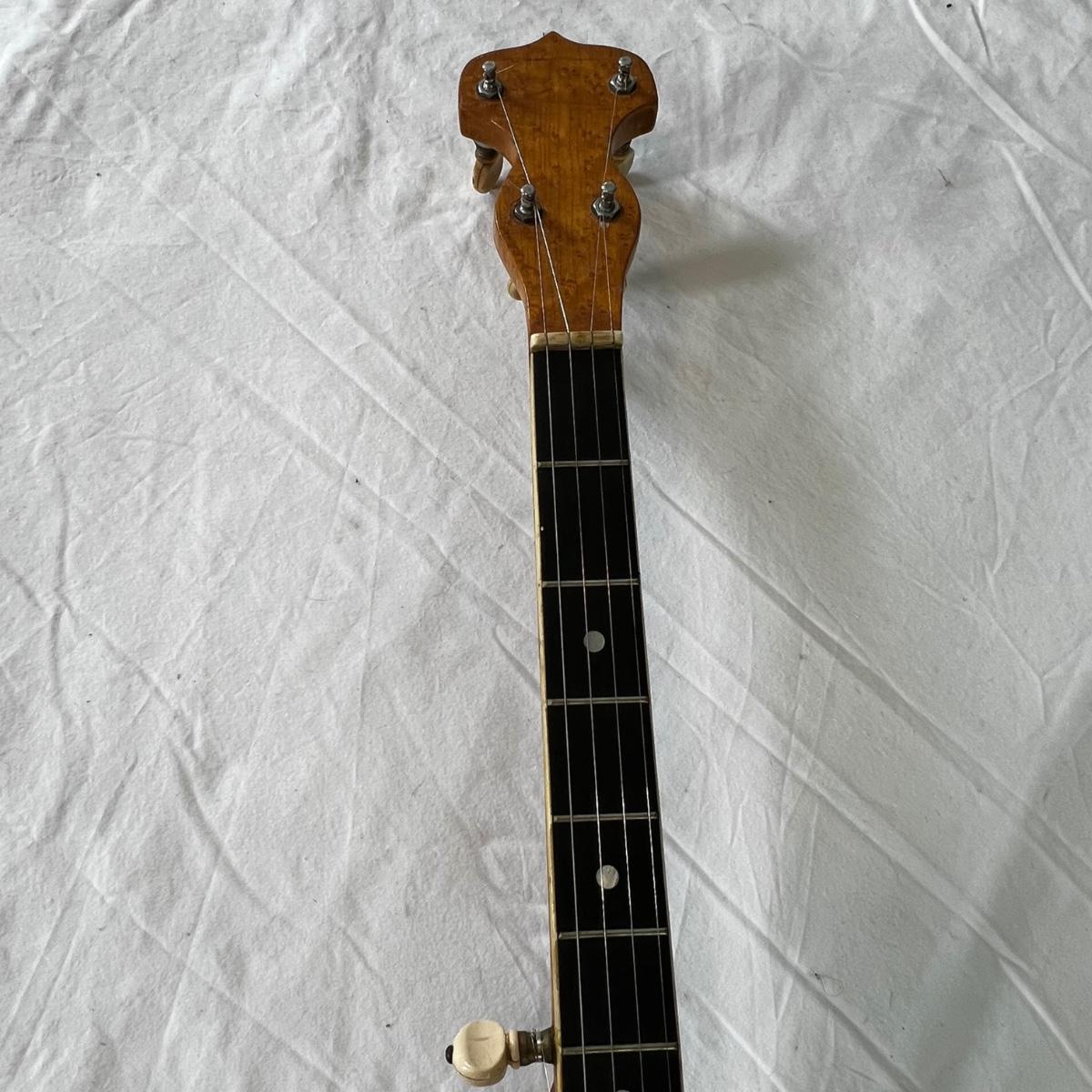 Vintage long neck, open back body. Good condition. Gloss finish on the fret board and head is cracking but is hardly noticeable. Cannot find model name. Includes a banjo travel bag and stand.