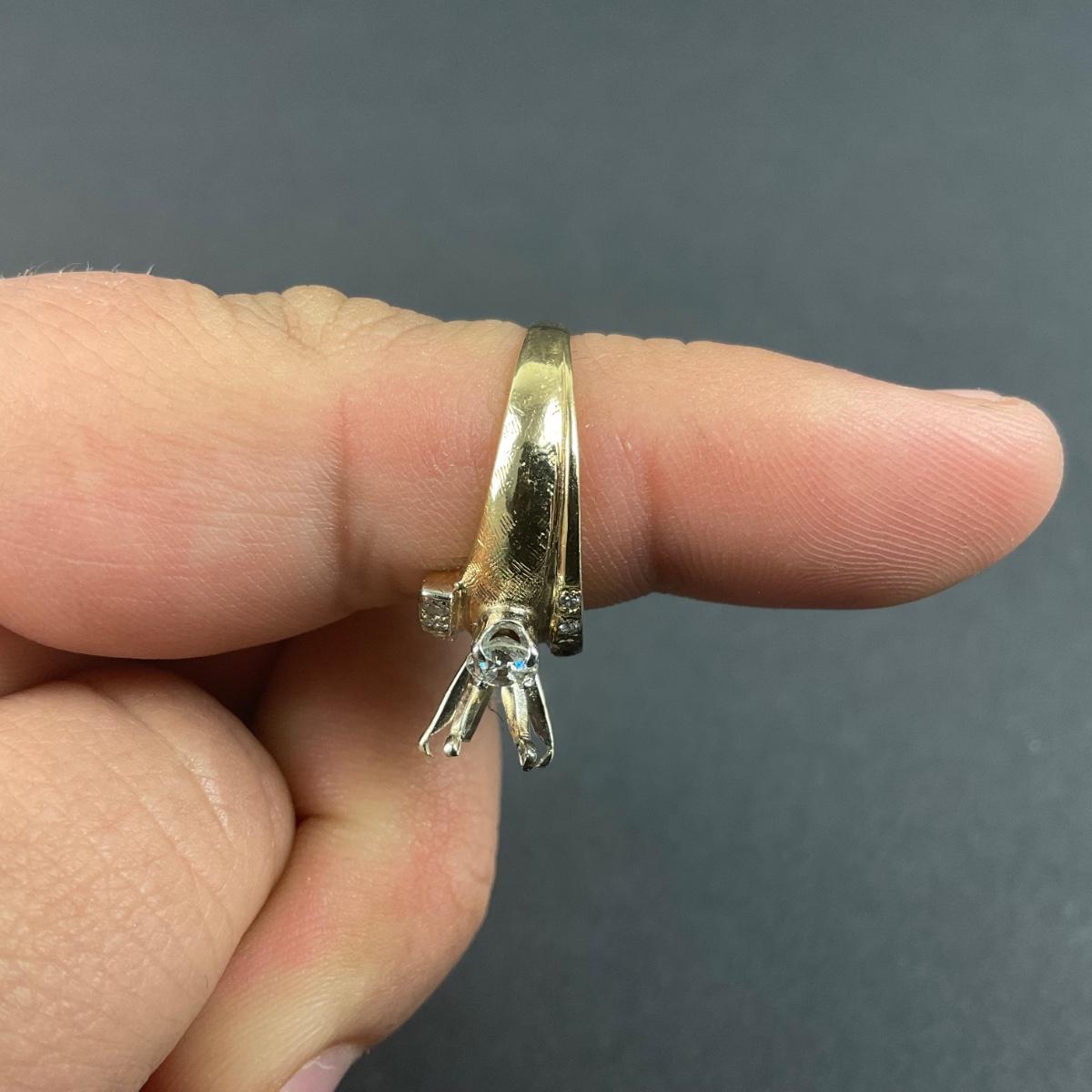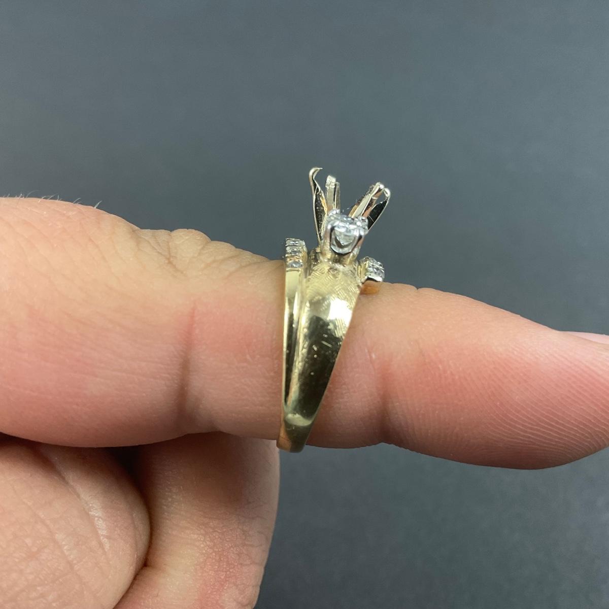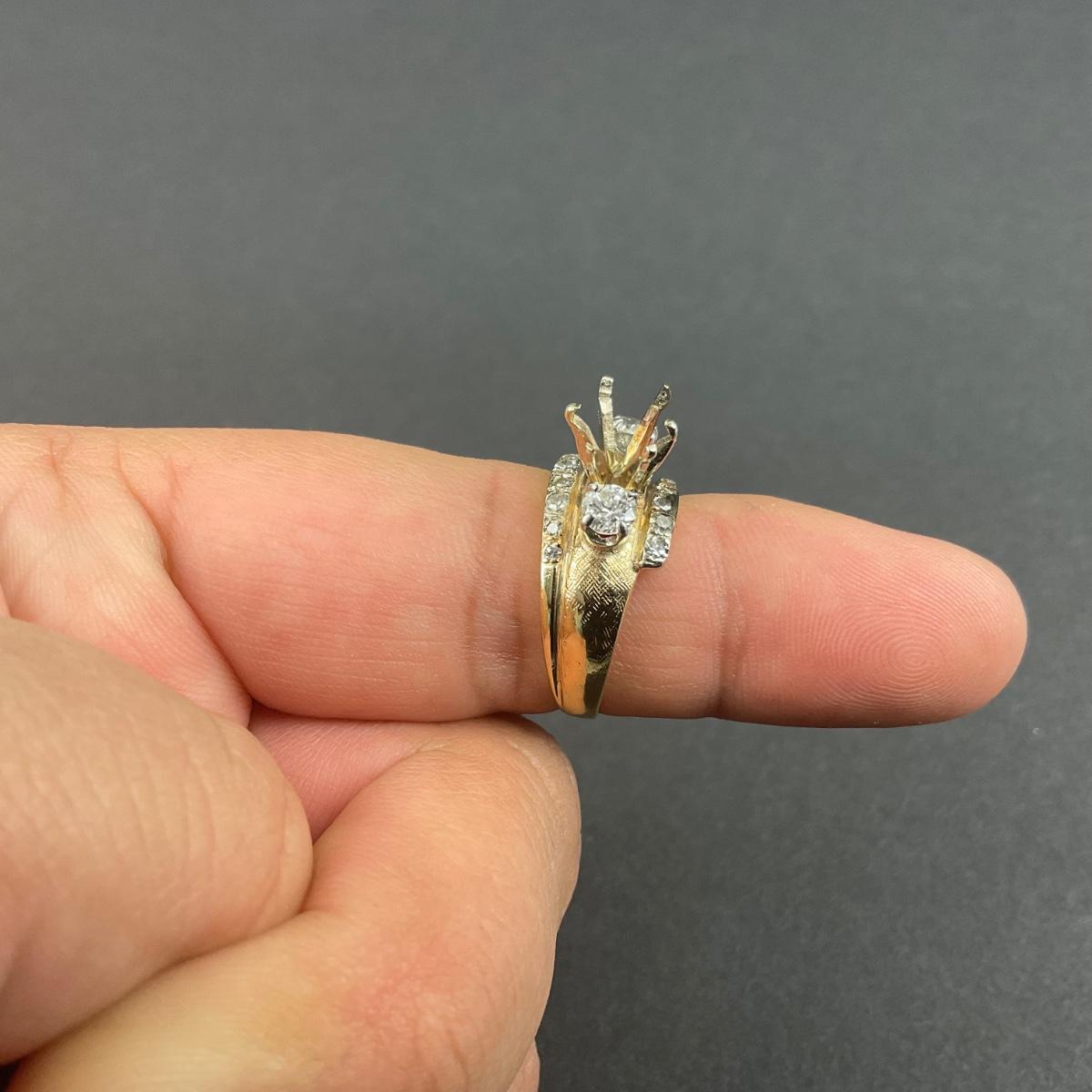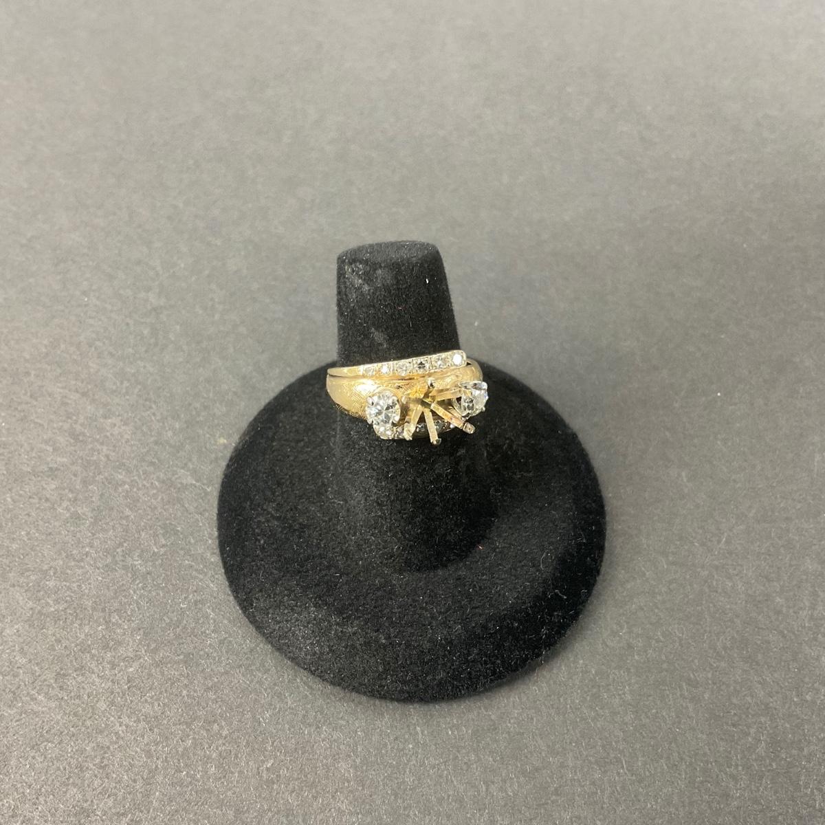 One vintage 14K yellow gold marked and diamond (Tested) ring. This piece is missing the center stone but has two 1/4 carat (Tested) diamonds and twelve smaller diamonds (Tested). This pieces total weight is 3.15 DWT. This ring is size 6 1/2. Please see photos for details and condition. Any condition statement is given as a courtesy to a client, is an opinion, and should not be treated as a statement of fact. Reference to condition written, oral or within a condition report shall not be regarded as a full account of condition and may not include all defects, alterations, or restorations. Absence of a condition report does not imply a lot is flawless or lacking imperfections or damage. Katherine’s Auction & Appraisal Service shall have no responsibility for any error or omission. Returns shall not be accepted on the basis of condition. ::: Shipping is available on this lot. If you require shipping you must let us know at the close of the auction. We will coordinate with you after the item has been won. Shipping fees will include insurance up to or exceeding the value of all items being mailed. If you have any questions regarding this lot please contact the auctioneer either via this website, by direct email or by phone. PICK UP TIMES and other important information can be found in the TERMS and DESCRIPTION of the auction. Please take a look for pertinent information. Thanks!
