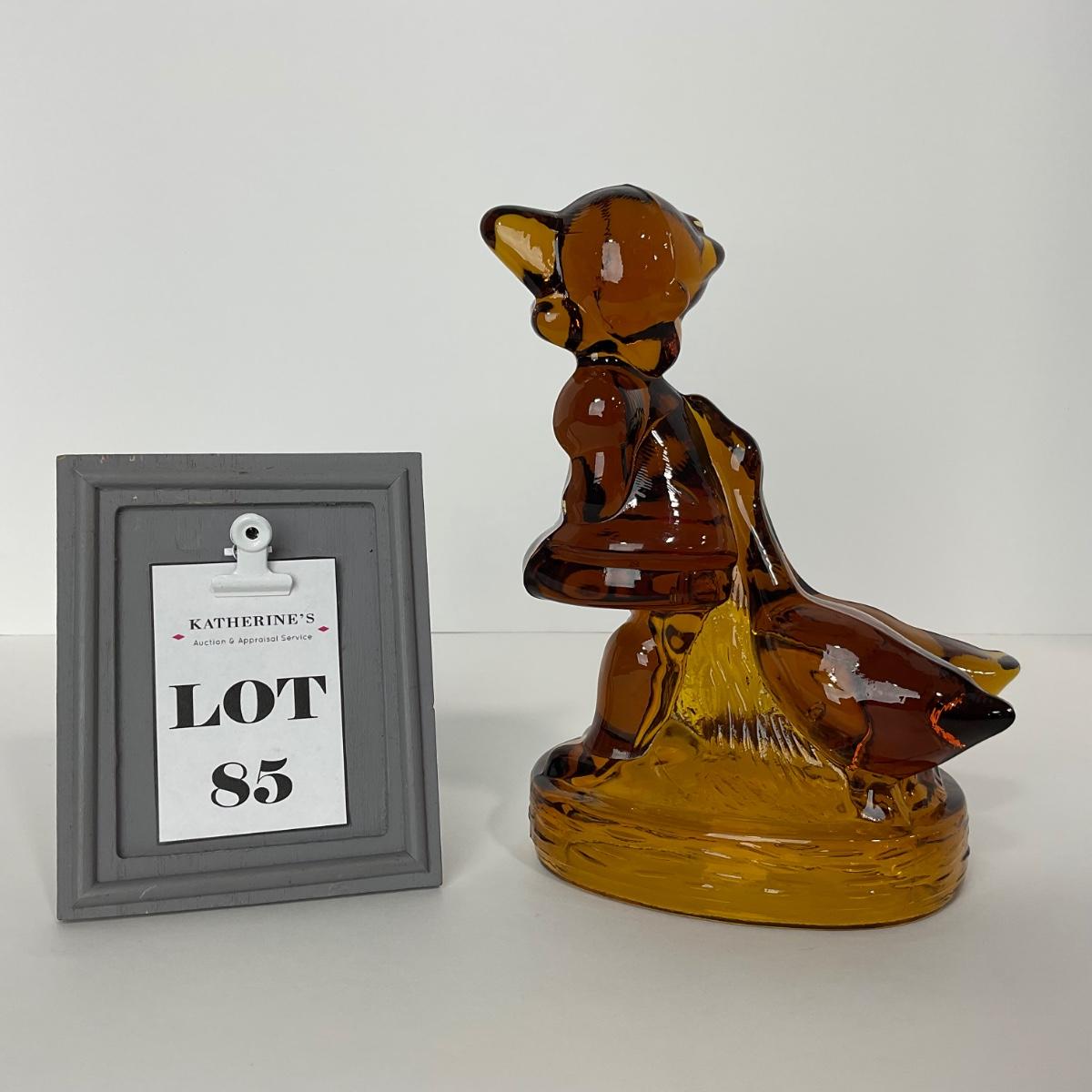 One amber colored LE Smith Goose and Girl figure. This piece has no damage, and appears to be in great shape with no visable chips, cracks, or broken pieces. 6 inches wide by 8 inches tall. Please see photos for details and condition. Any condition statement is given as a courtesy to a client, is an opinion, and should not be treated as a statement of fact. Reference to condition written, oral or within a condition report shall not be regarded as a full account of condition and may not include all defects, alterations, or restorations. Absence of a condition report does not imply a lot is flawless or lacking imperfections or damage. Katherine’s Auction & Appraisal Service shall have no responsibility for any error or omission. Returns shall not be accepted on the basis of condition. ::: Shipping is available on this lot. If you require shipping you must let us know at the close of the auction. We will coordinate with you after the item has been won. Shipping fees will include insurance up to or exceeding the value of all items being mailed. If you have any questions regarding this lot please contact the auctioneer either via this website, by direct email or by phone. PICK UP TIMES and other important information can be found in the TERMS and DESCRIPTION of the auction. Please take a look for pertinent information. Thanks!