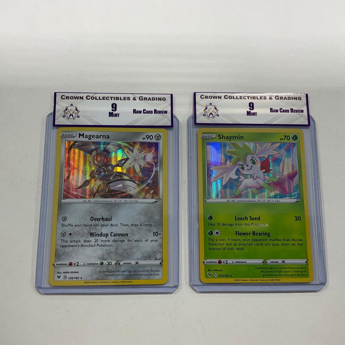 Five Pokémon Crown Collectible Raw Card Review cards including: Tape Koko Mint 9, Sologaleo Mint 9, Centiskorch Mint 9, Mageama Mint 9, and Shaymin Mint 9 cards. Please see photos for details and condition. ::: Shipping is available on this lot. If you require shipping you must let us know at the close of the auction. We will coordinate with you after the item has been won. Shipping fees will include insurance up to or exceeding the value of all items being mailed. If you have any questions regarding this lot please contact the auctioneer either via this website, by direct email or by phone. PICK UP TIMES and other important information can be found in the TERMS and DESCRIPTION of the auction. Please take a look for pertinent information. Thanks!