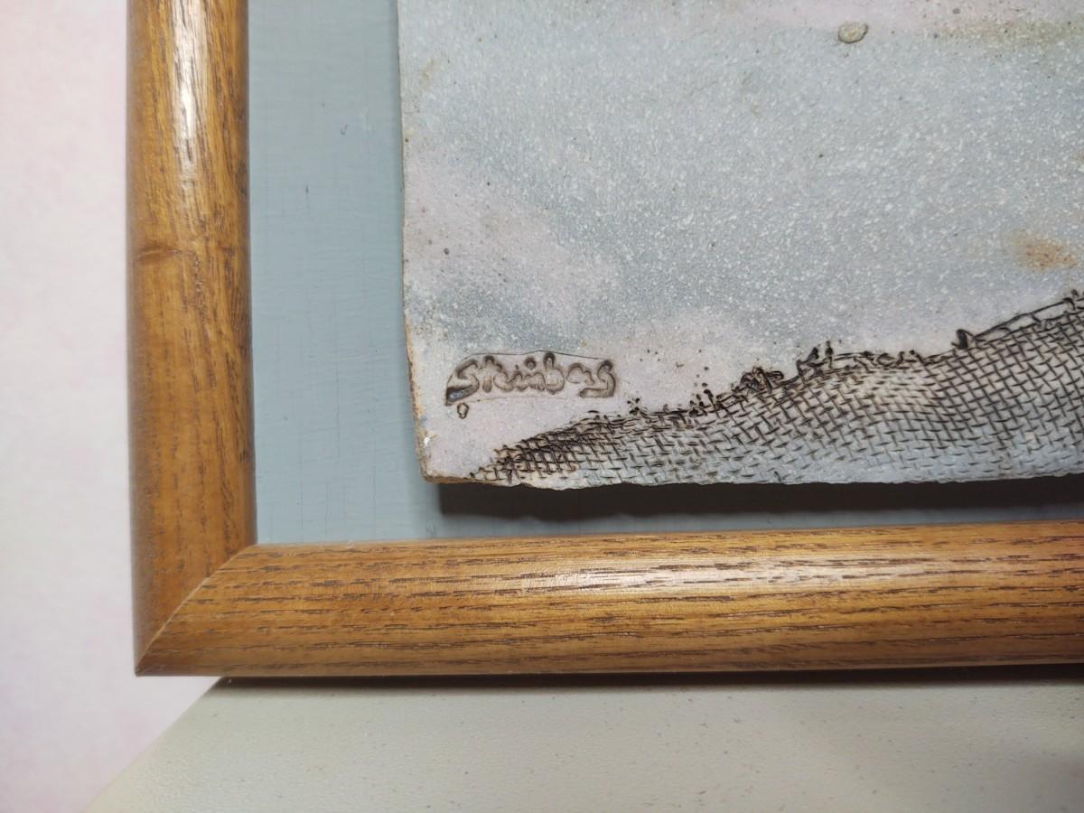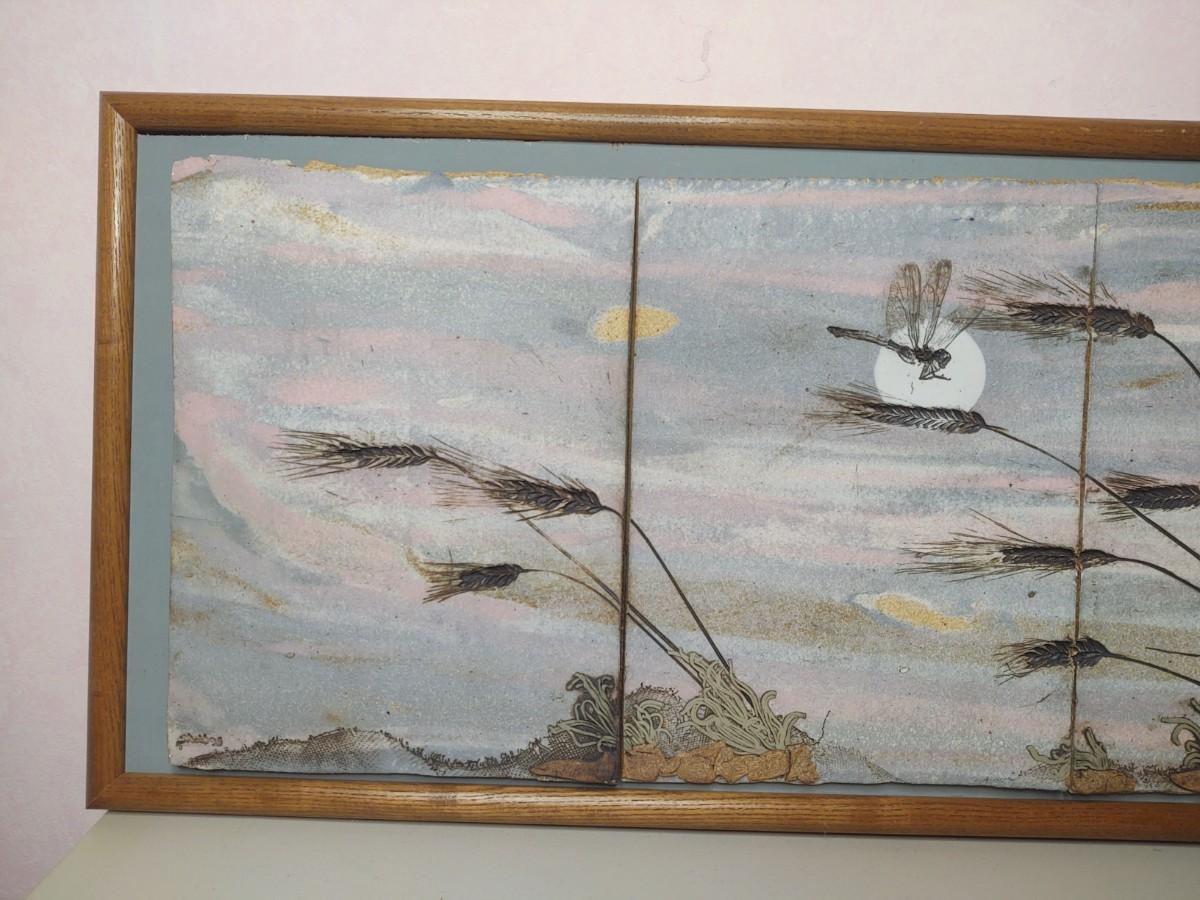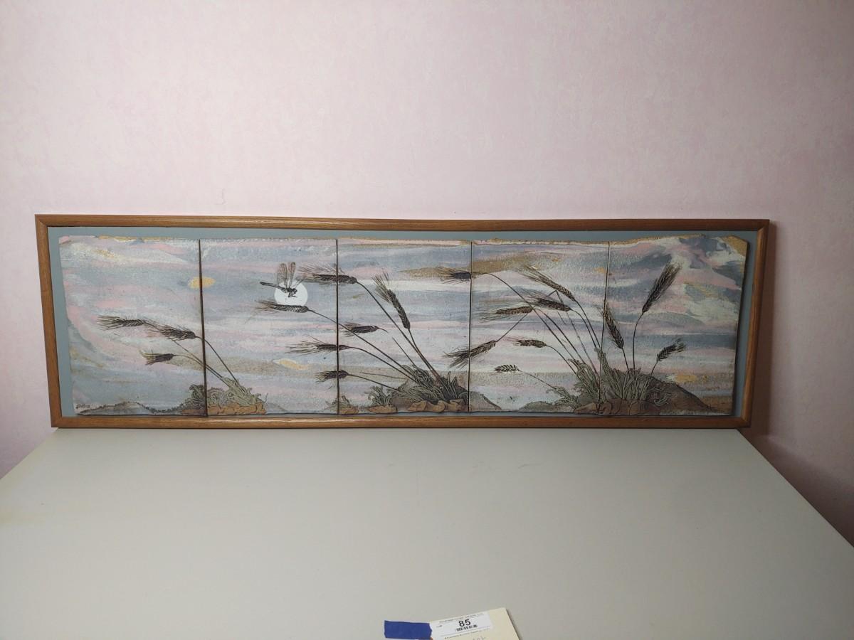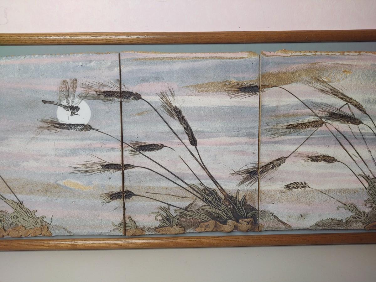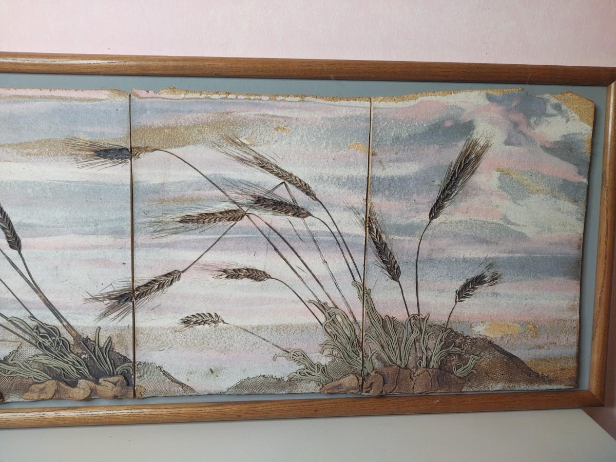 5 pieces of slate conjoined and painted work a wheat field motif. Very heavy! 49x15 Signature appears to be 'Steinberg'.