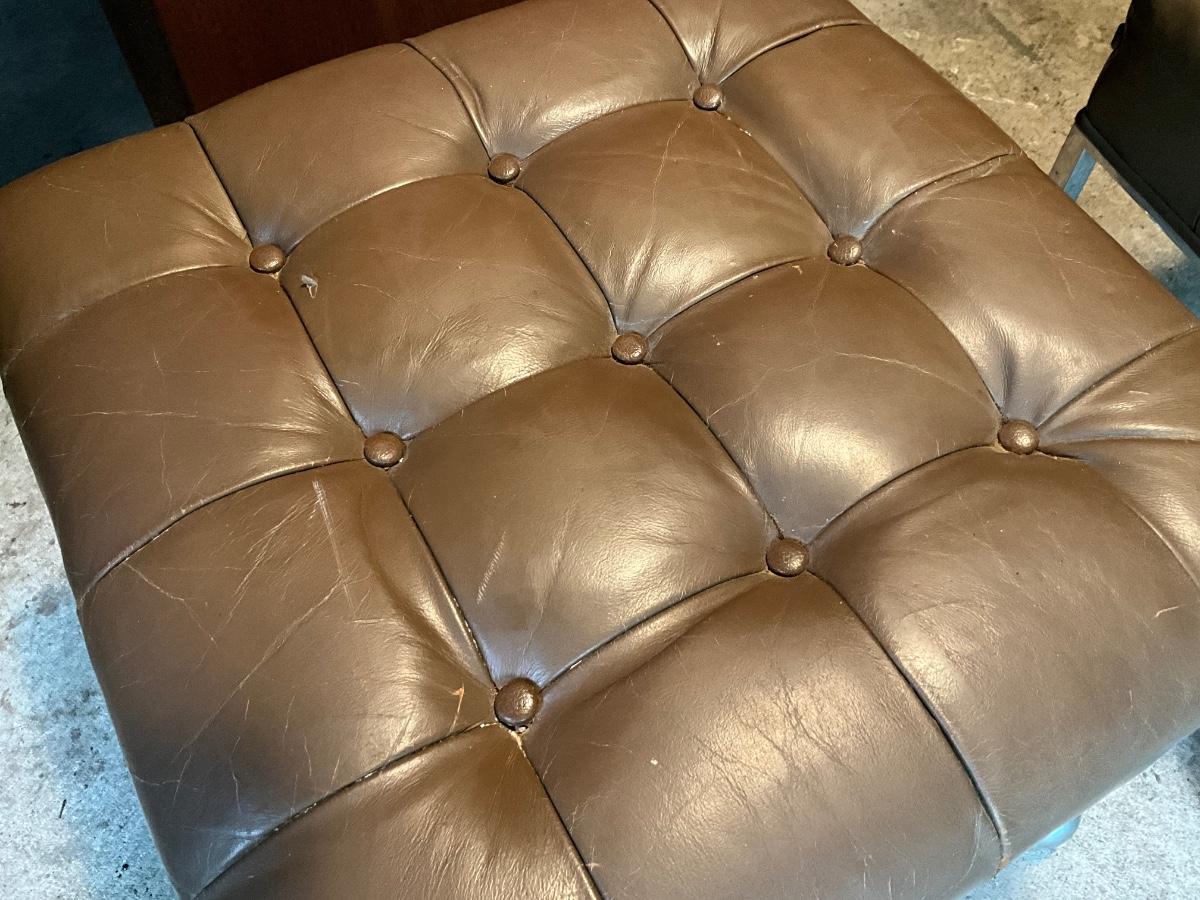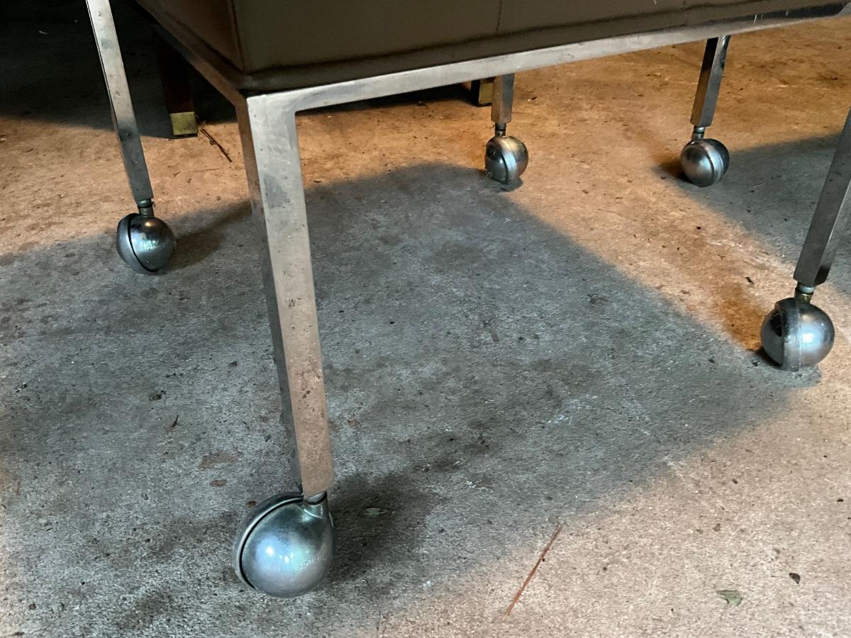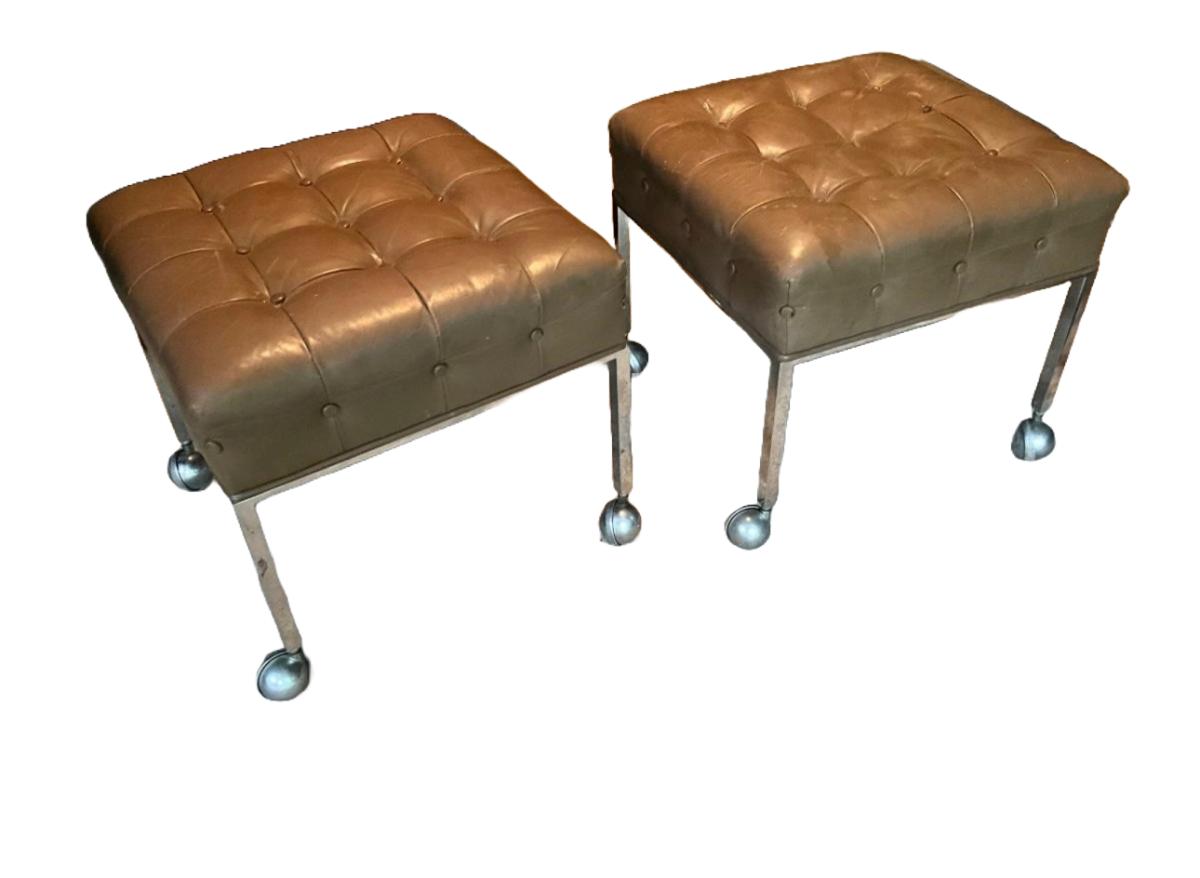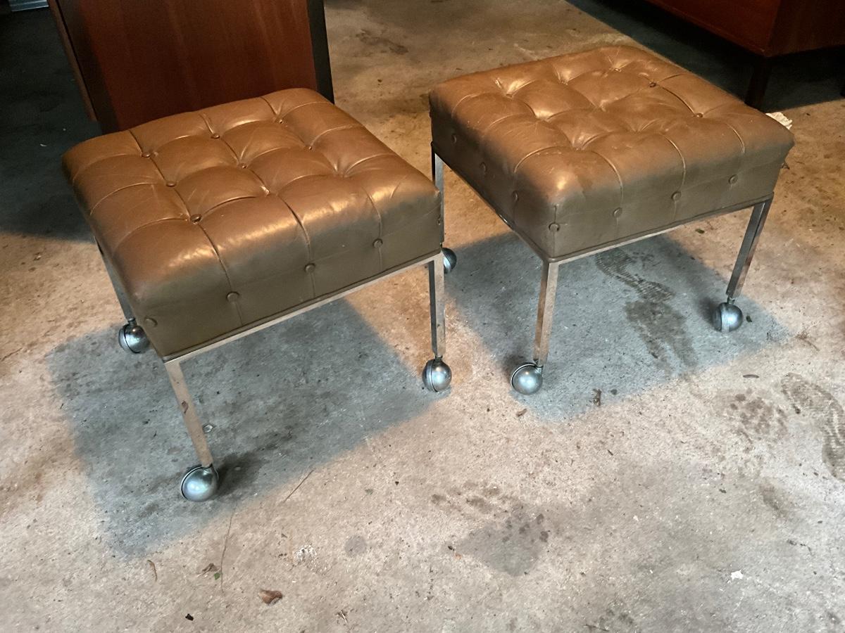 850 Pair Mid Century Modern Gray Tufted Chrome Rolling Ottomans