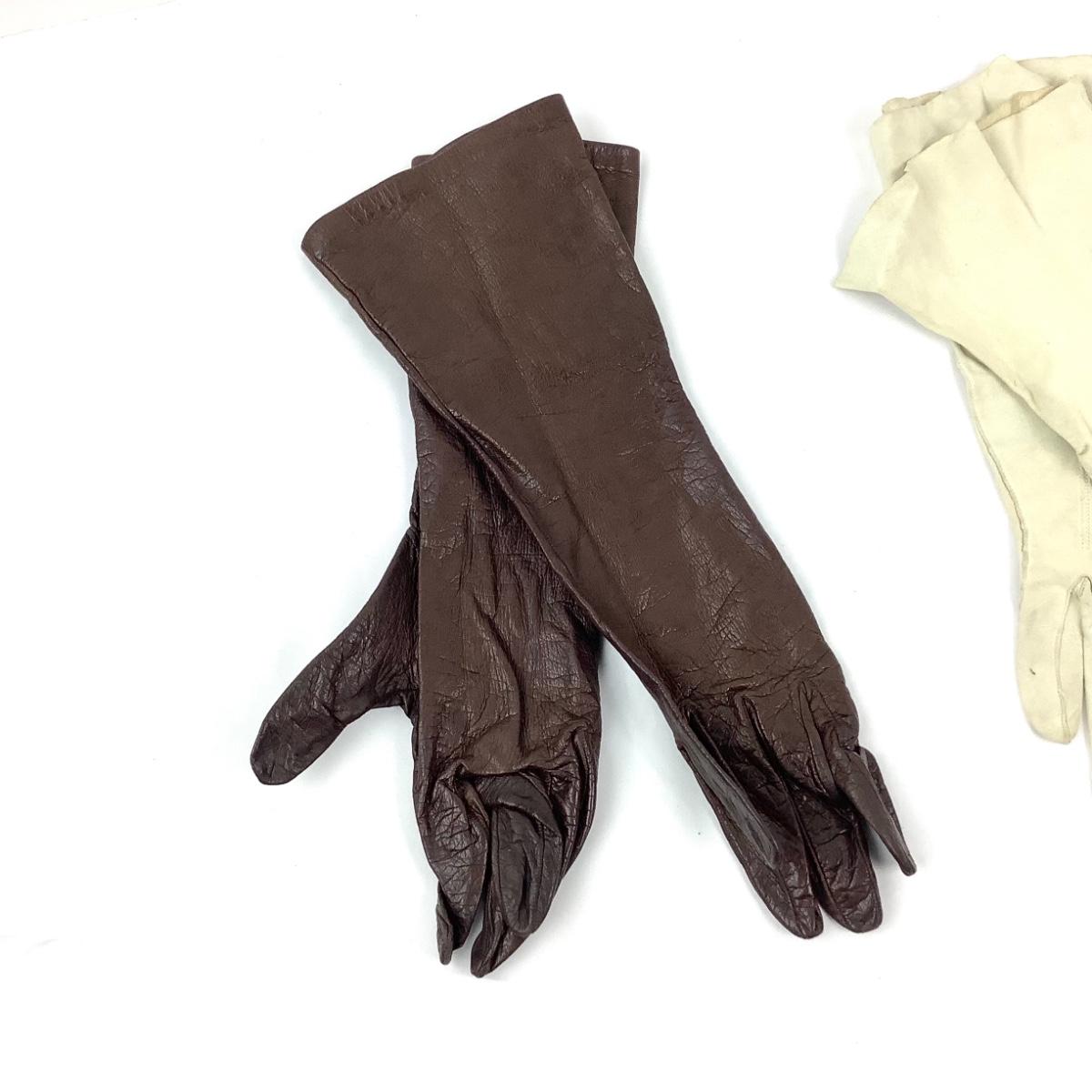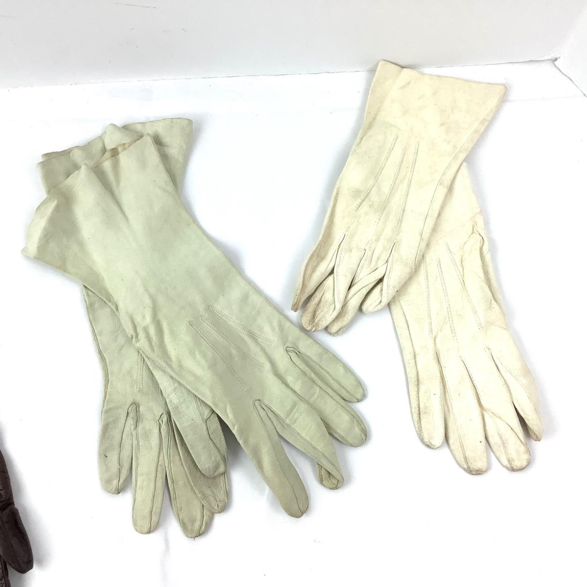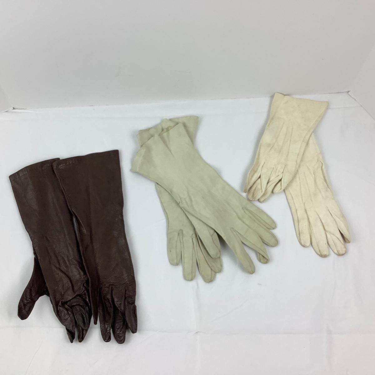 There are 3 pairs of gloves in this lot. The Saks Fifth Ave. are brown leather, size 7. Cream gloves are washable doe, made in England for sale in Bermuda, there are areas of red discoloration. The light mint colored gloves are leather, size 6.5 with signs of use and wear.