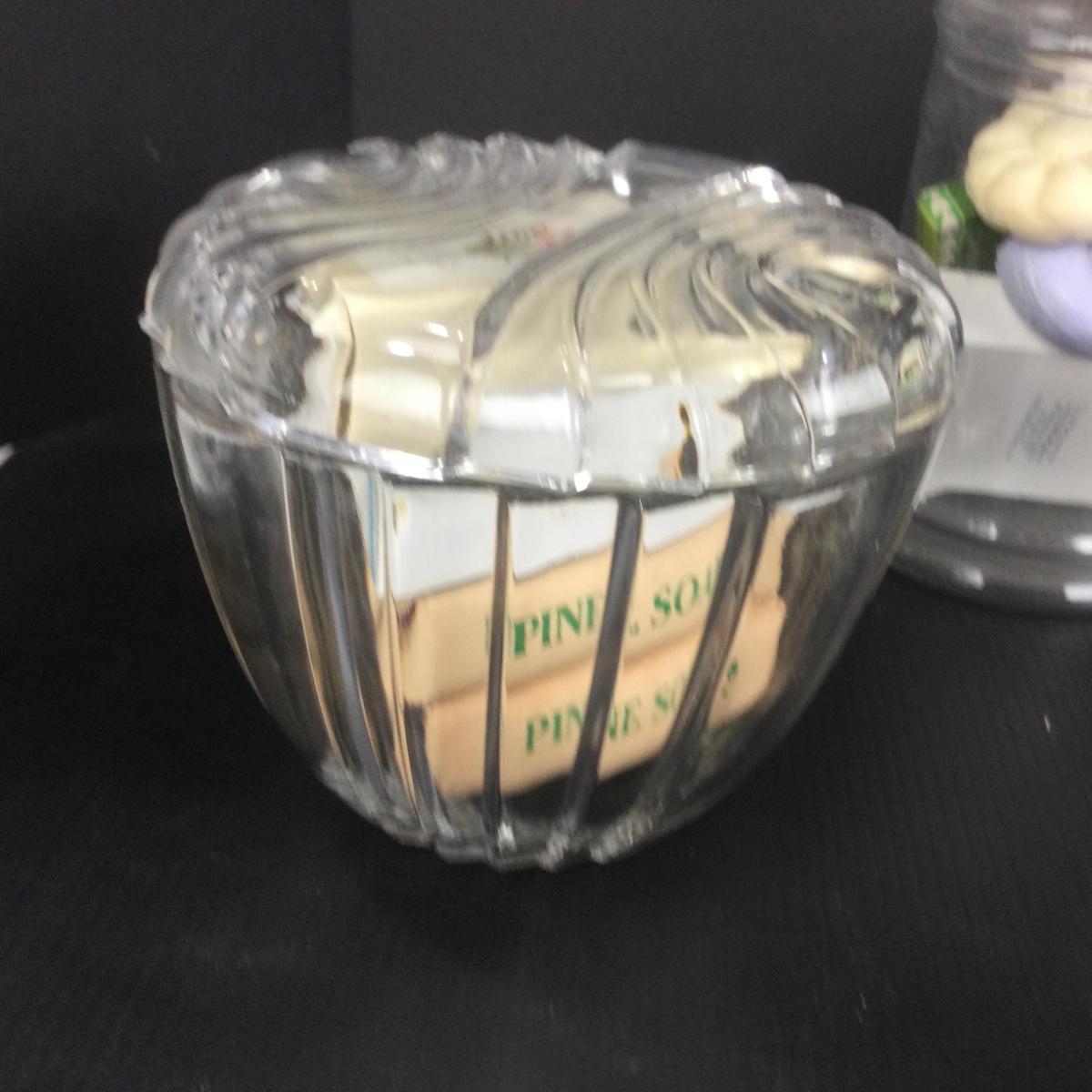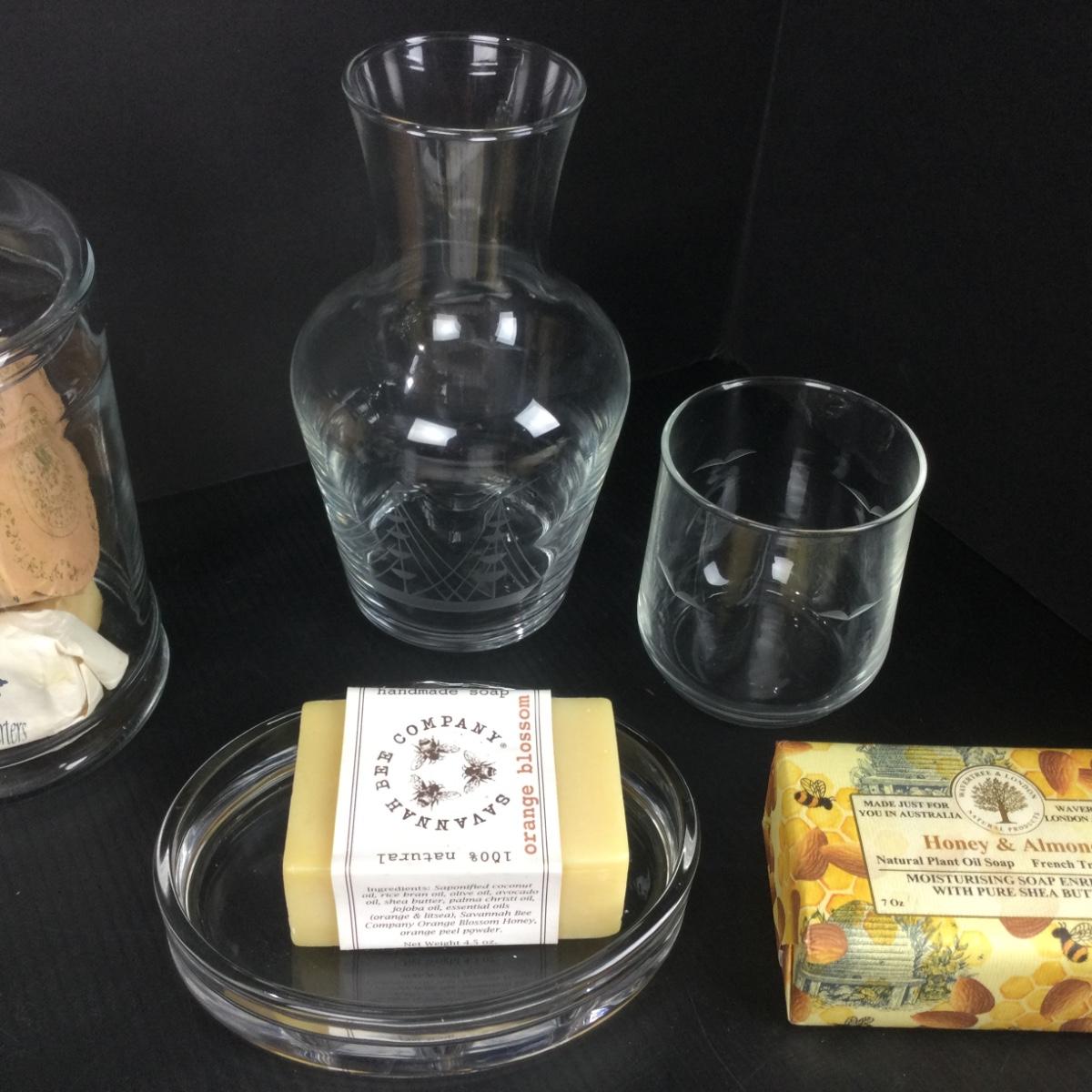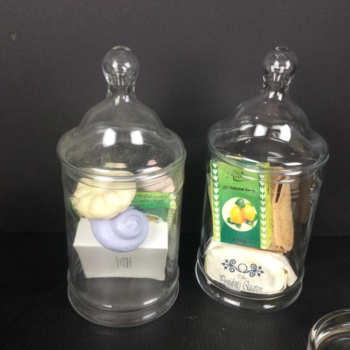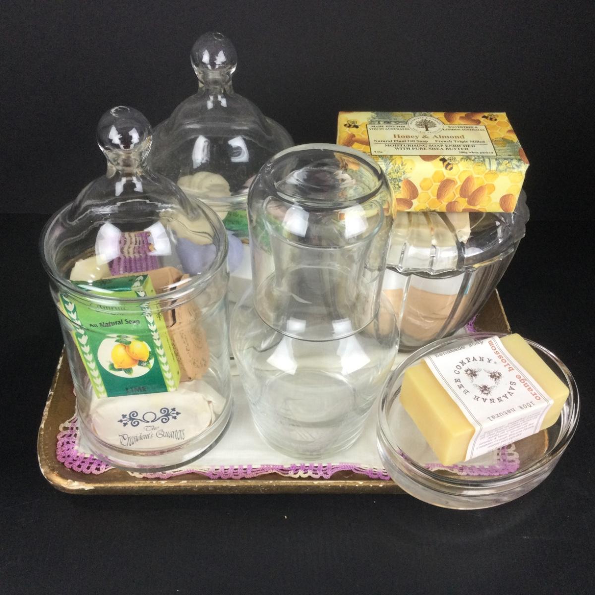 Water carafe with cup top is glass and has a ship etched on it, assorted various high end soaps and glass jars with lids.