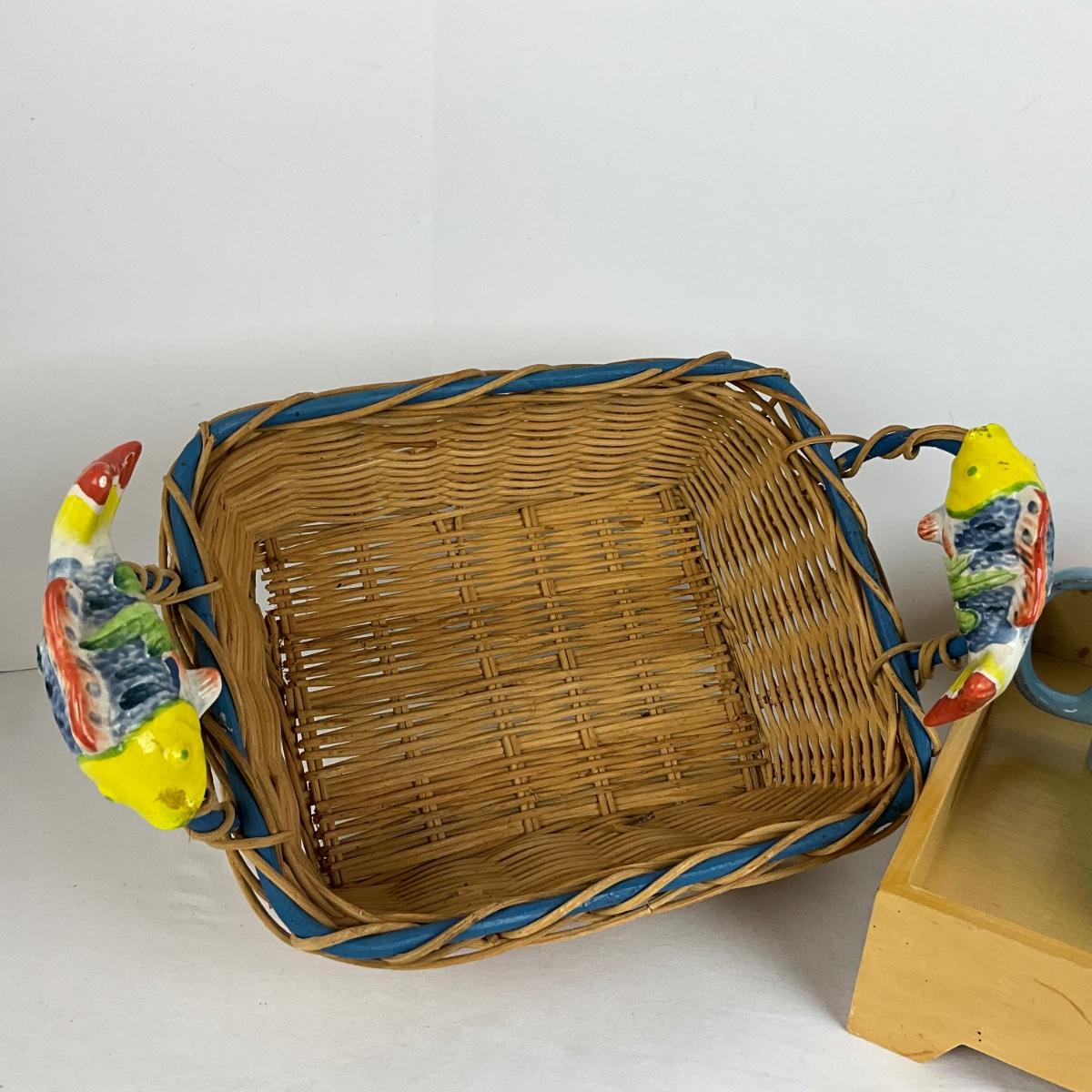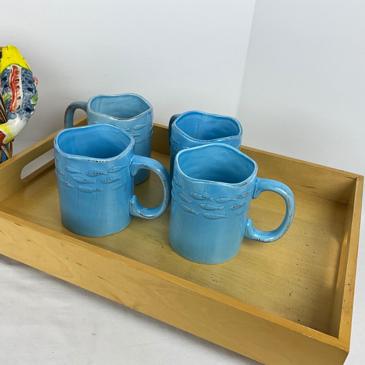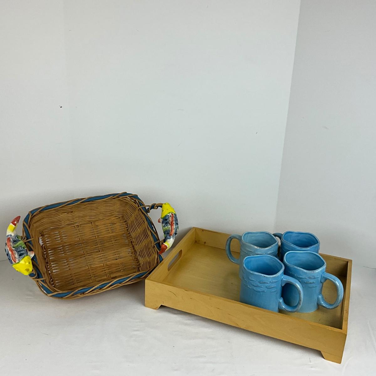 ceramic handled fish basket with 4 blue fish mugs and bamboo serving tray, the basket measures 16” x 10” x 11”.
