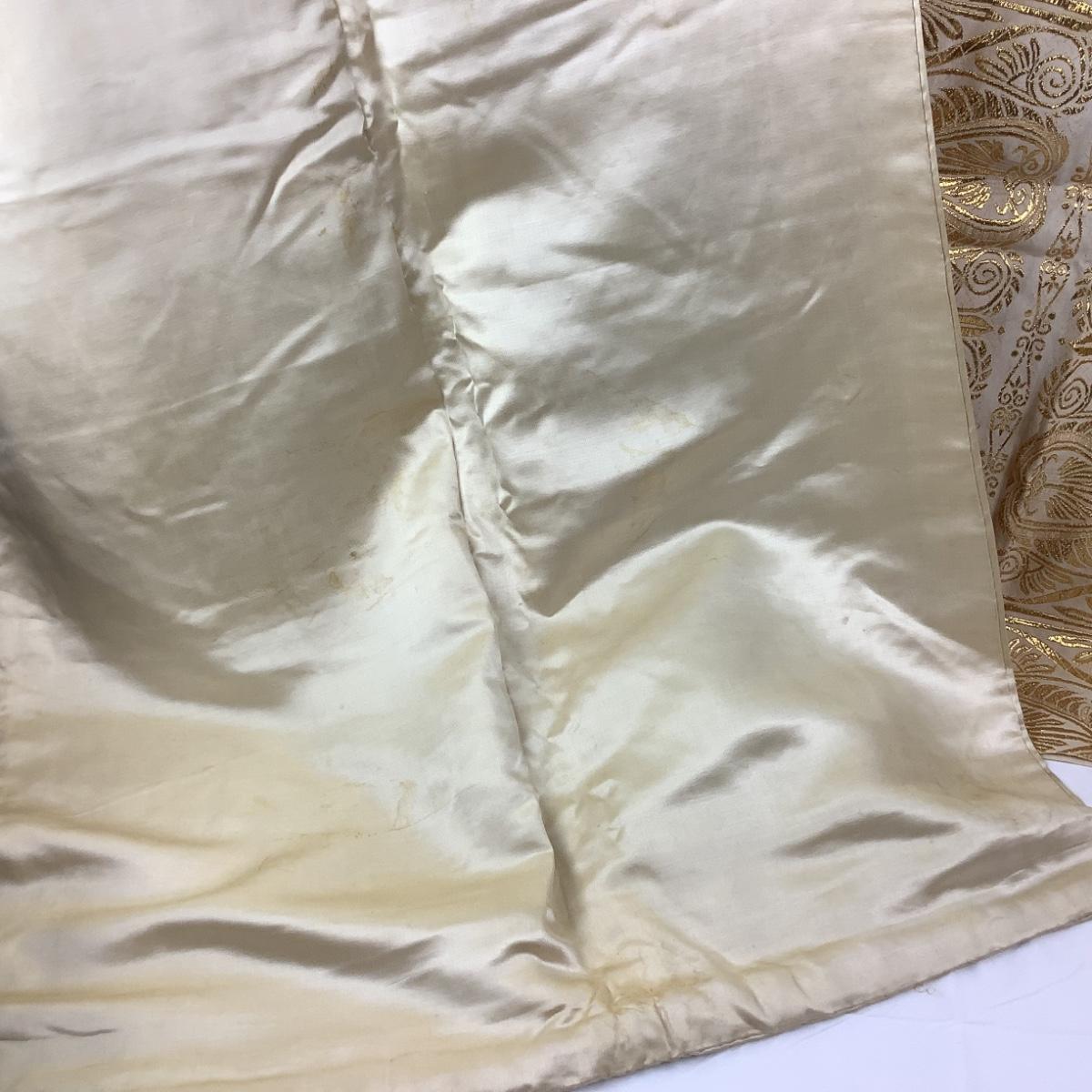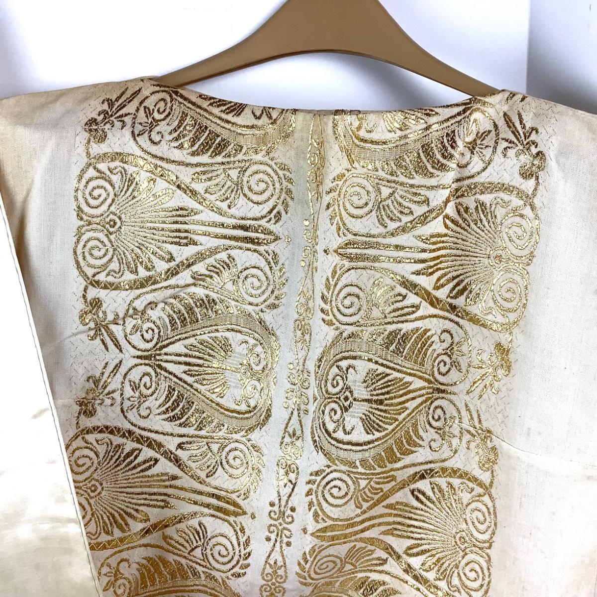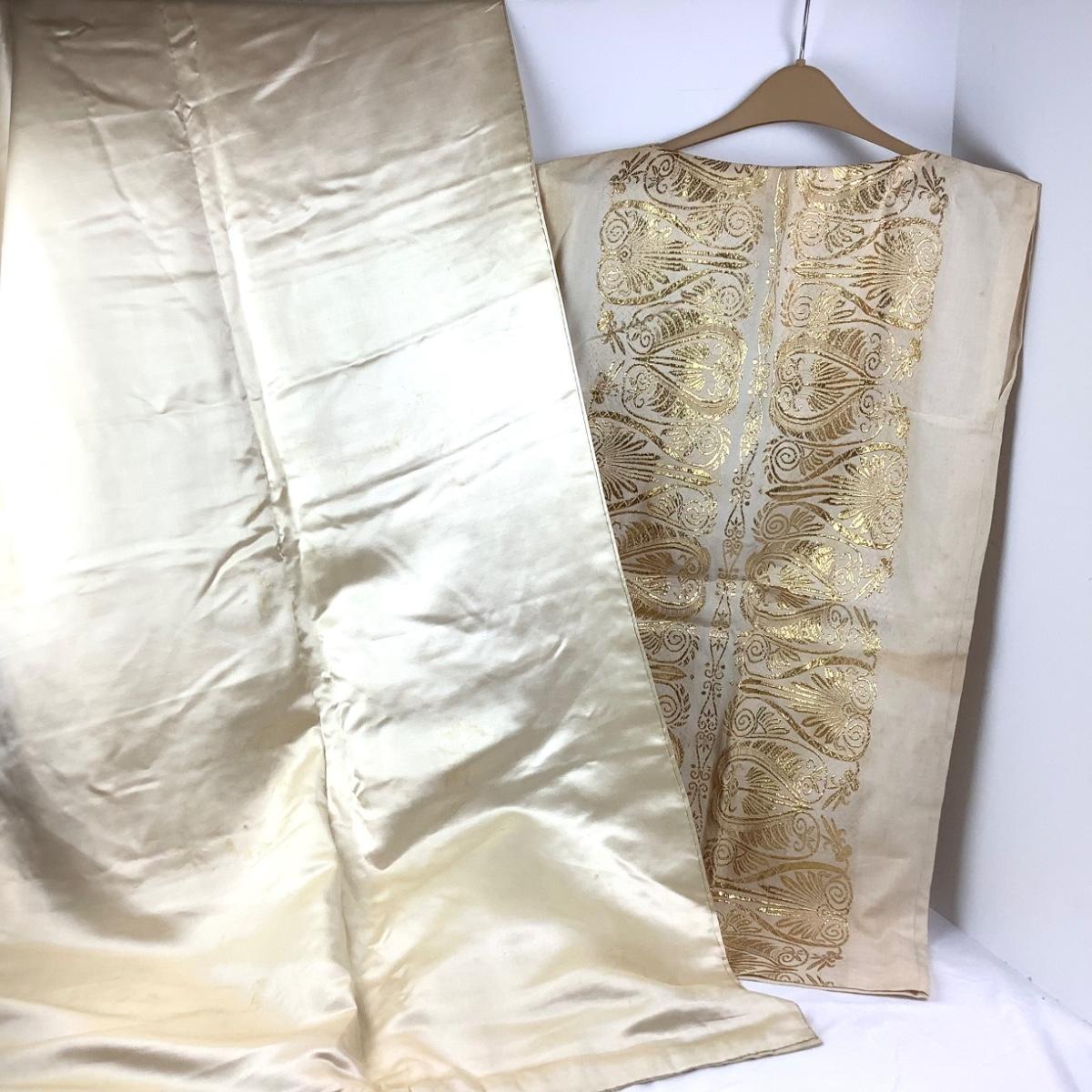 The tunic is sleeveless, metallic gold embroidered design, measures 19.5" from armpit to armpit and 35" overall length. The satin shawl is cream colored with spots and areas of discoloration.
