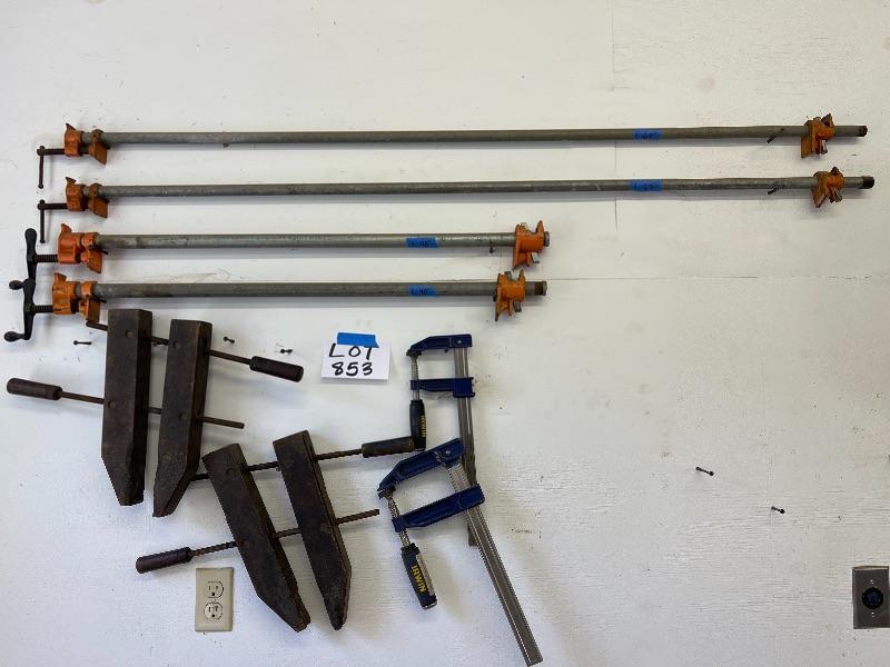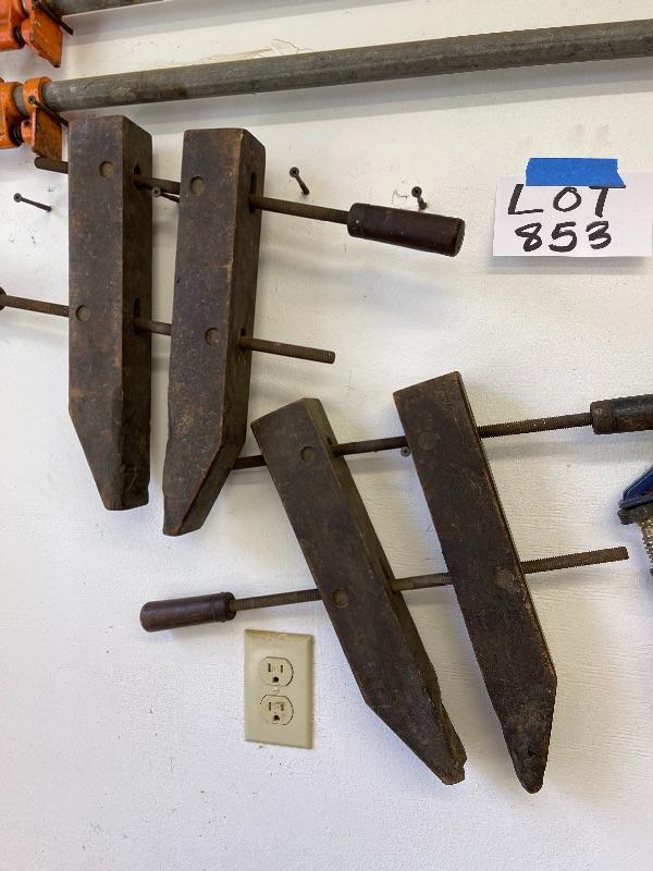 Qty (2) Vintage wooden clamps and Qty (6) medal clamps