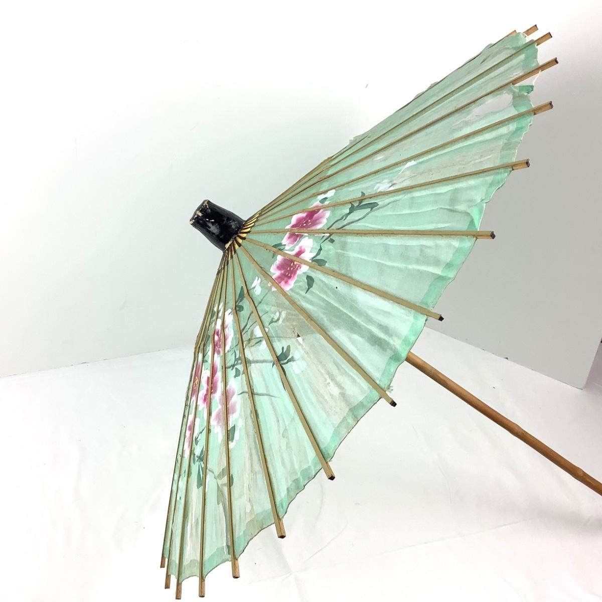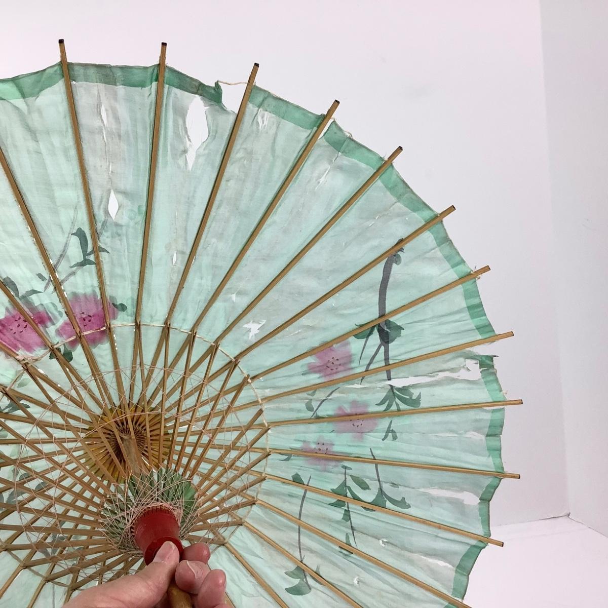 Signs of wear, and holes in the silk, beautiful floral motif, handle and slats are all bamboo. The parasol measures 25" tall.
