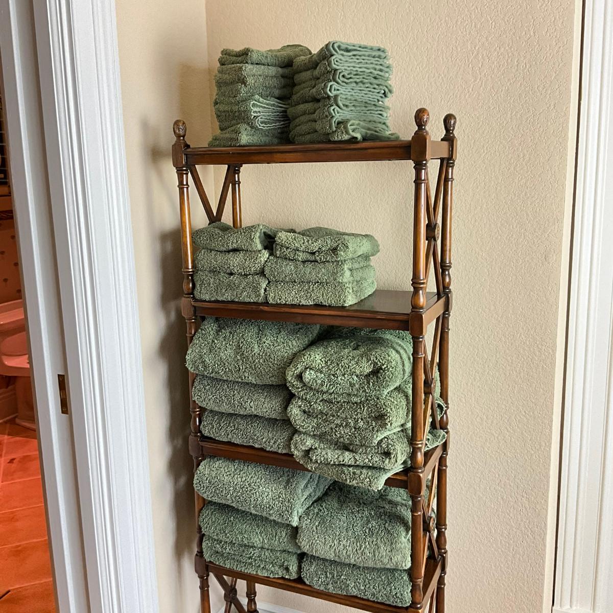 Six hand towels, eleven wash cloths, and eleven bath towels