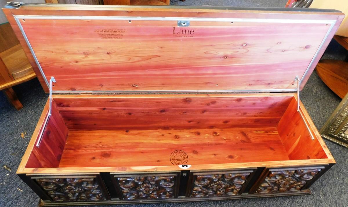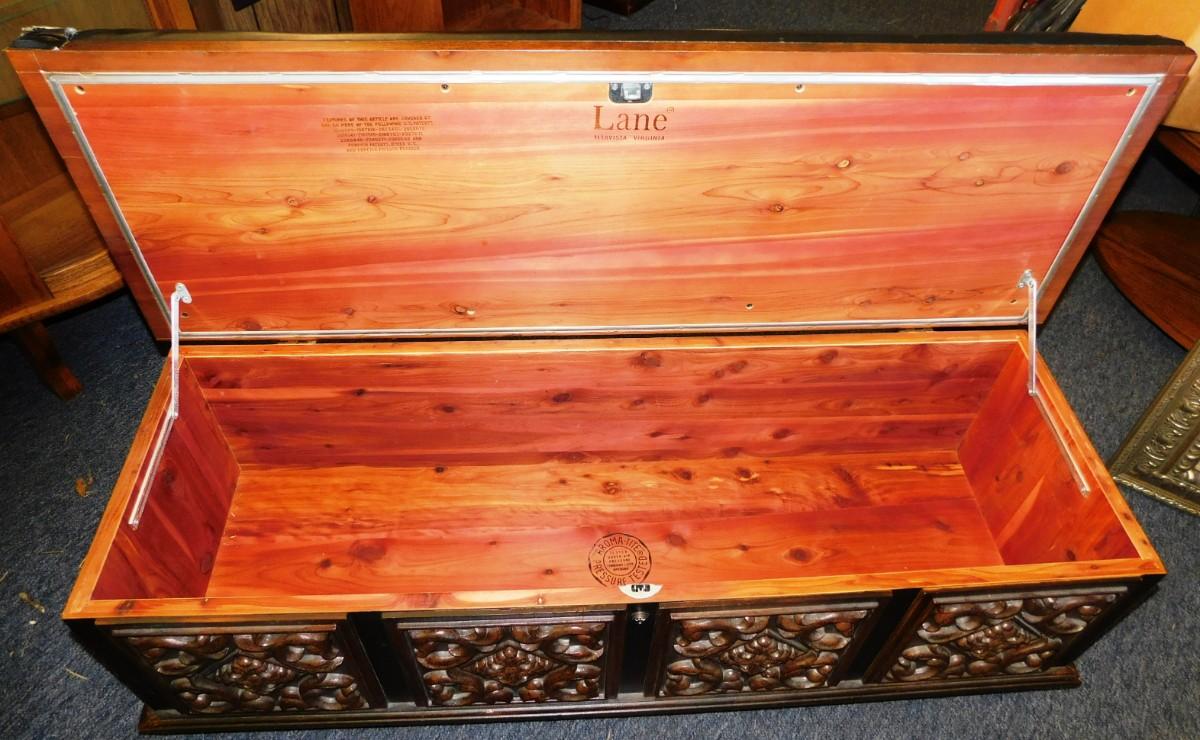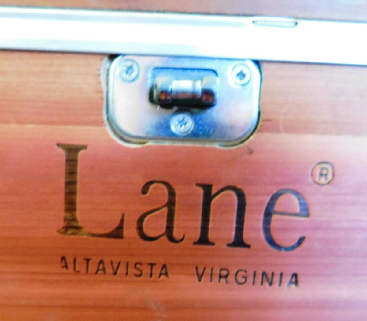 85A Lane Cedar Chest with Cushion. Cushion has damage on front left corner & has been taped but easy recover ~ really nice clean chest 48 x 16 1/2 x 16