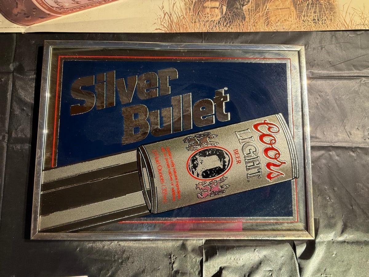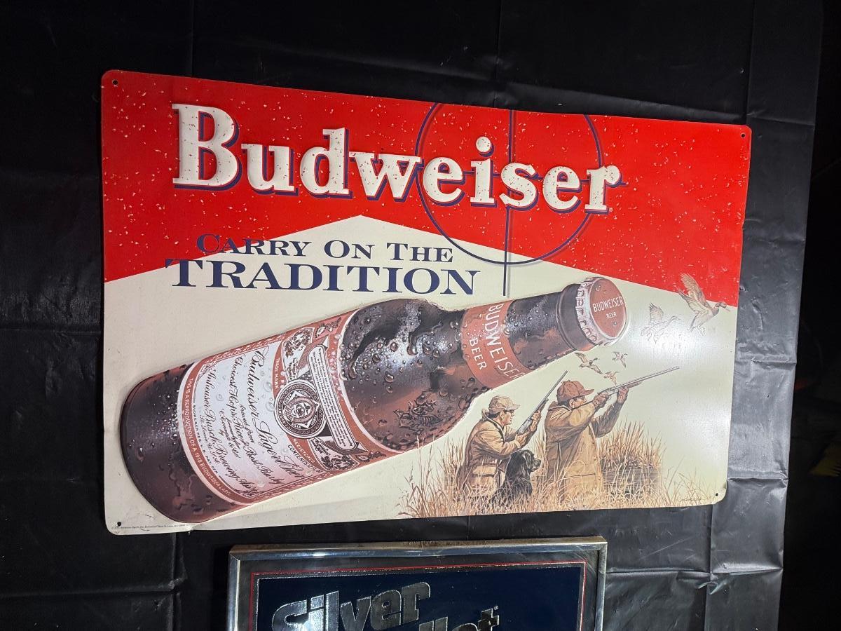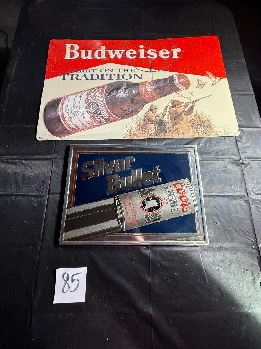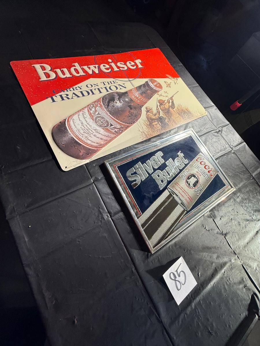 85-Metal beer, sign, and framed mirrored sign