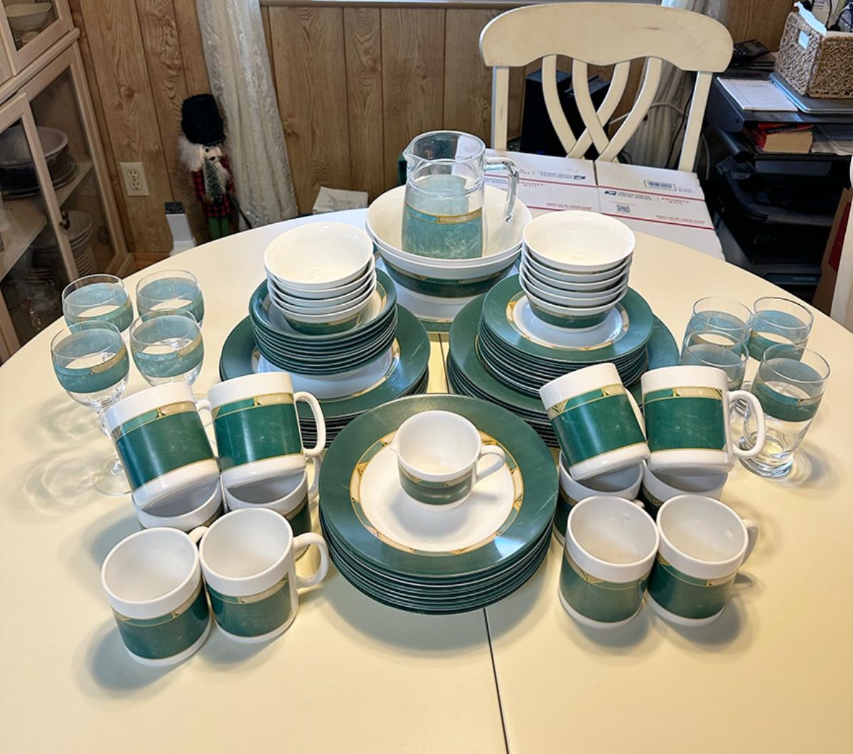 10 Dinner Plates, 10 Lunch Plates, 12 Bread Salad Plates, 10 Rim Soup Bowls, 10 Cereal Bowls, 11 Fruit Bowls, 12 Coffee Mugs, 4 Wine Glasses, 4 Water Glasses, 2 Round Serving Bowls, 12" Round Platter, Glass Milk Pitcher, and Creamer.