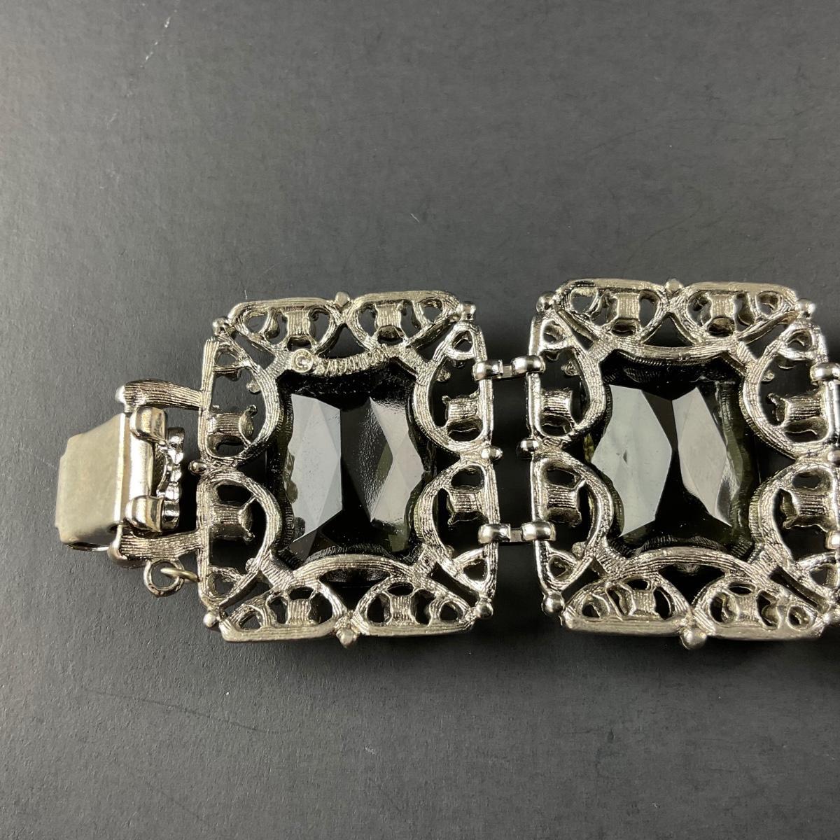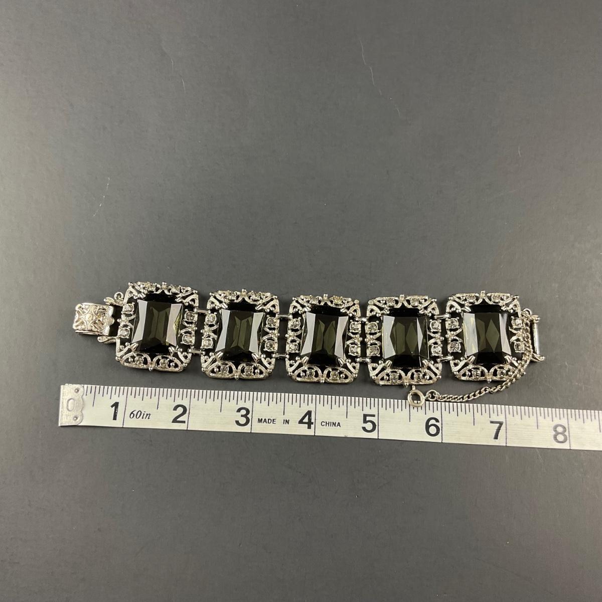 One set of marked Sarah Coventry black stone pendant, bracelet, and earrings. One of the earrings is missing the clip Ana’s damaged. Please see photos for details and condition. Any condition statement is given as a courtesy to a client, is an opinion, and should not be treated as a statement of fact. Reference to condition written, oral or within a condition report shall not be regarded as a full account of condition and may not include all defects, alterations, or restorations. Absence of a condition report does not imply a lot is flawless or lacking imperfections or damage. Katherine’s Auction & Appraisal Service shall have no responsibility for any error or omission. Returns shall not be accepted on the basis of condition. ::: Shipping is available on this lot. If you require shipping you must let us know at the close of the auction. We will coordinate with you after the item has been won. Shipping fees will include insurance up to or exceeding the value of all items being mailed. If you have any questions regarding this lot please contact the auctioneer either via this website, by direct email or by phone. PICK UP TIMES and other important information can be found in the TERMS and DESCRIPTION of the auction. Please take a look for pertinent information. Thanks!