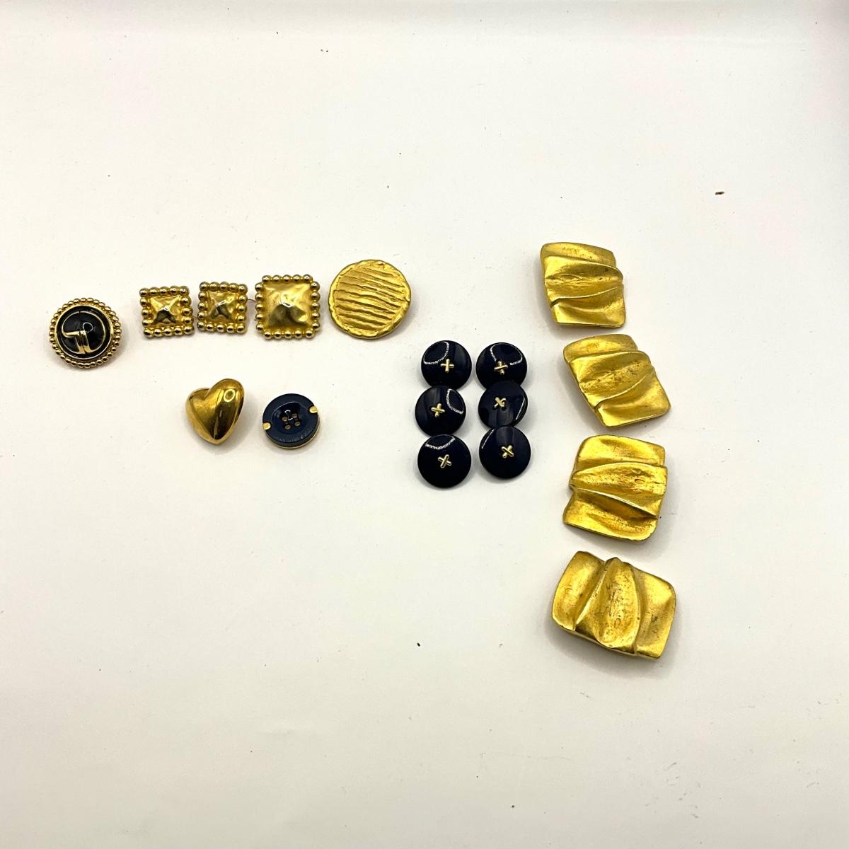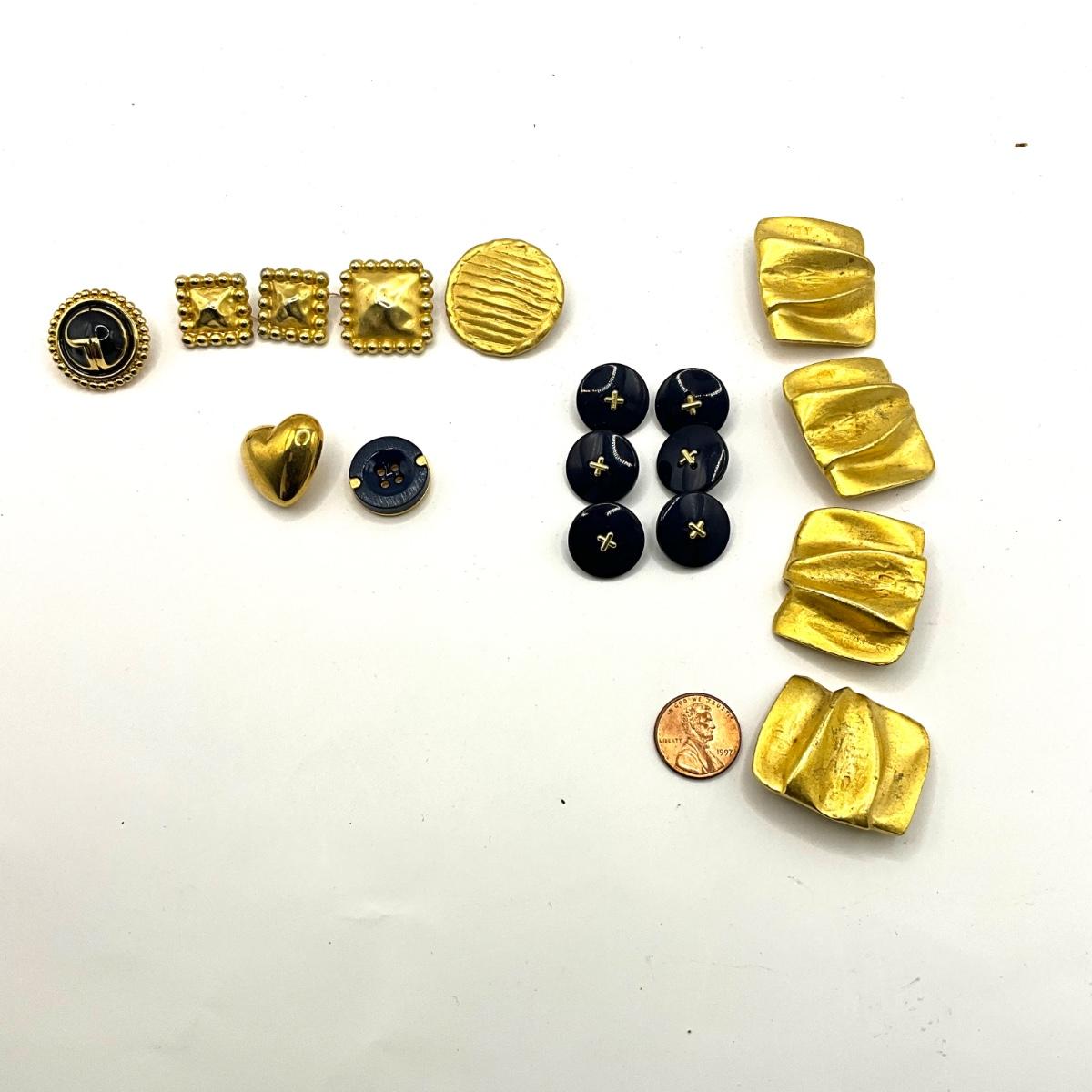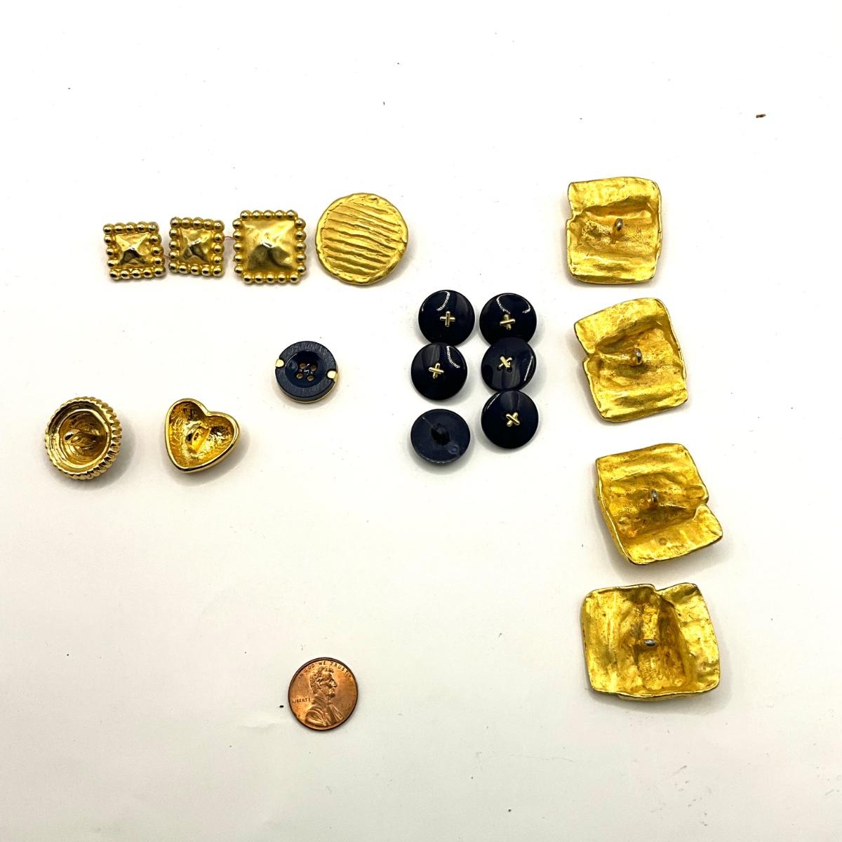 Set of 4 large gold tone buttons with 6 navy blue and gold X set of 6 buttons , one saint john button, large heart button and more