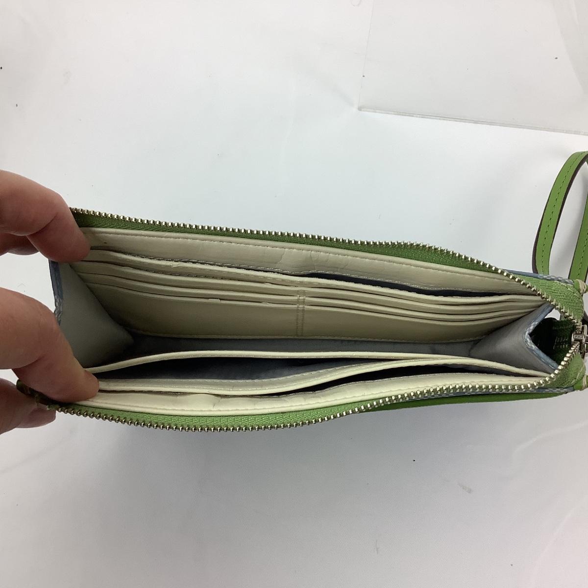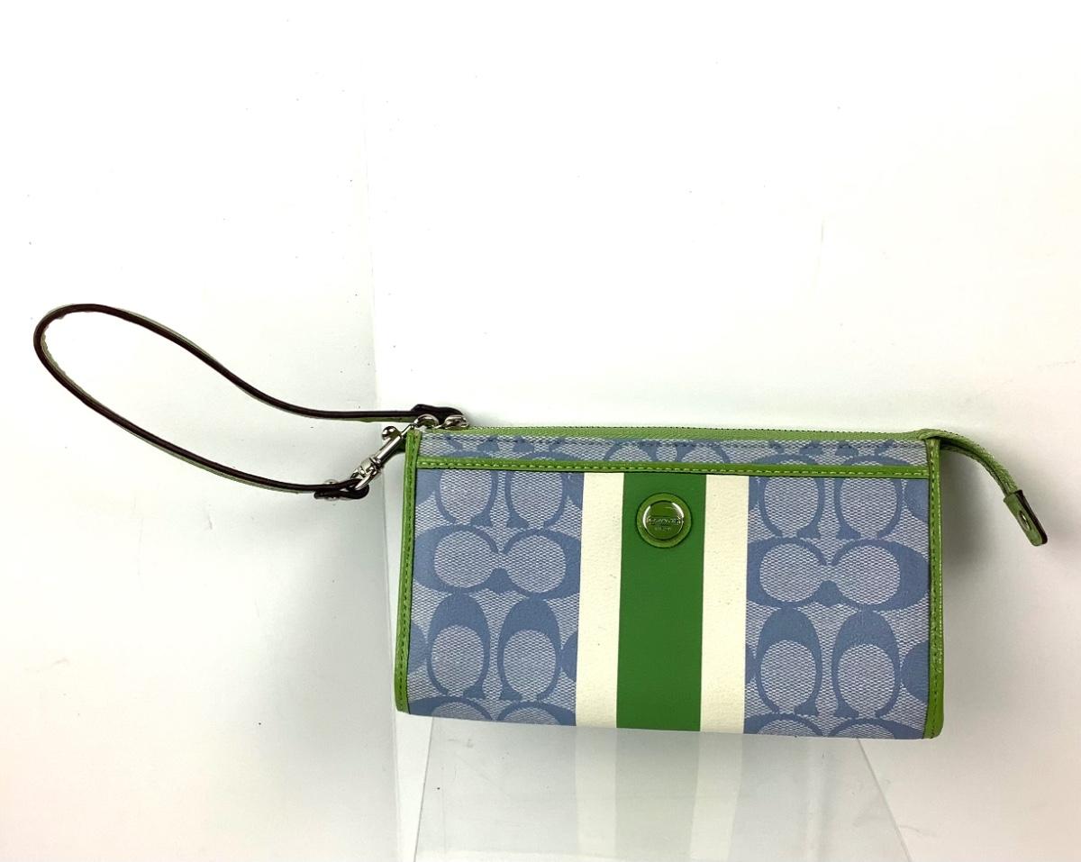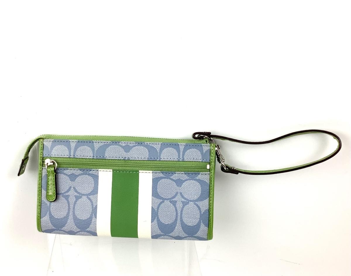 The wristlet is blue, green and tan. It measures 8” x 4,5”.