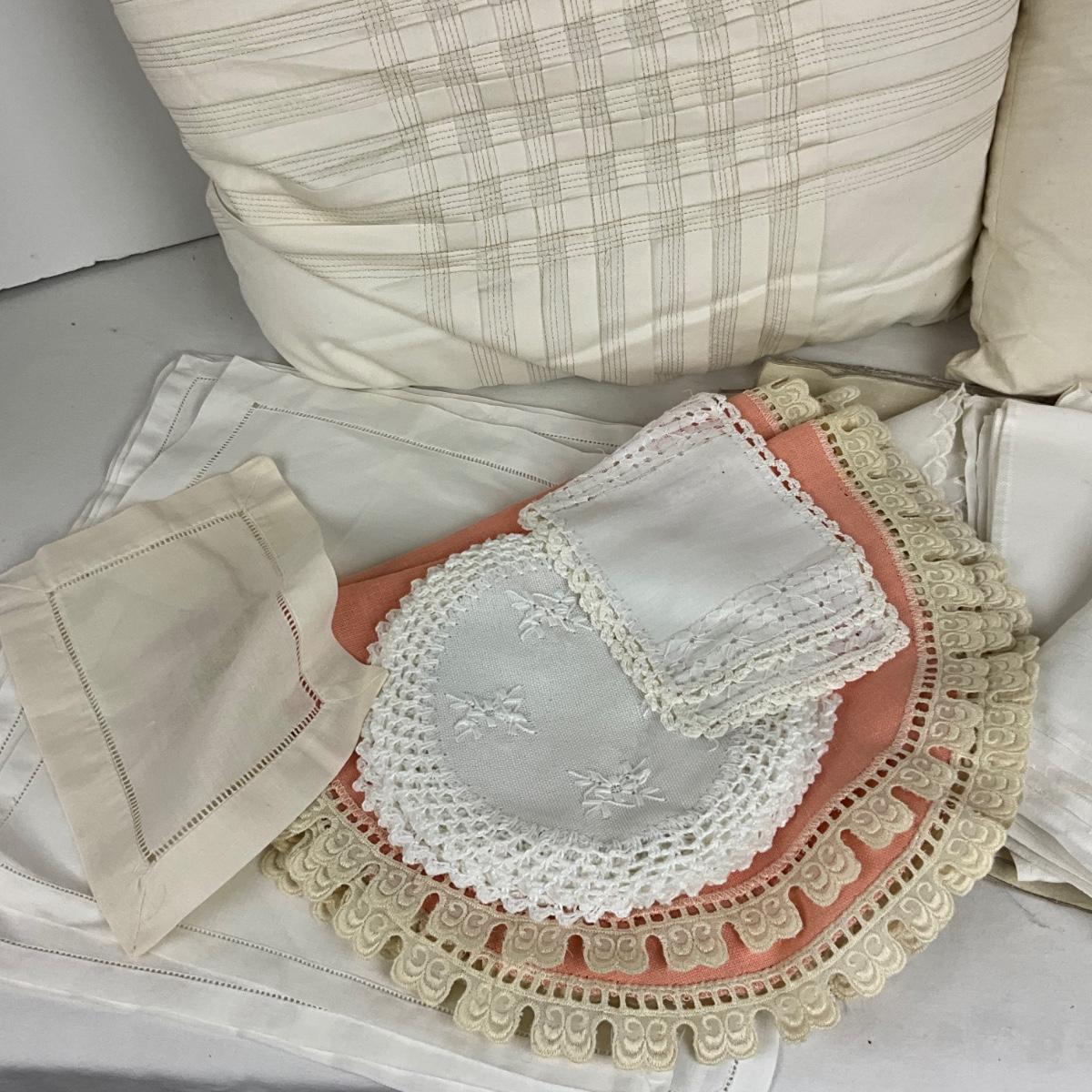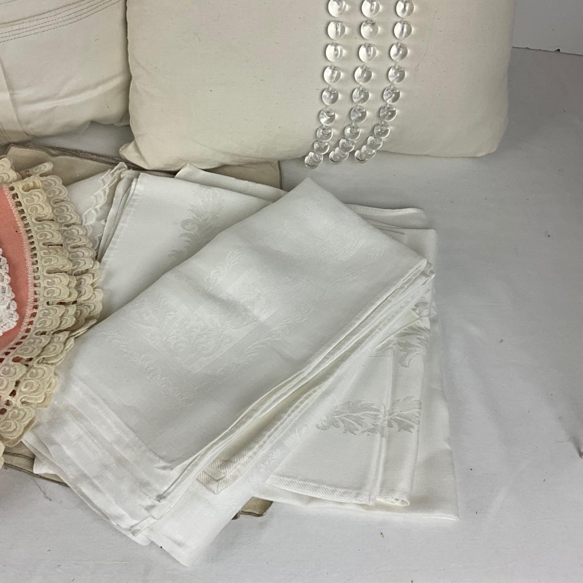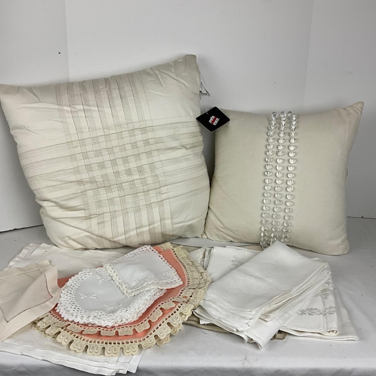 866 Pair of White Decorative Pillows with Assorted Doilies and Tea Towels
