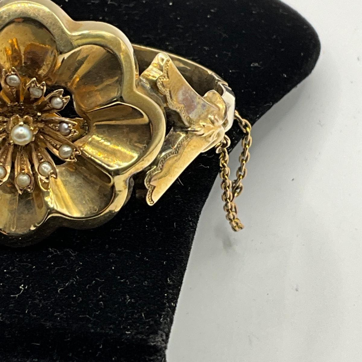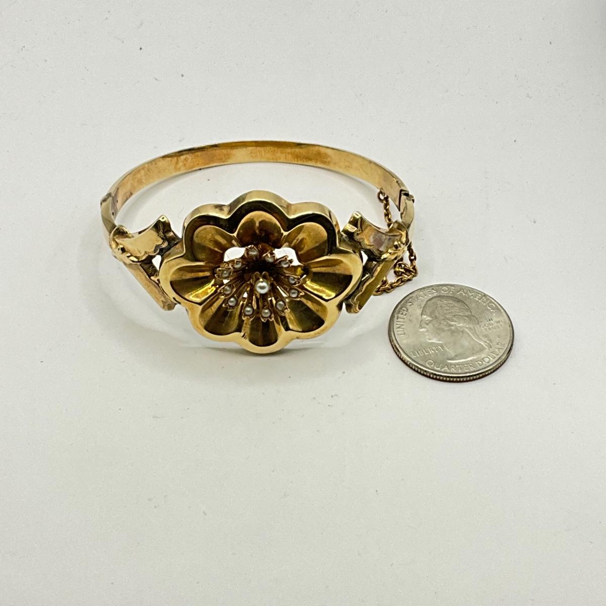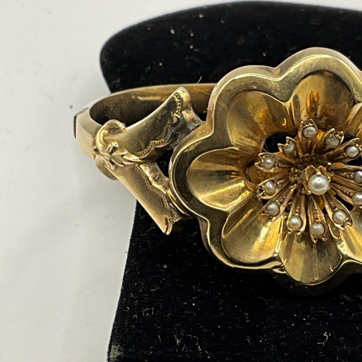 868 10k Yellow Gold Antique Seed Pearl Floral Hinged Bracelet