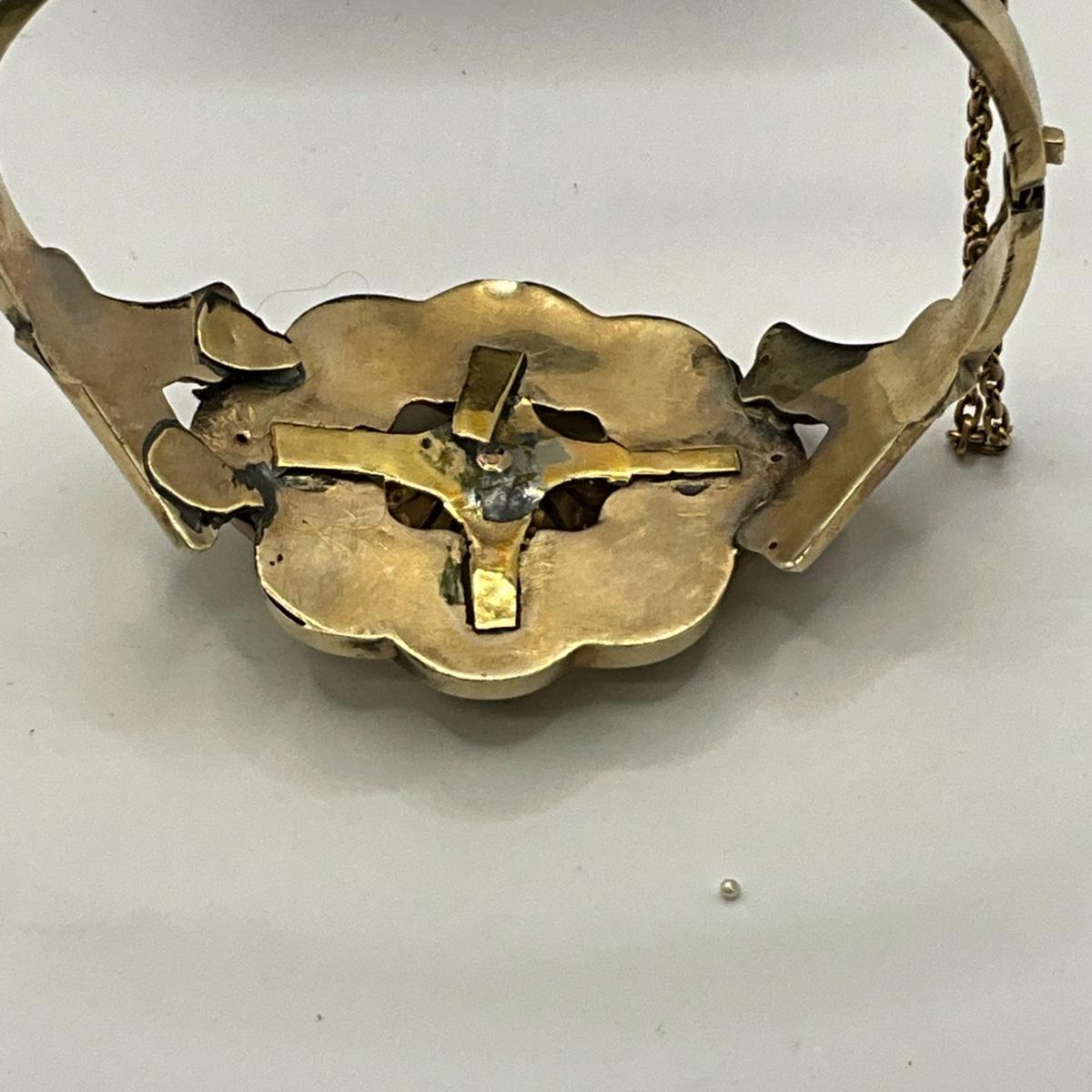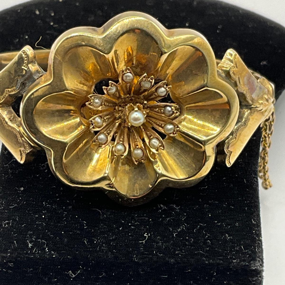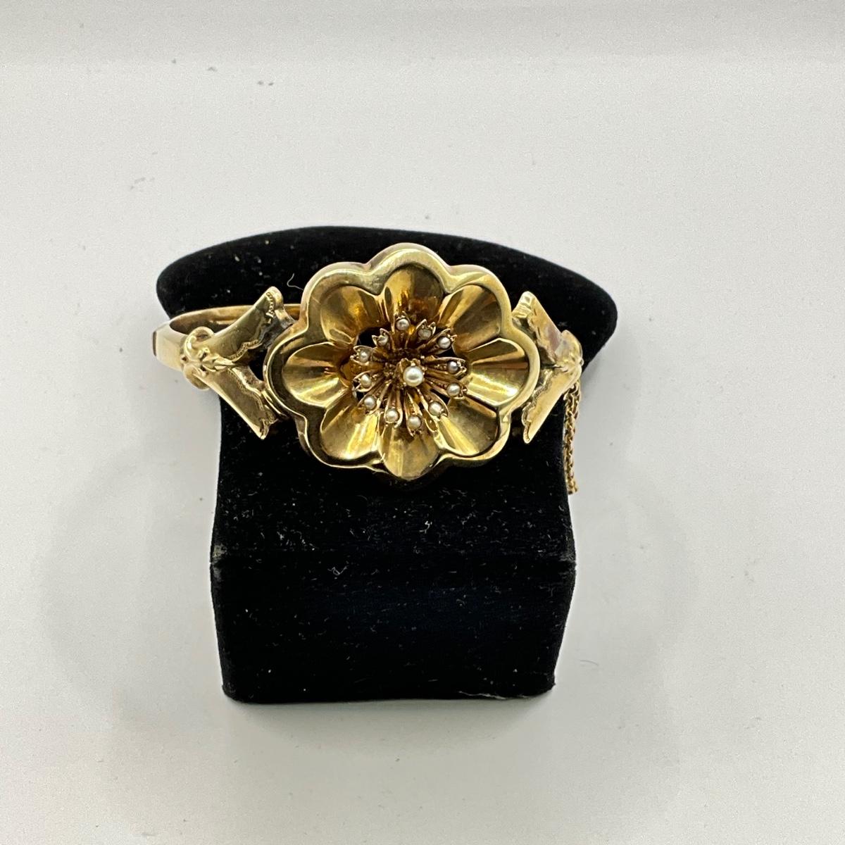 868 10k Yellow Gold Antique Seed Pearl Floral Hinged Bracelet