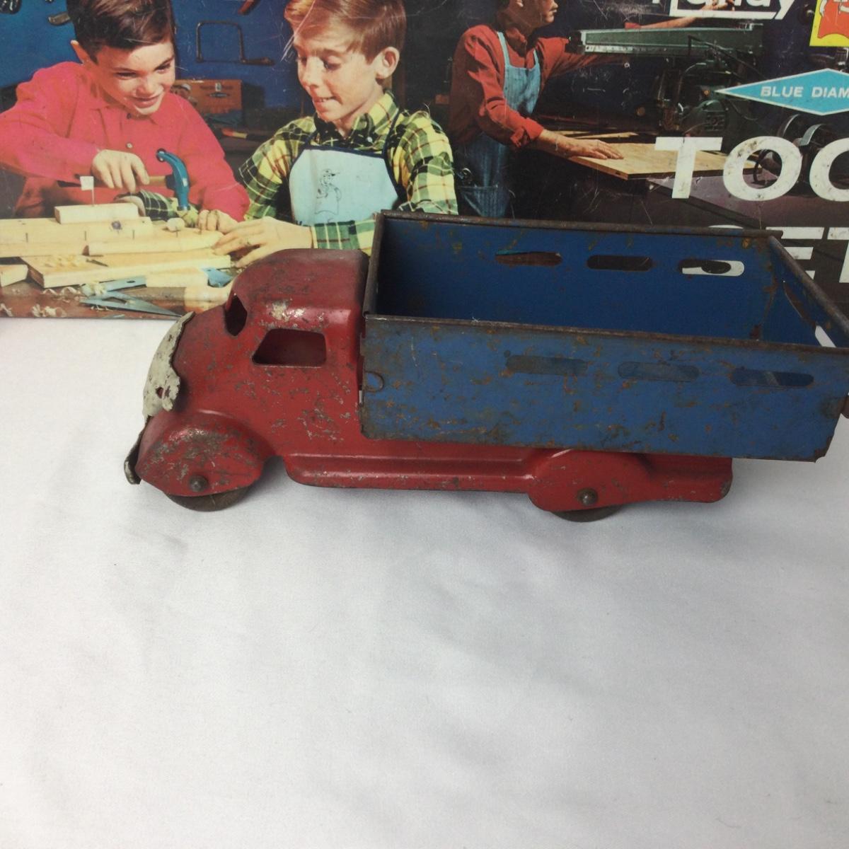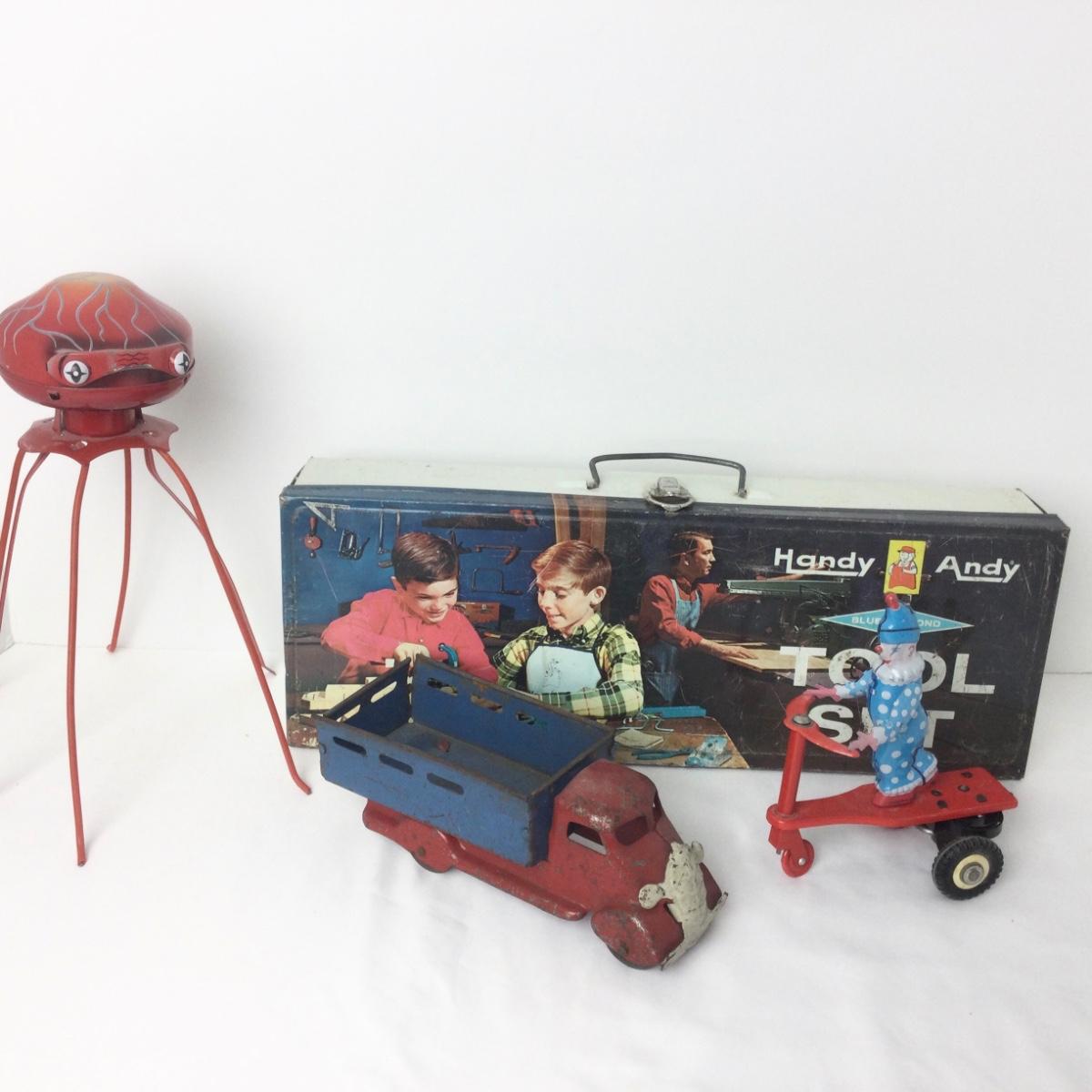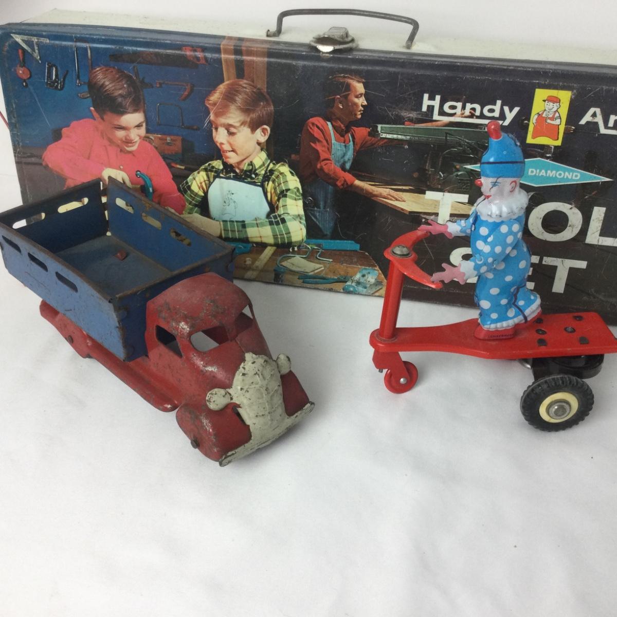 Lot contains “Handy Andy” metal tool box with no tools, tin clown on a bike, Schylling Alien and a 1940’s Pressed Metal dump truck.