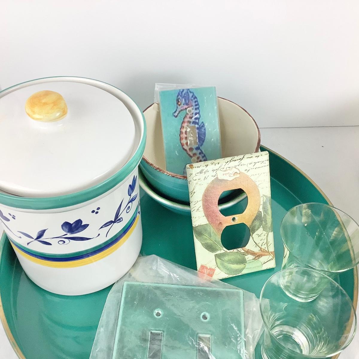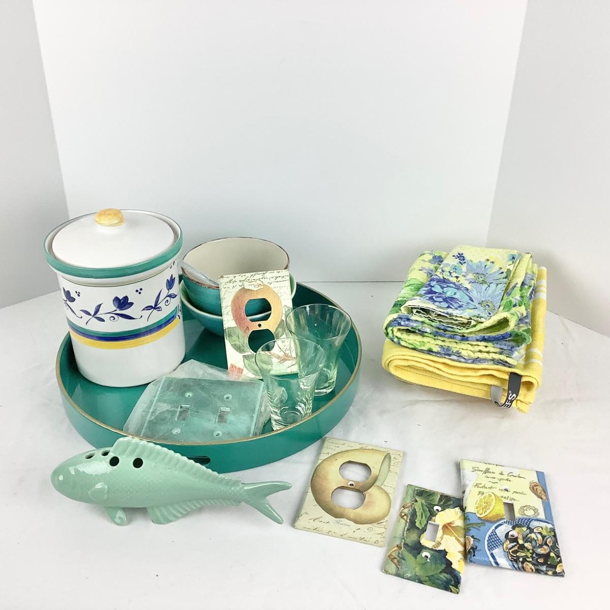 Canister, two bowls, ceramic koi fish, napkins, plate covers and round decorative tray