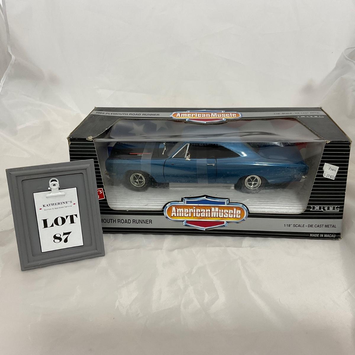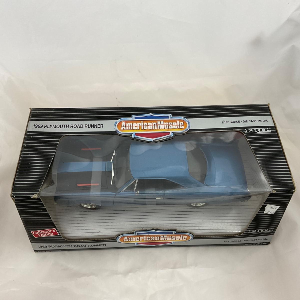 One die cast 1:18 scale 1969 Plymouth Road Runner in box. Please see photos for details and condition. ::: Shipping is available on this lot. If you require shipping you must let us know at the close of the auction. We will coordinate with you after the item has been won. Shipping fees will include insurance up to or exceeding the value of all items being mailed. If you have any questions regarding this lot please contact the auctioneer either via this website, by direct email or by phone. PICK UP TIMES and other important information can be found in the TERMS and DESCRIPTION of the auction. Please take a look for pertinent information. Thanks!